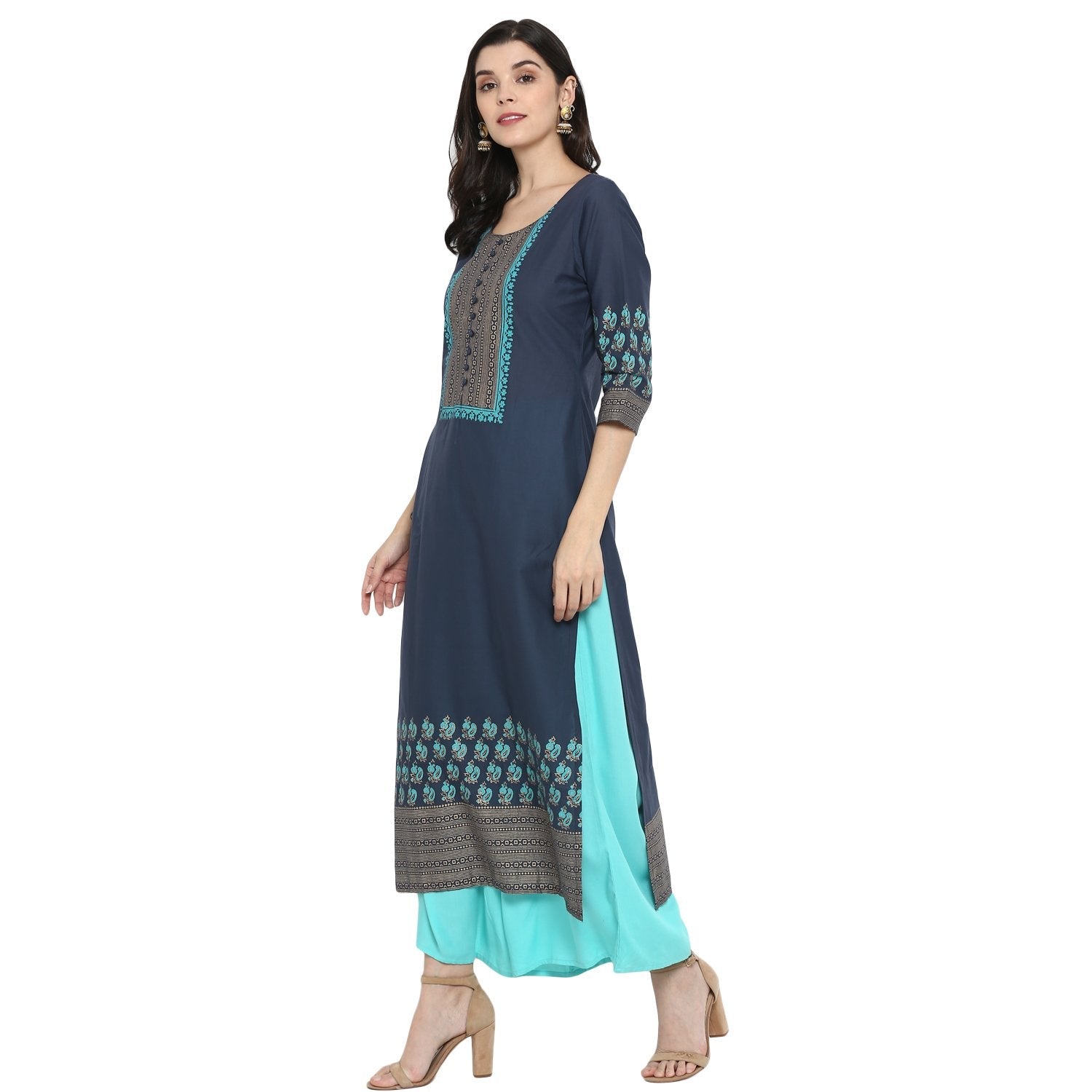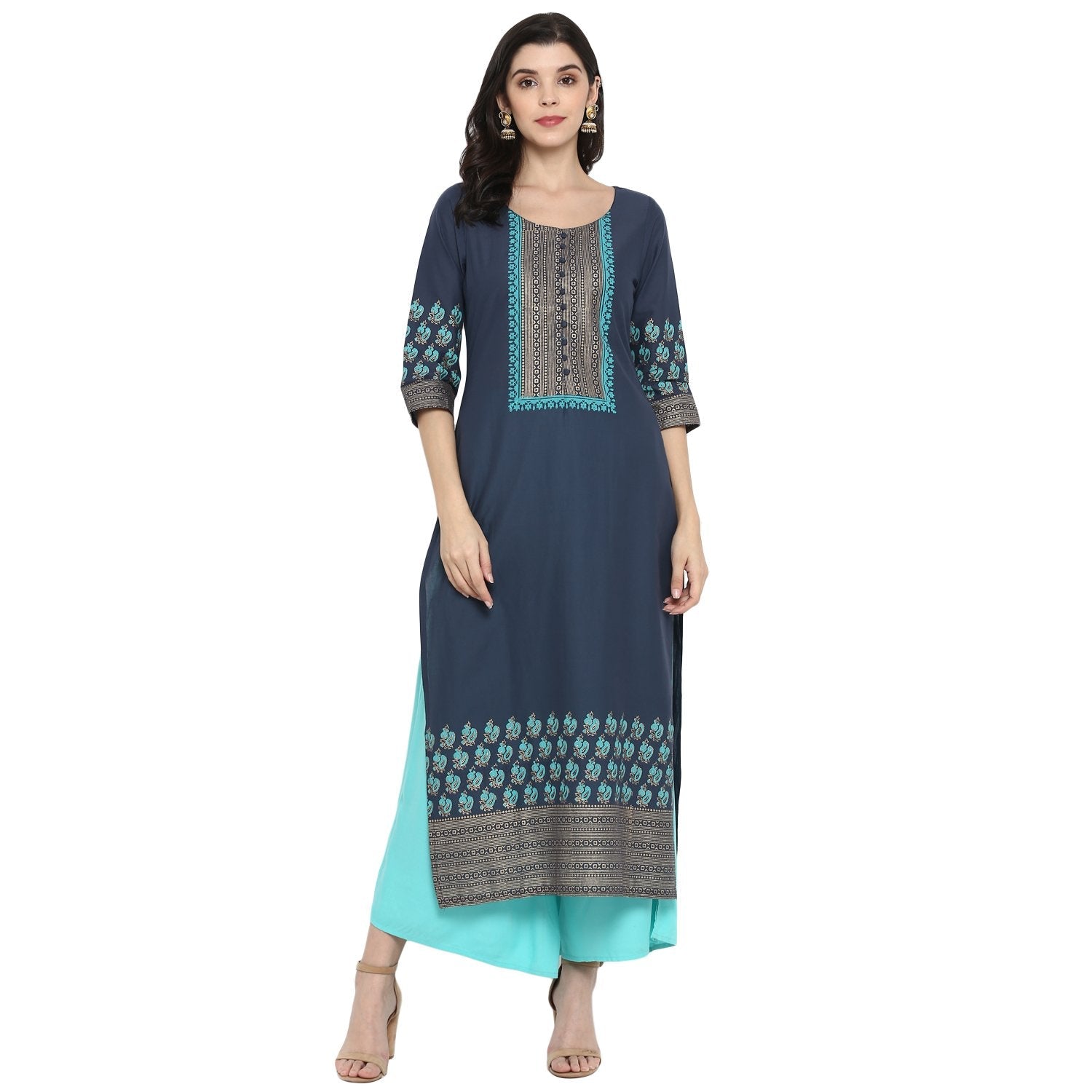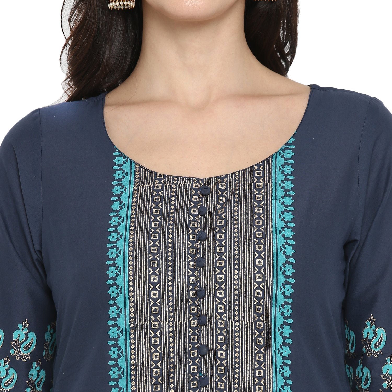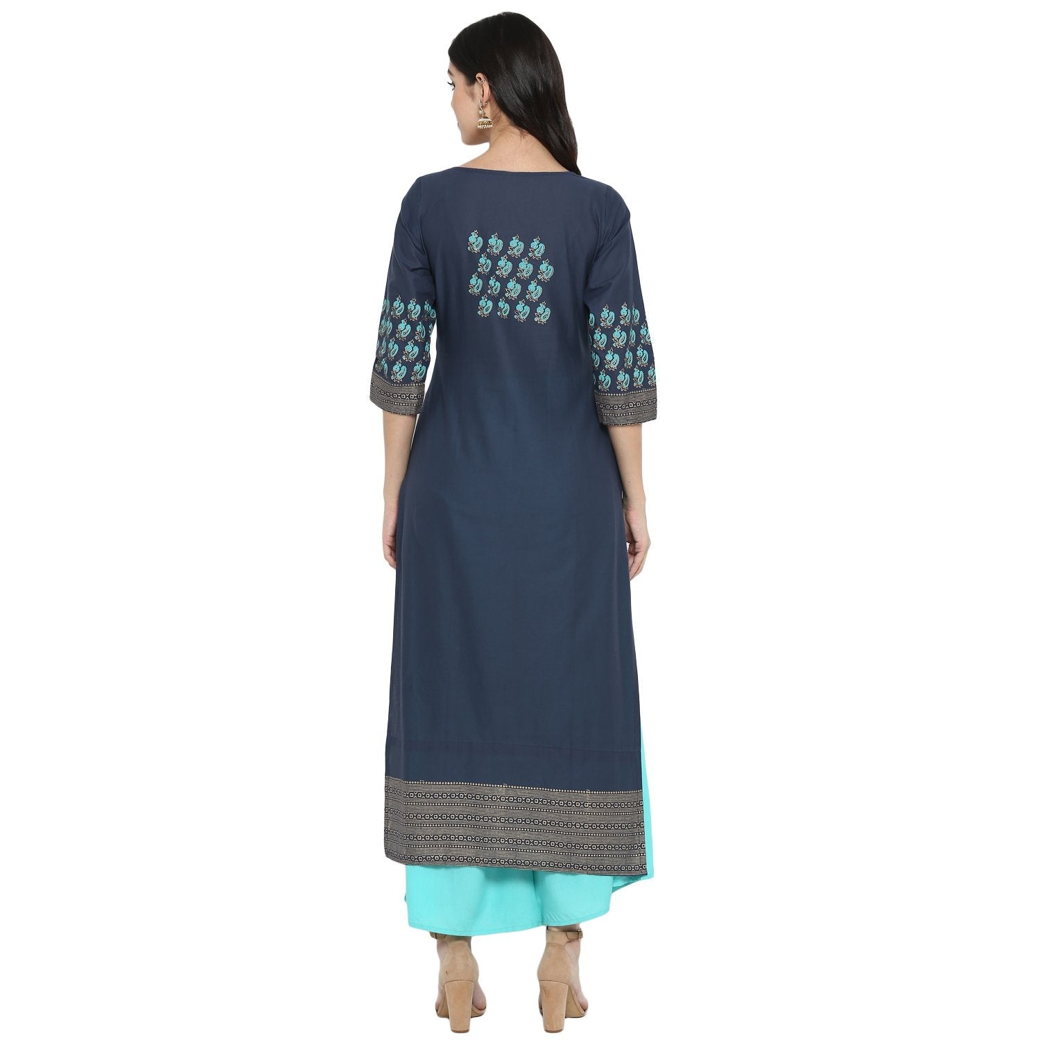 Women's Blue Cotton Printed Straight Kurti With Block Print (1 Pc)