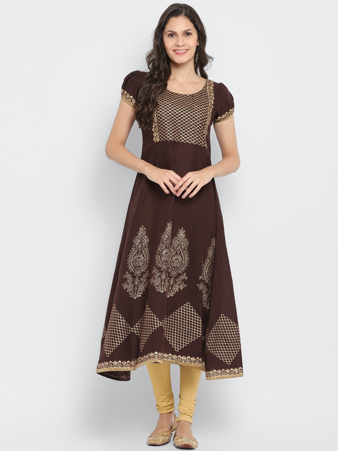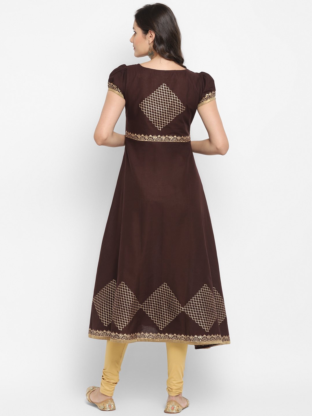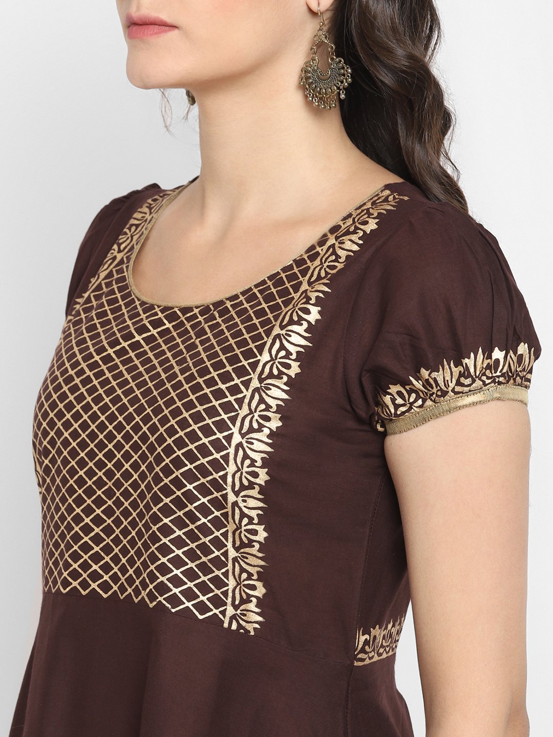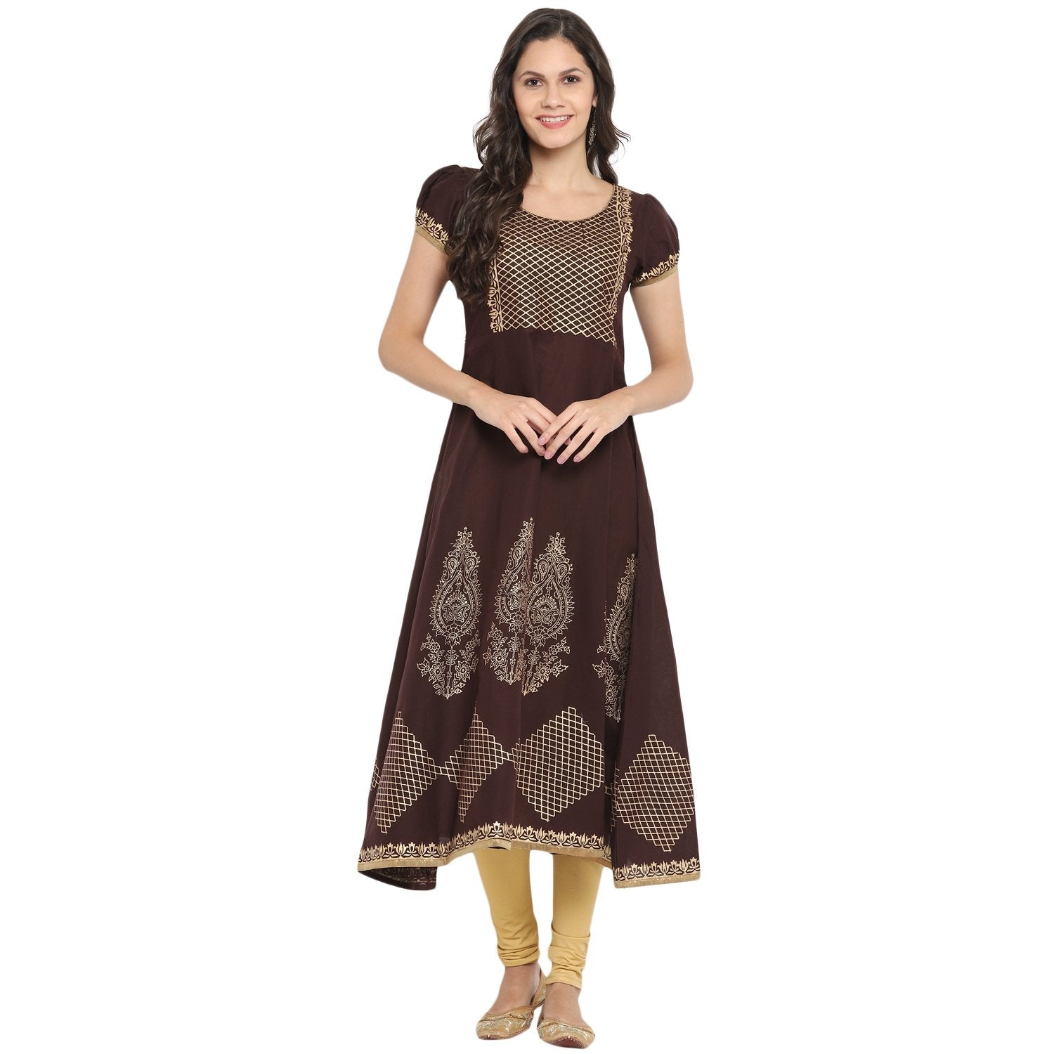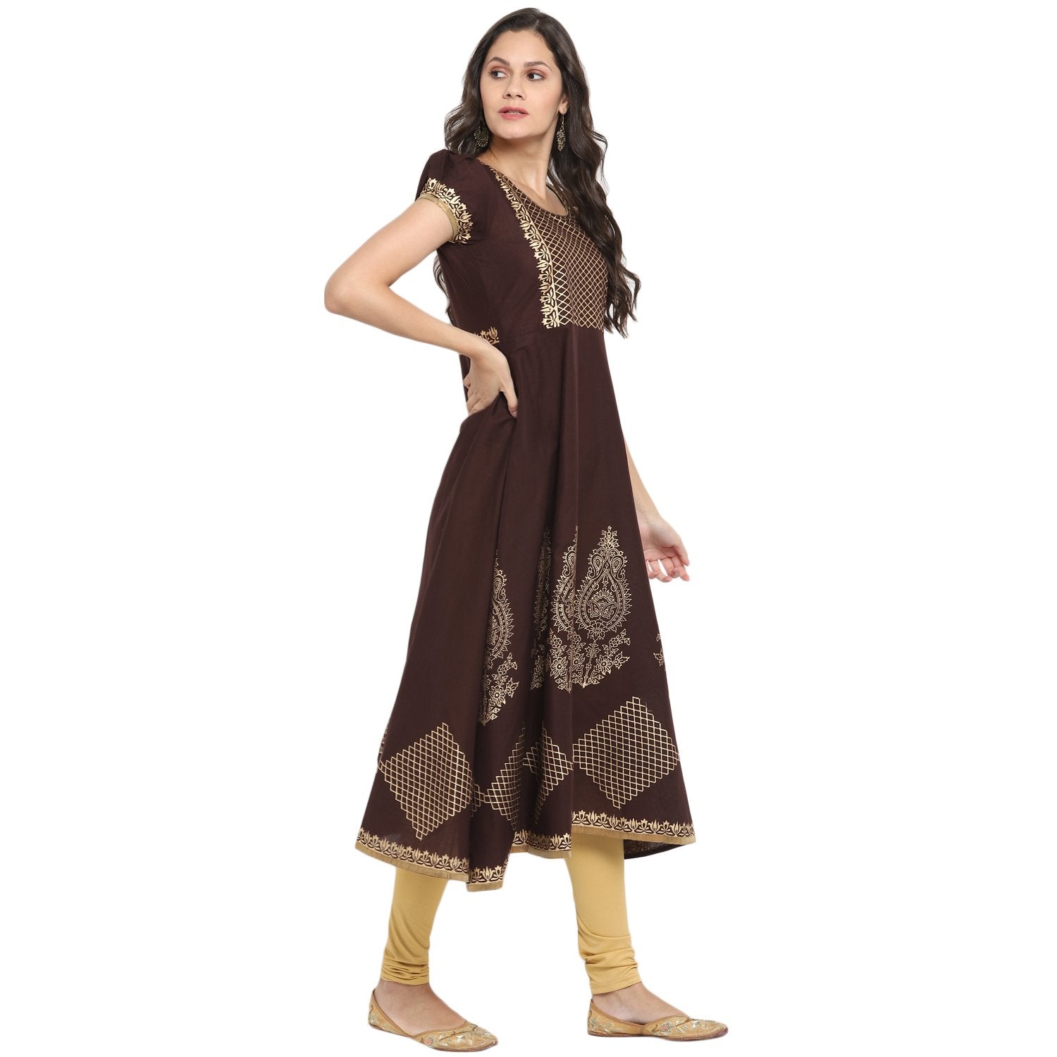 Women's Brown & Golden Cotton Printed Anarkali Kurti With Block Print (1 Pc)