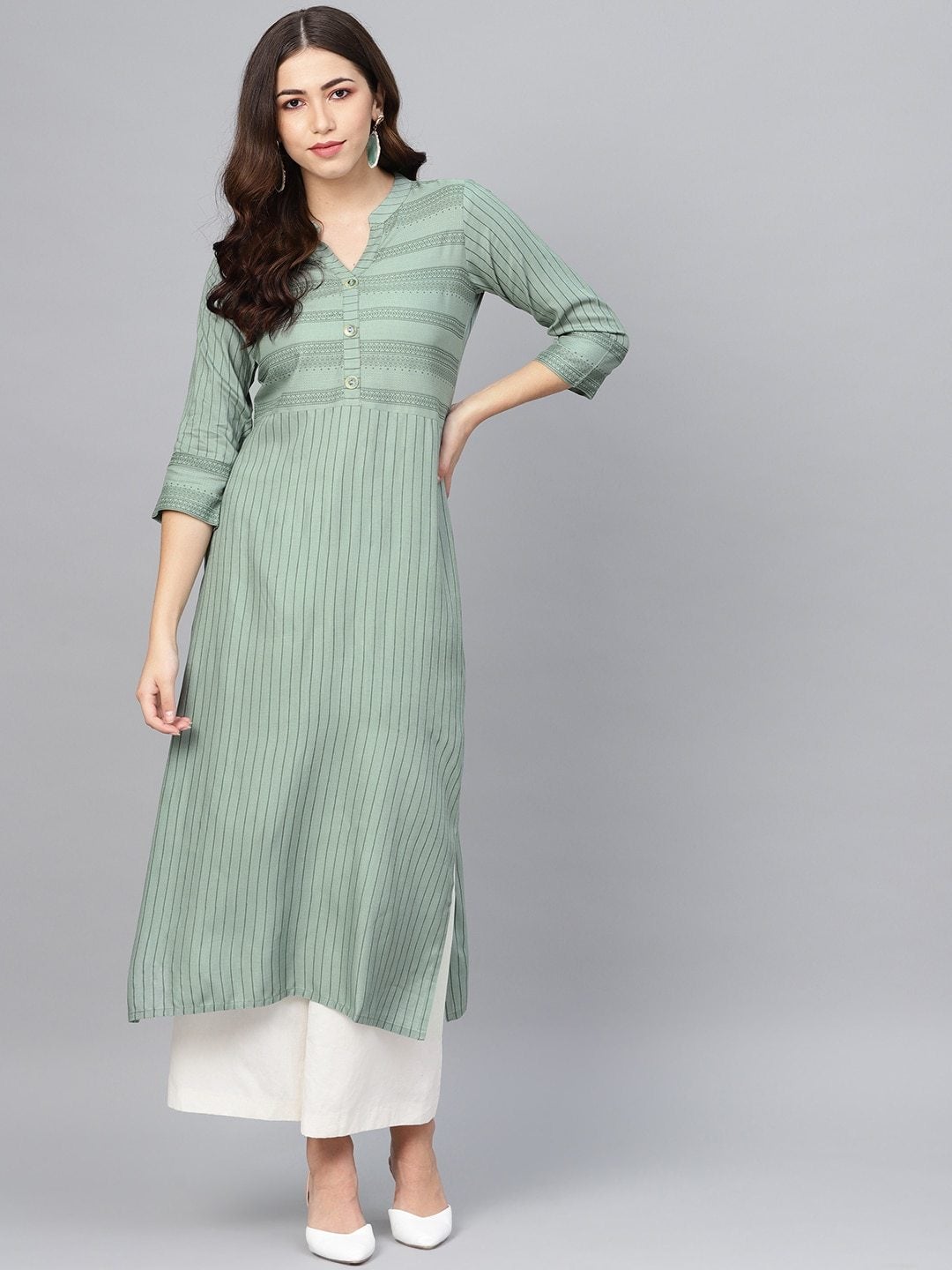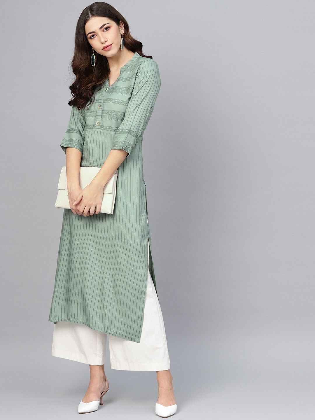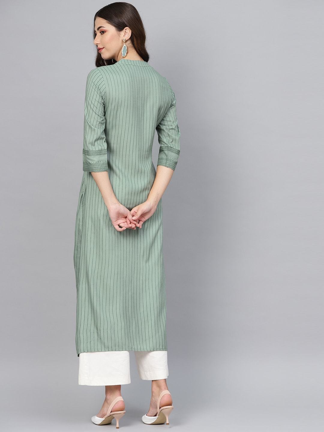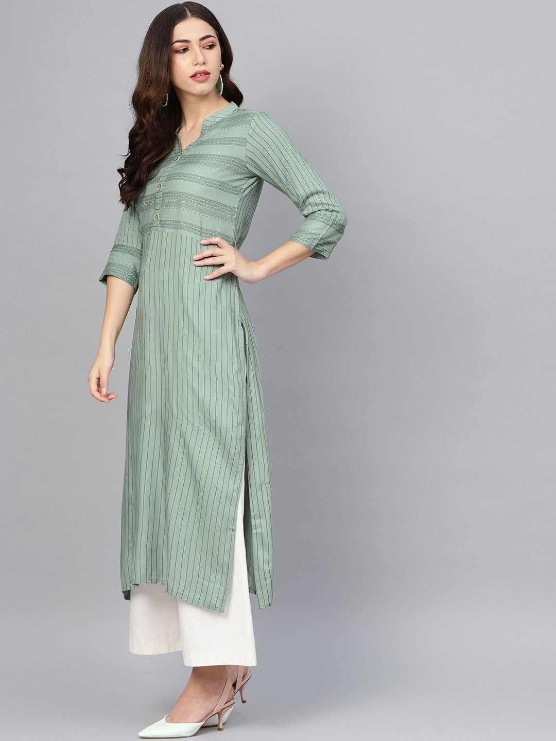 Product Details :Green striped straight kurta, has a mandarin collar, three-quarter sleeves, straight hem, and side slits styleNote :Make a statement with this elegant kurta from Meeranshi. Dress up for your next family event by pairing this green piece with your best Kolhapuris and simple jewellery. materialCareDescription :Viscose Rayon