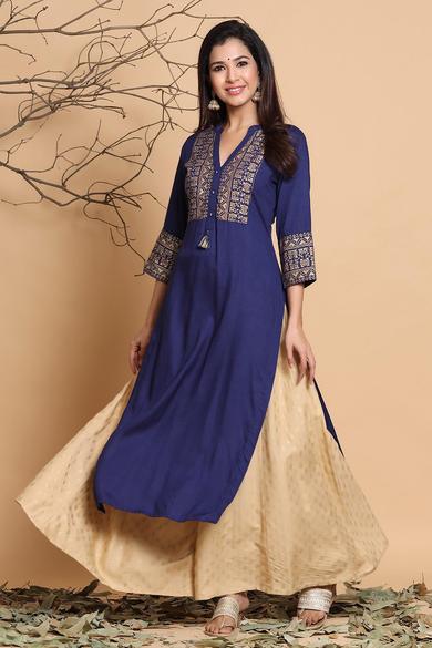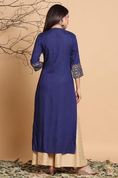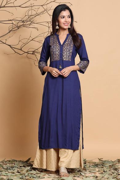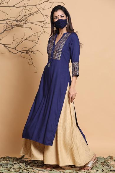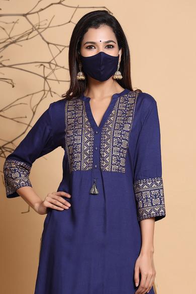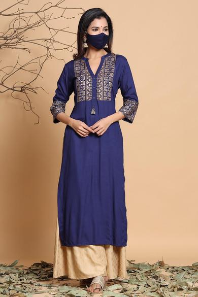 Description :Juniper Indigo Rayon Printed Straight Kurta With MaskColor :INDIGOFabric :RayonPrint :PrintedPrint & Pattern Type :Ethnic MotifsHemline :StraightSleeve Length (Inches) :16Sleeve :Three-Quarter SleevesSleeve Styling :Regular SleevesLength type :Calf LengthLength (Inches) :46Neck :Mandarin CollarShape :StraightOrnamentation :TasselSurface styling :TasselsClosure :ButtonsMaterial Transperency :OpaqueOccasion :FusionWash care :Hand Wash