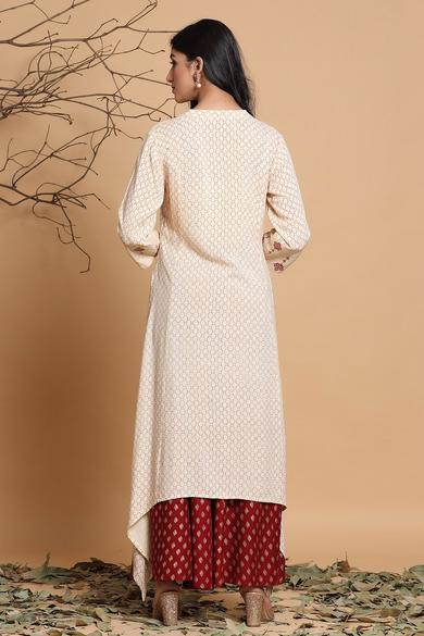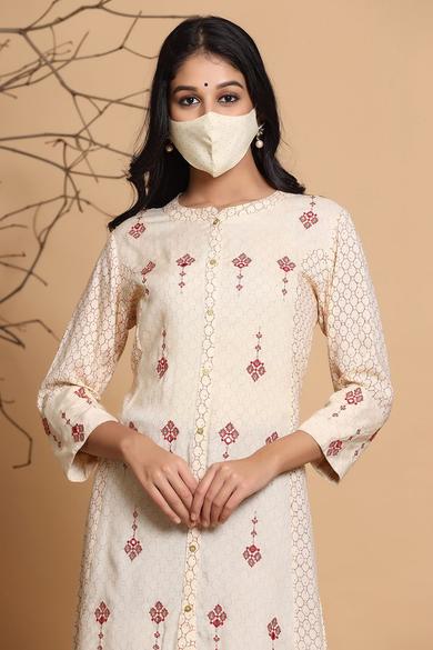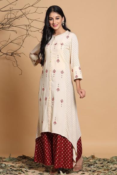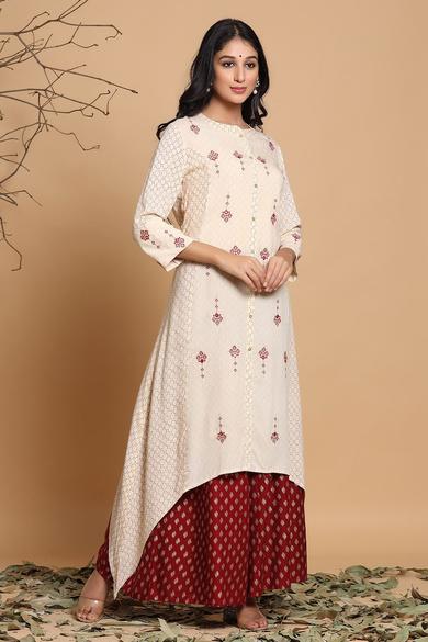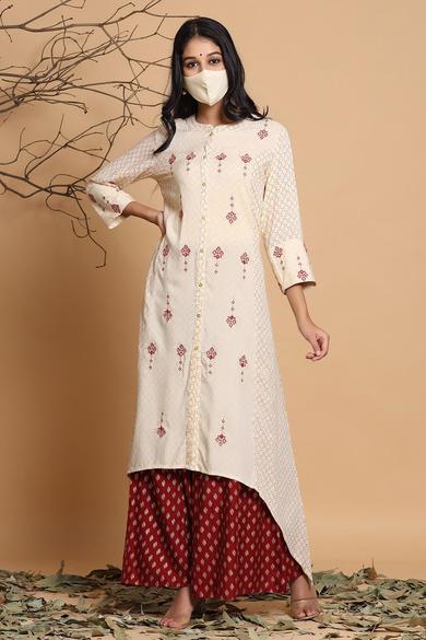 Description :Juniper Ivory Rayon Printed Asymmetric Kurta With MaskColor :IVORYFabric :RayonPrint :PrintedPrint & Pattern Type :Ethnic MotifsHemline :AsymmetricSleeve Length (Inches) :16Sleeve :Three-Quarter SleevesSleeve Styling :Regular SleevesLength type :Calf LengthLength (Inches) :44Neck :Mandarin CollarShape :AsymmetricOrnamentation :Mirror WorkSurface styling :NAClosure :ButtonsMaterial Transperency :OpaqueOccasion :FusionWash care :Hand Wash
