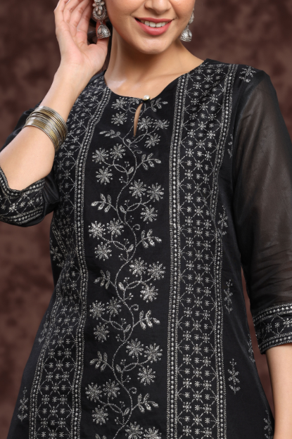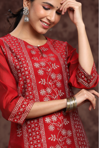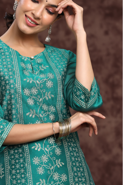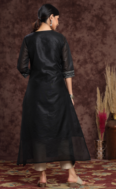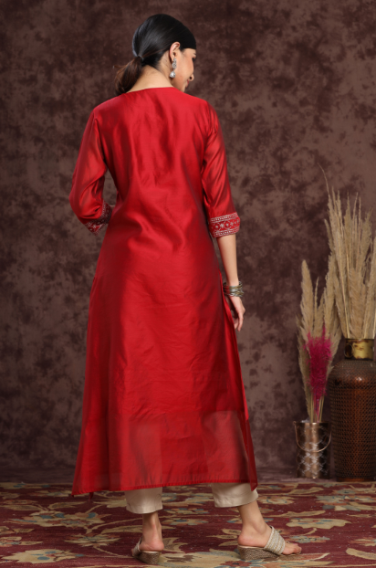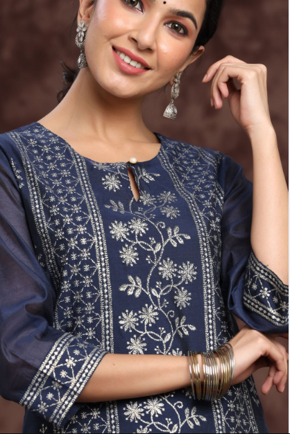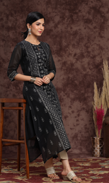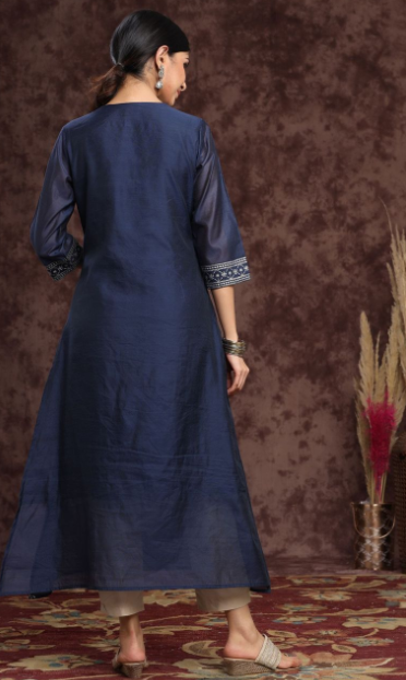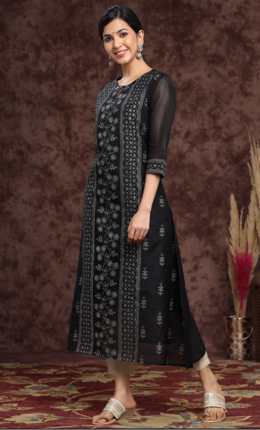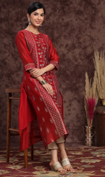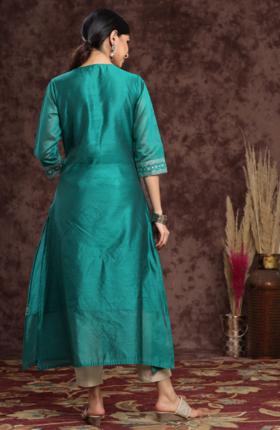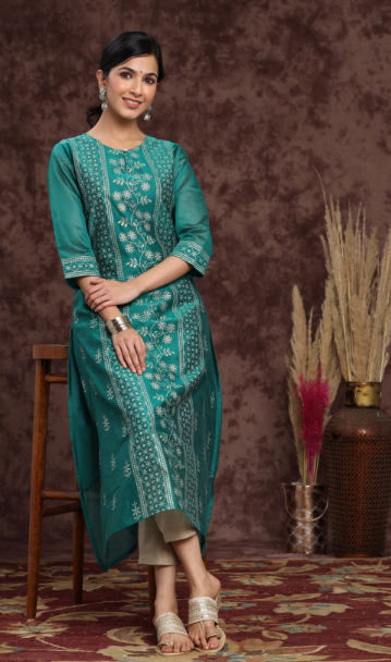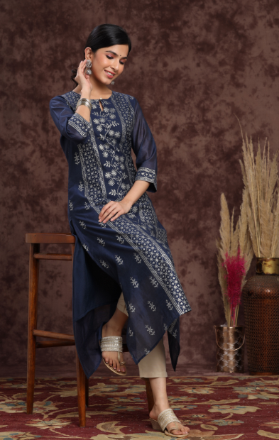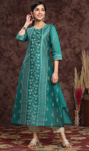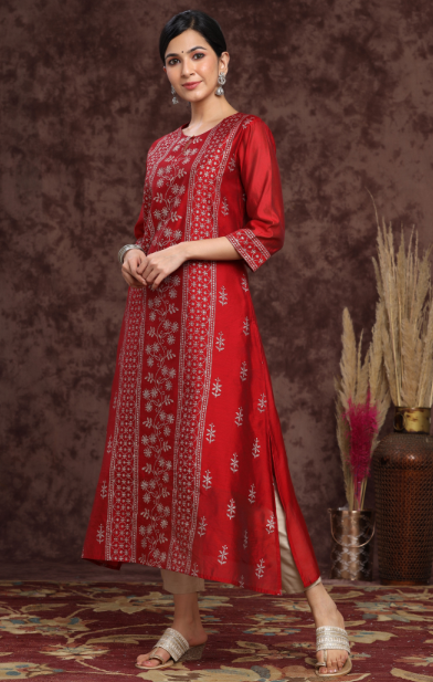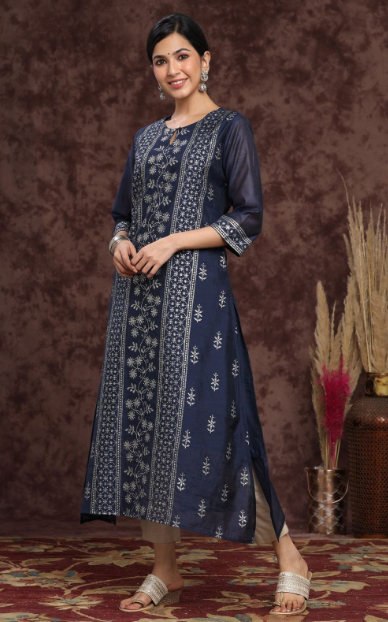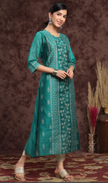 DESCRIPTION :Juniper Modal Chanderi Printed Straight Kurta Fabric :Chanderi Pattern :Print Fit :Straight Fit Neck/Collar :Keyhole neck Sleeve :3/4th sleeves Shape :Straight Length :Calf Length Occasion :Ethnic Wear Wash Care :Hand Wash