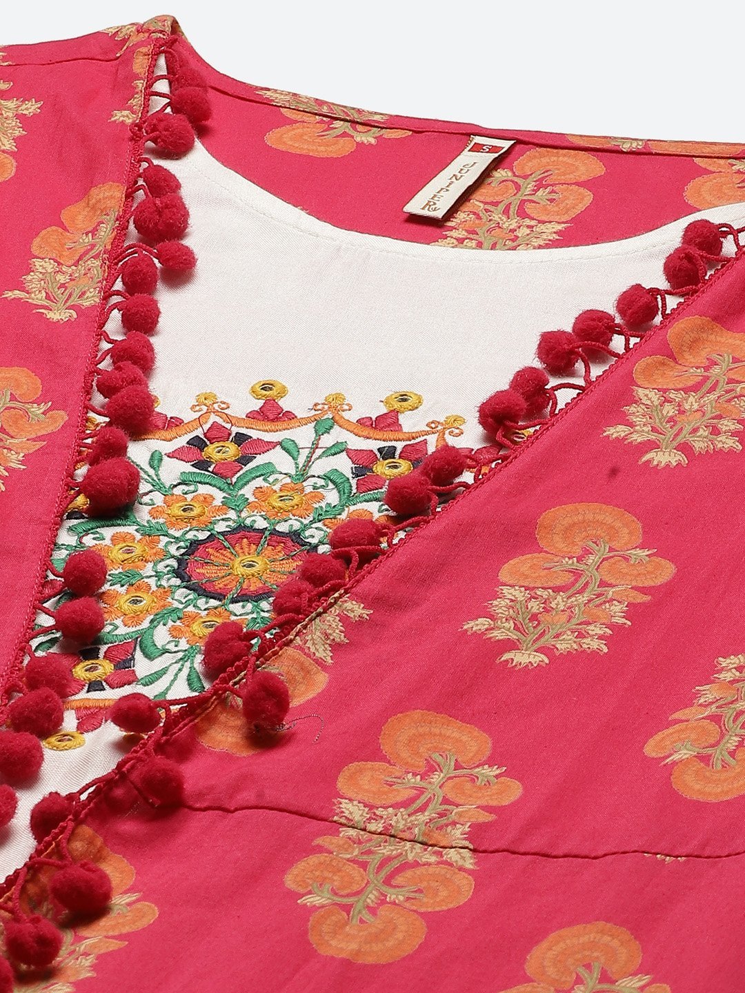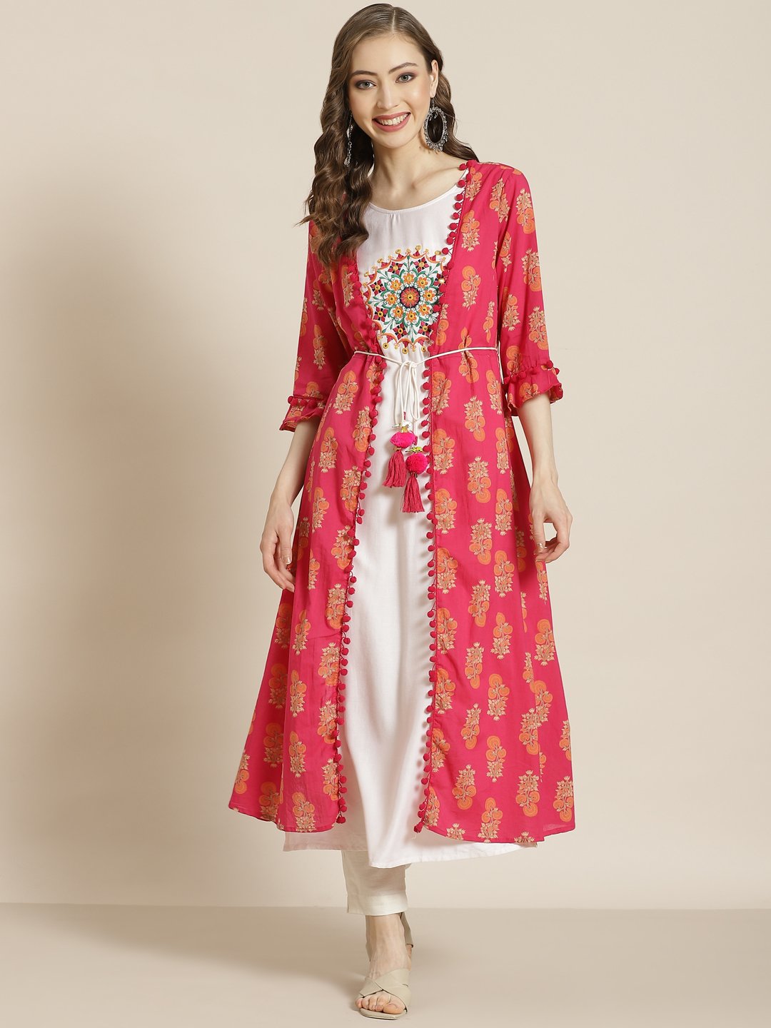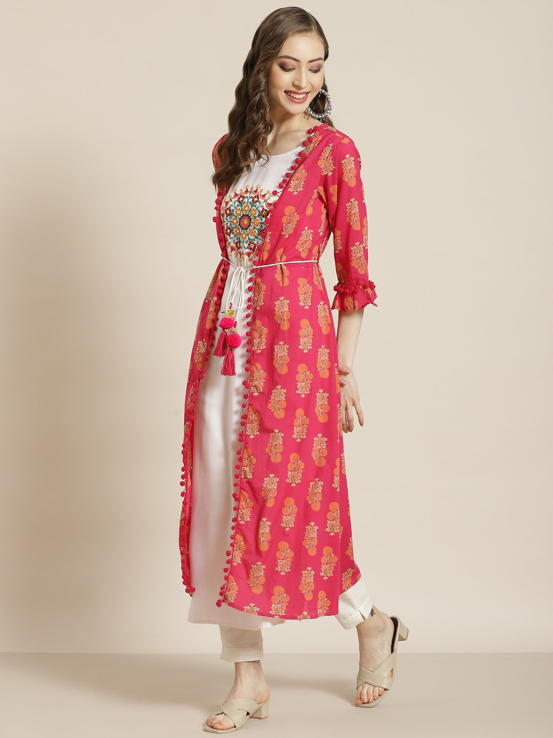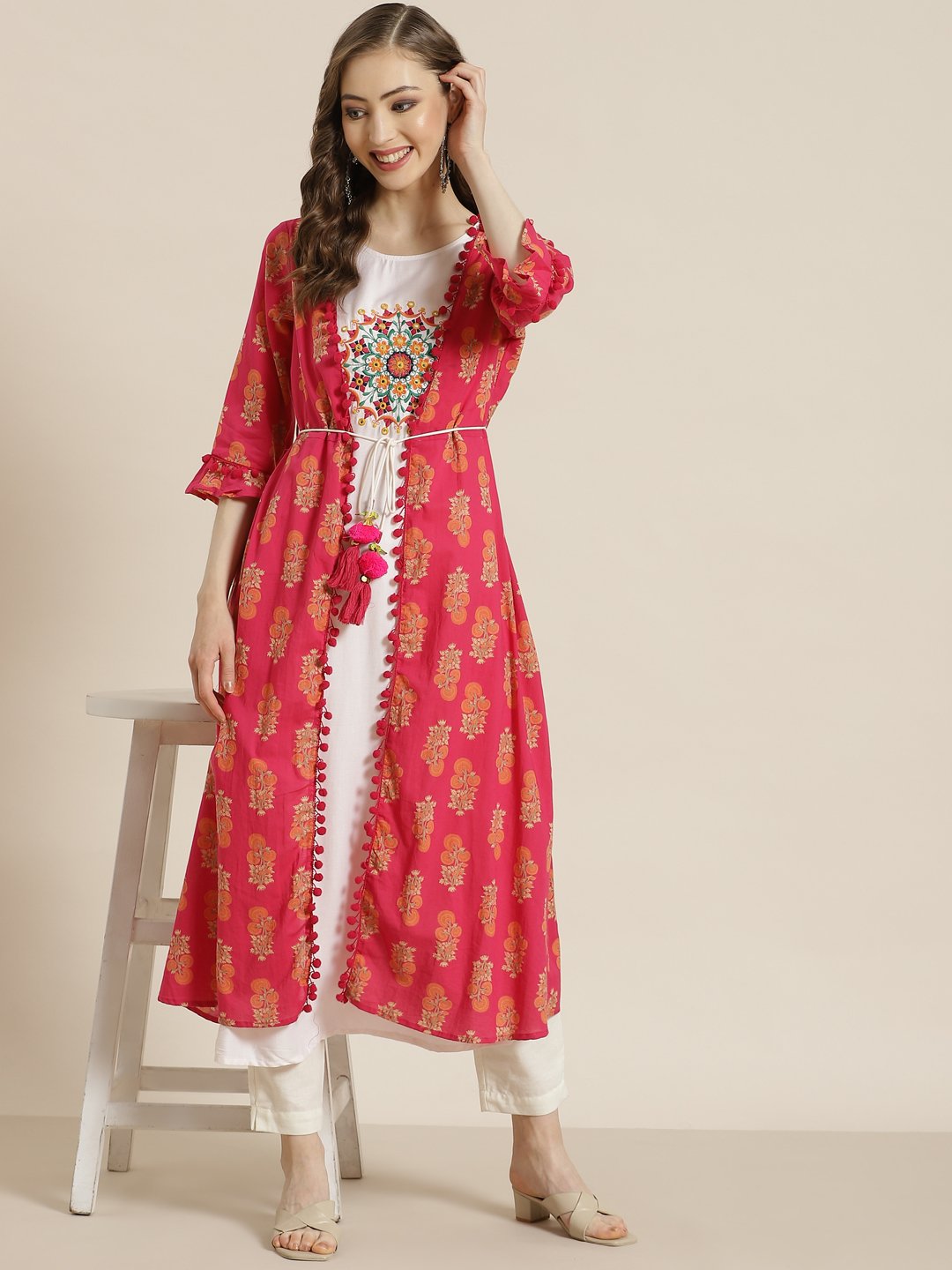 PRODUCT DESCRIPTION :Juniper Fuschia Rayon & Cambric Floral Print Jacket Style Kurta with Yoke Embroidery & Tie-up