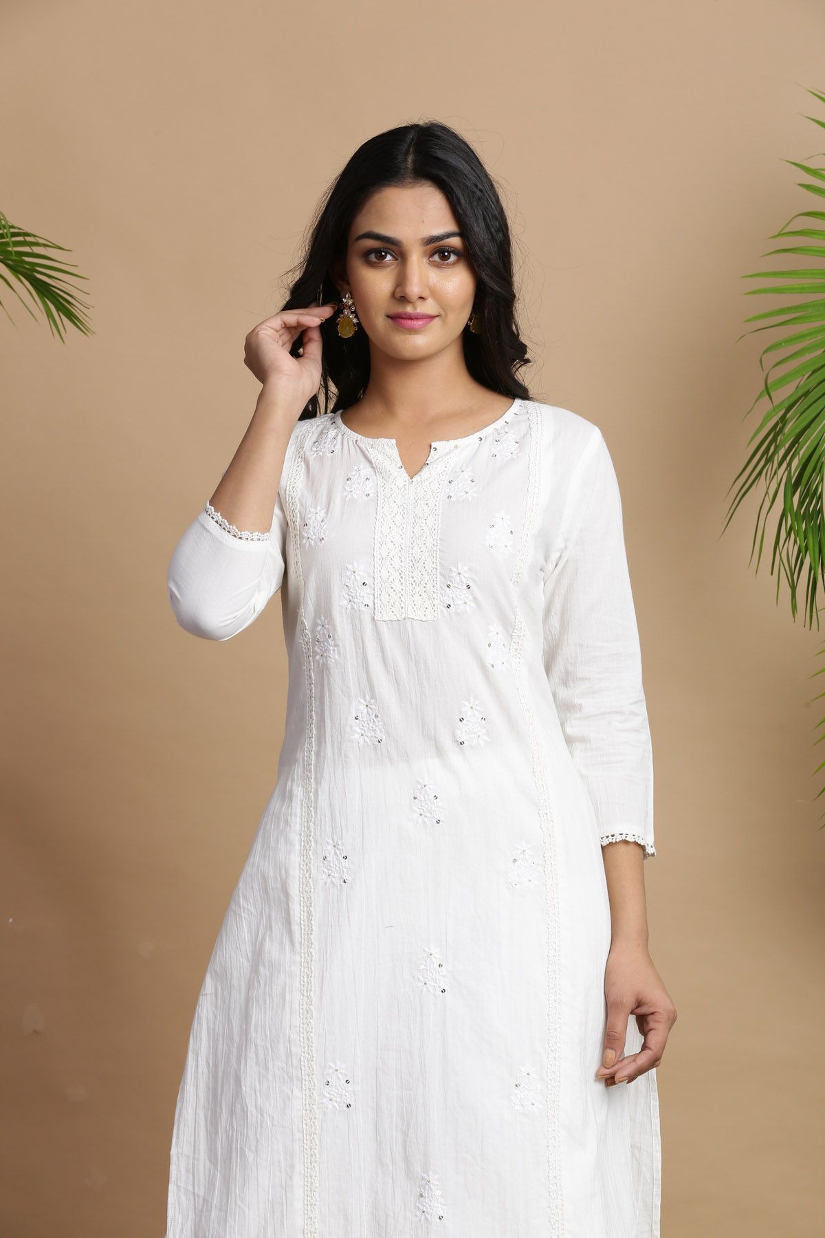 Women's Offwhite Cotton Voile Embroidered Straight Kurta