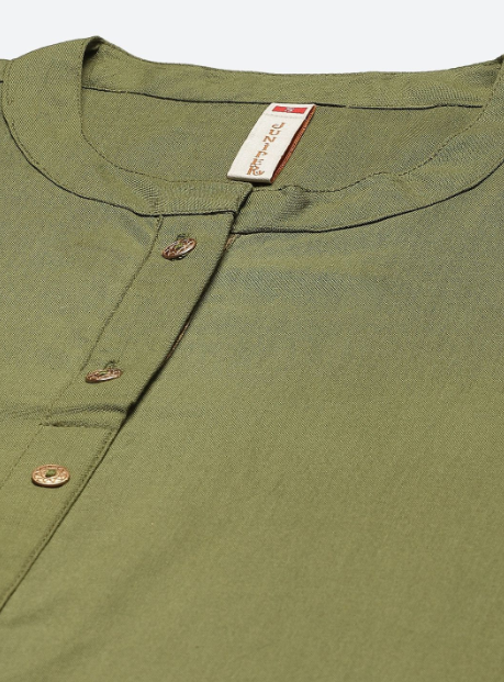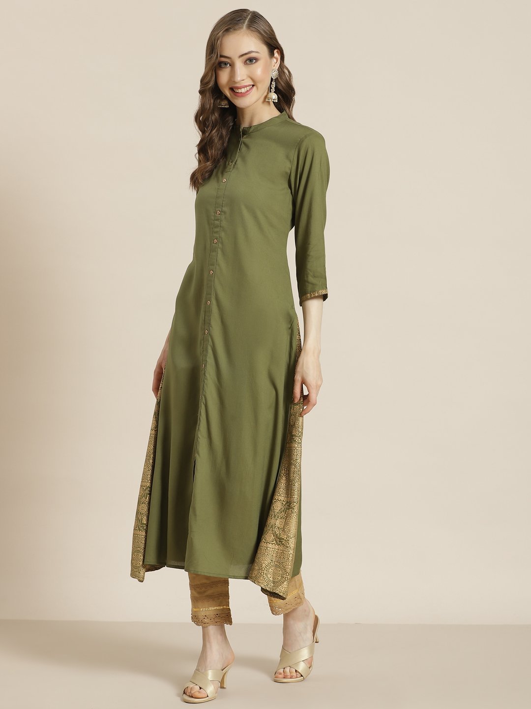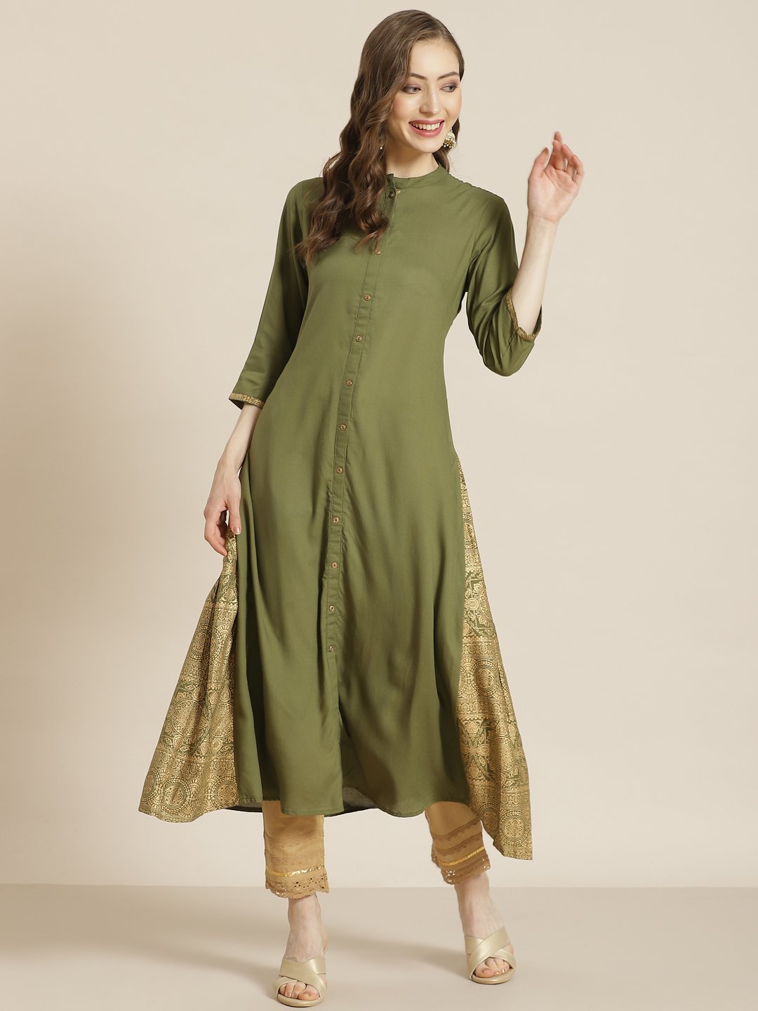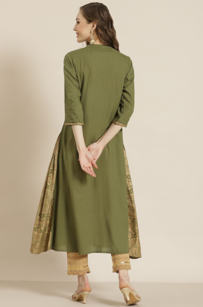 PRODUCT DESCRIPTION :Juniper Olive Rayon Gold Foil Print Panelled A-Line Kurta