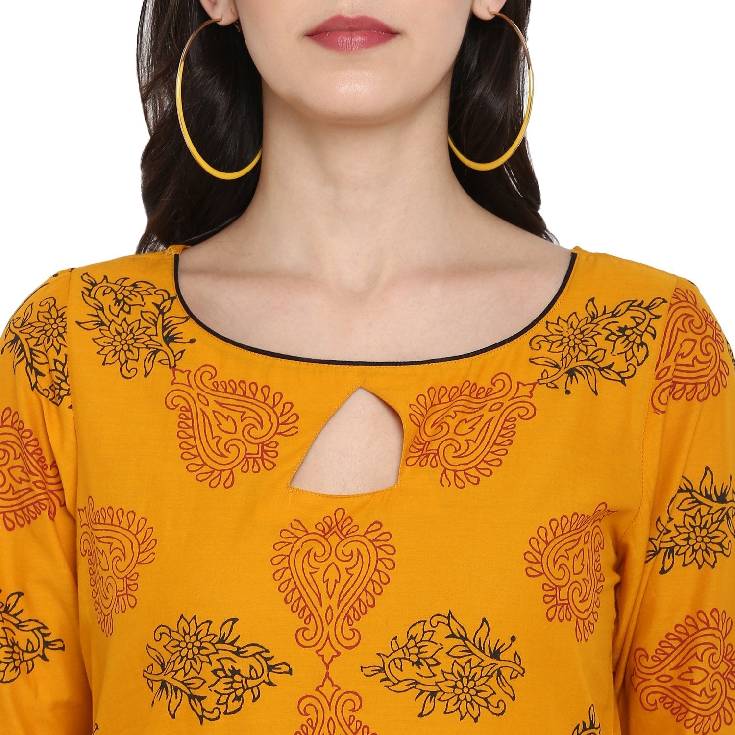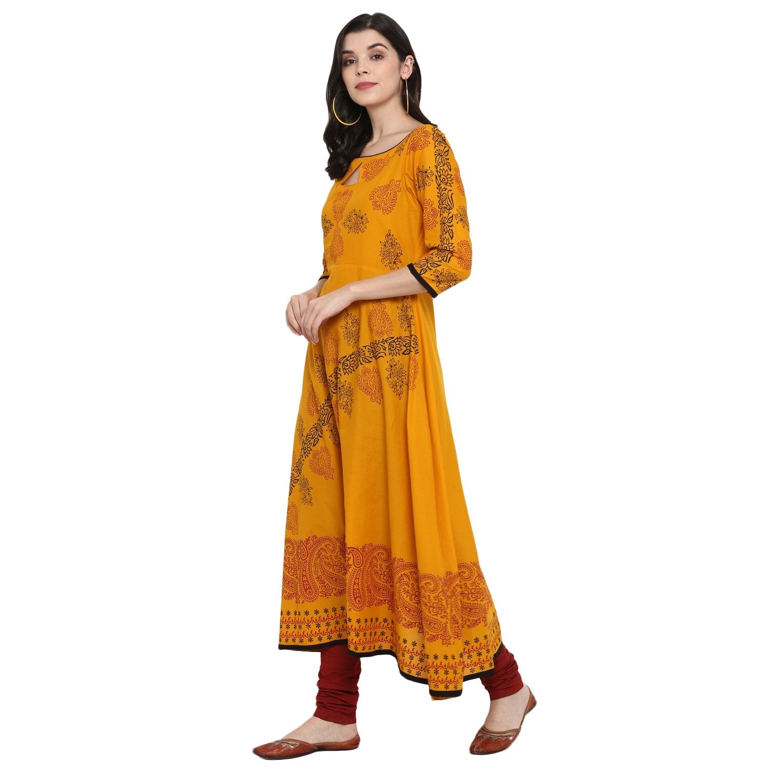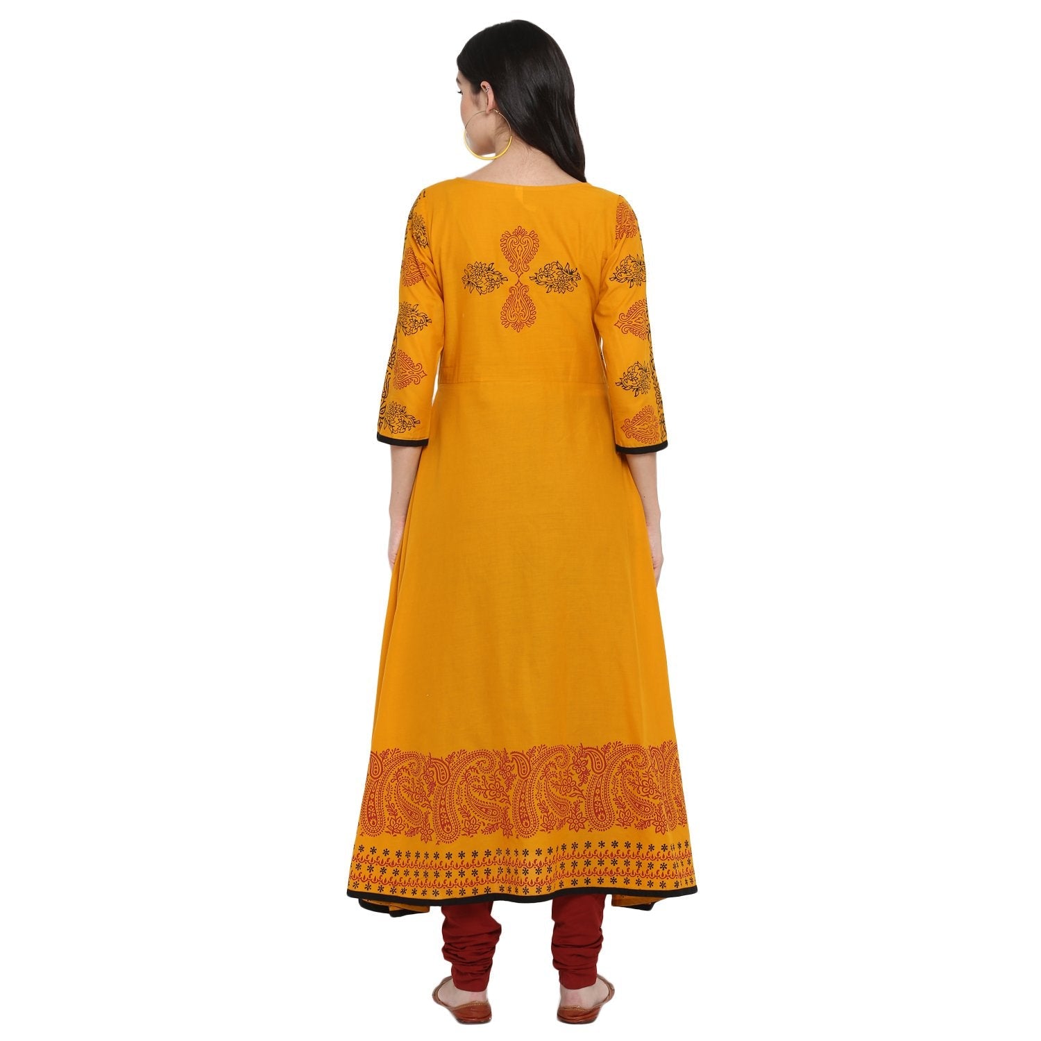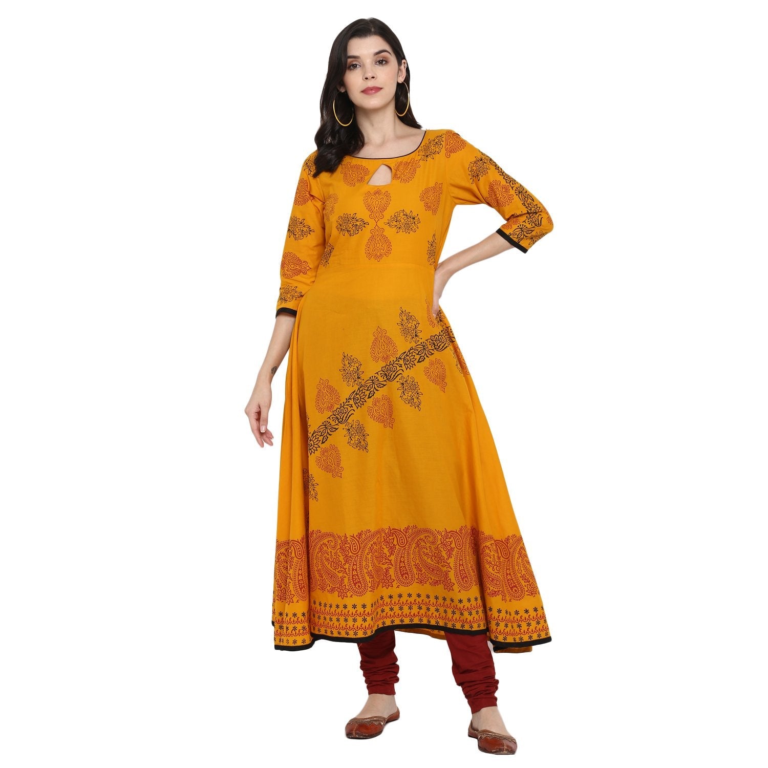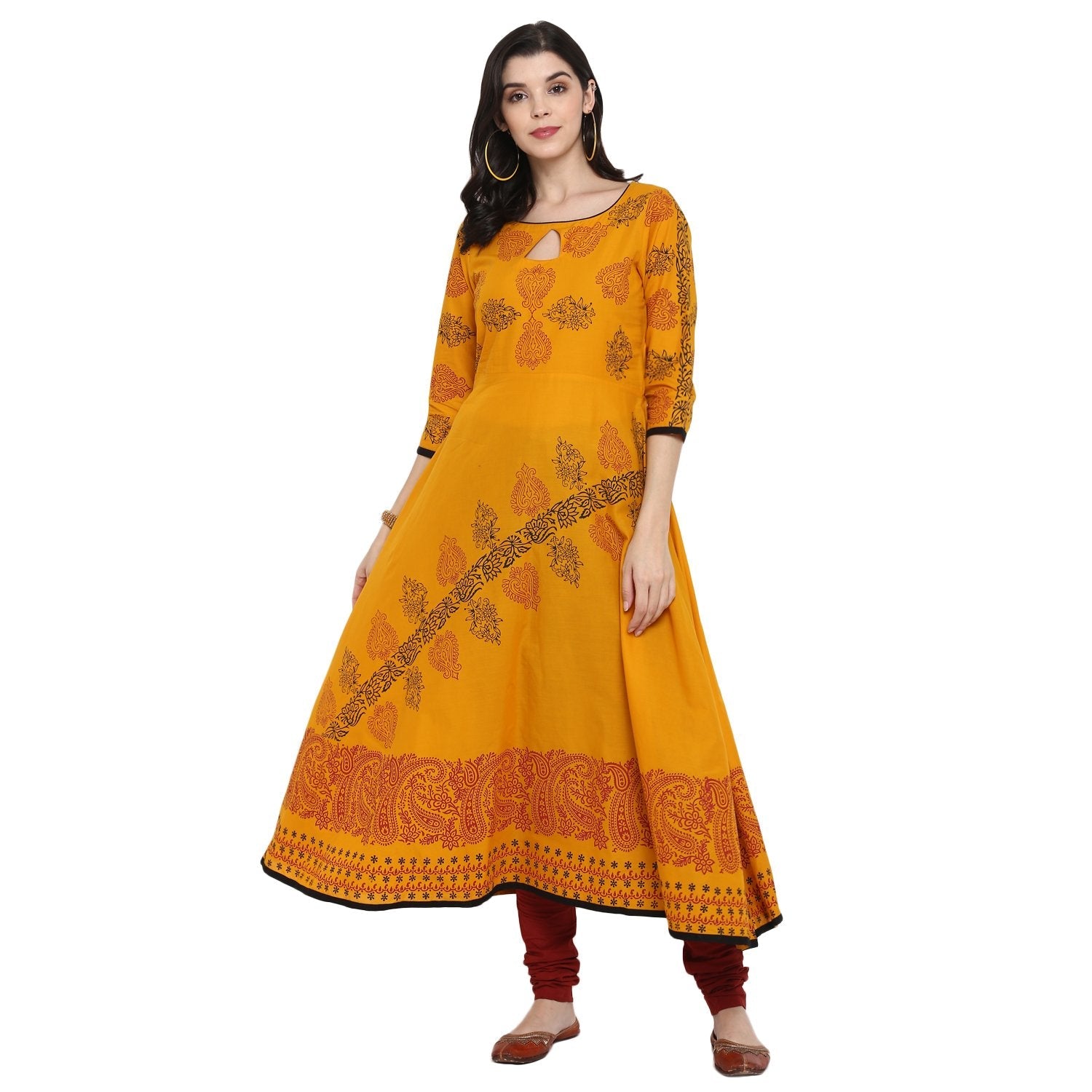 Women's Mustard Cotton Printed Anarkali Kurti With Block Print (1 Pc)