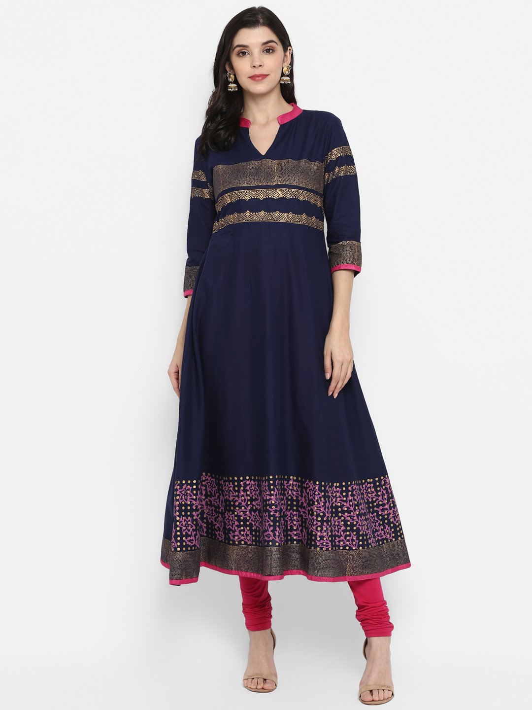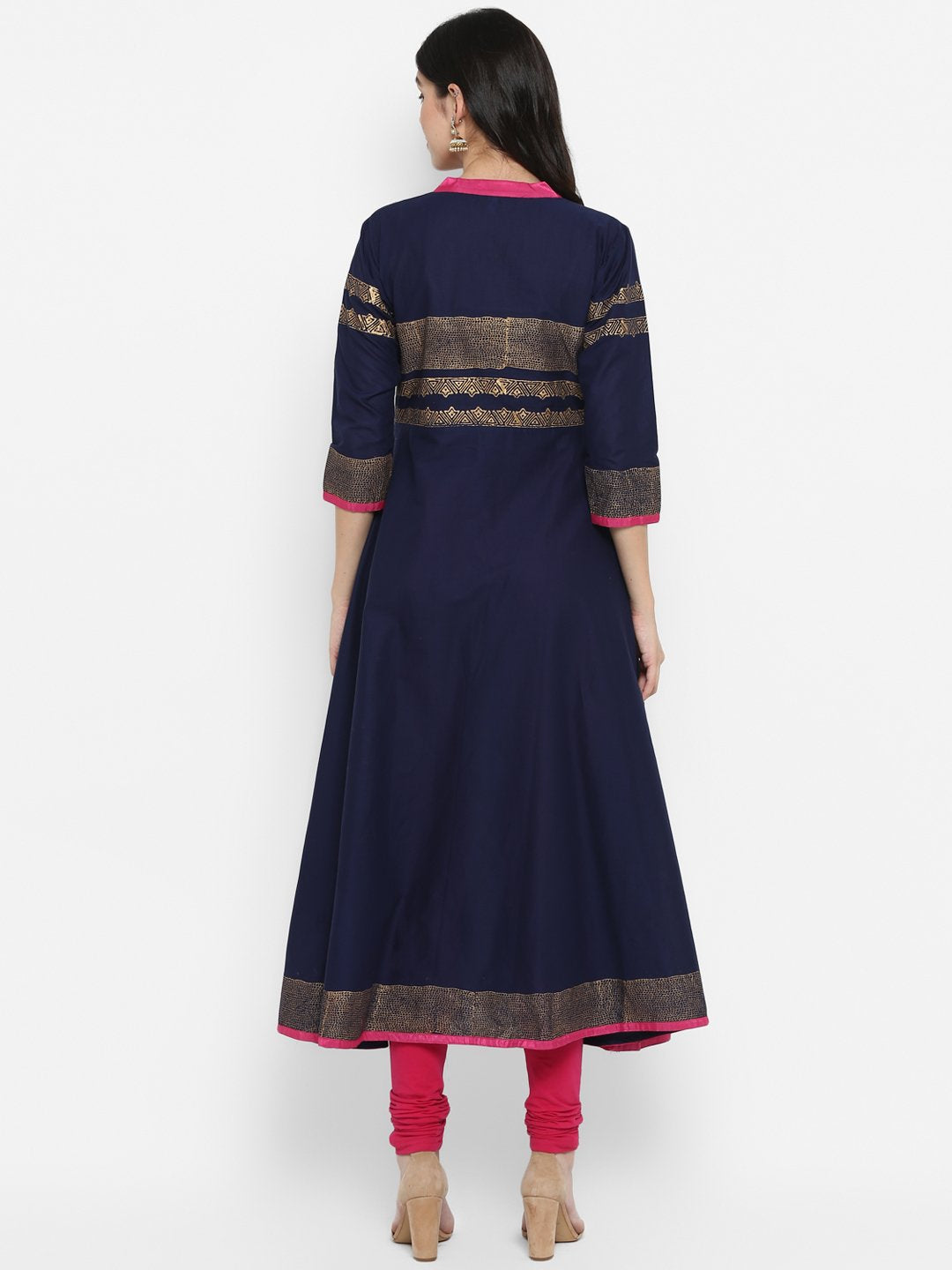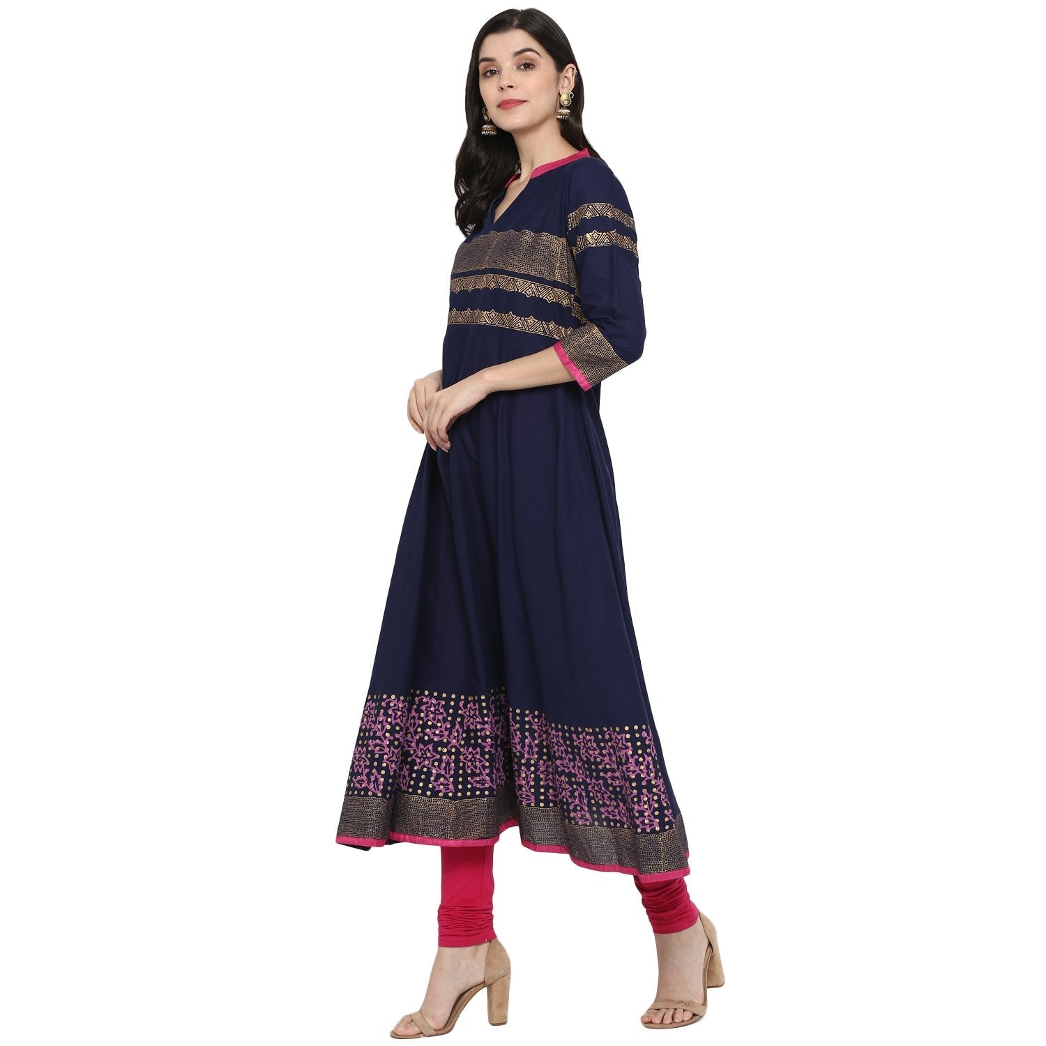 Women's Navy Blue Cotton Printed Anarkali Kurti With Block Print (1 Pc)
