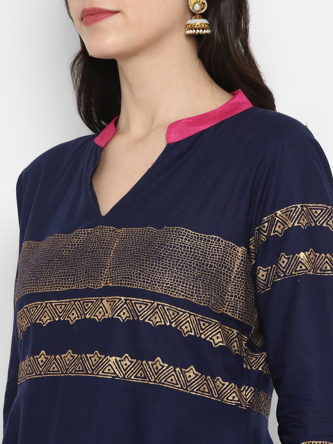 Navy Blue Cotton Printed Straight Kurti With Block Print