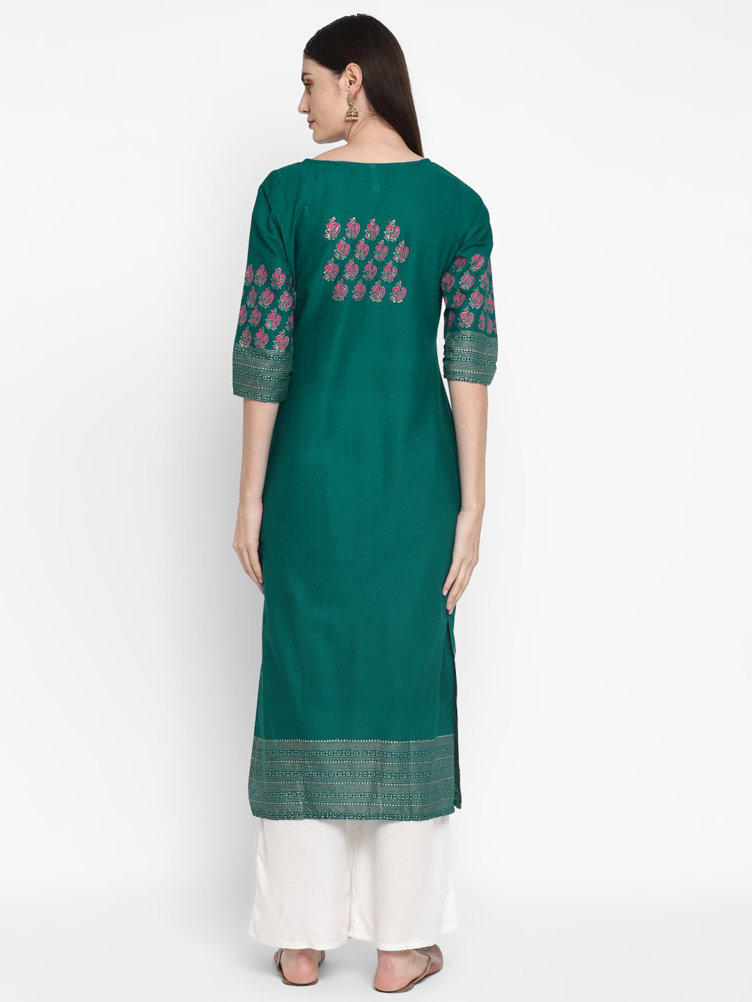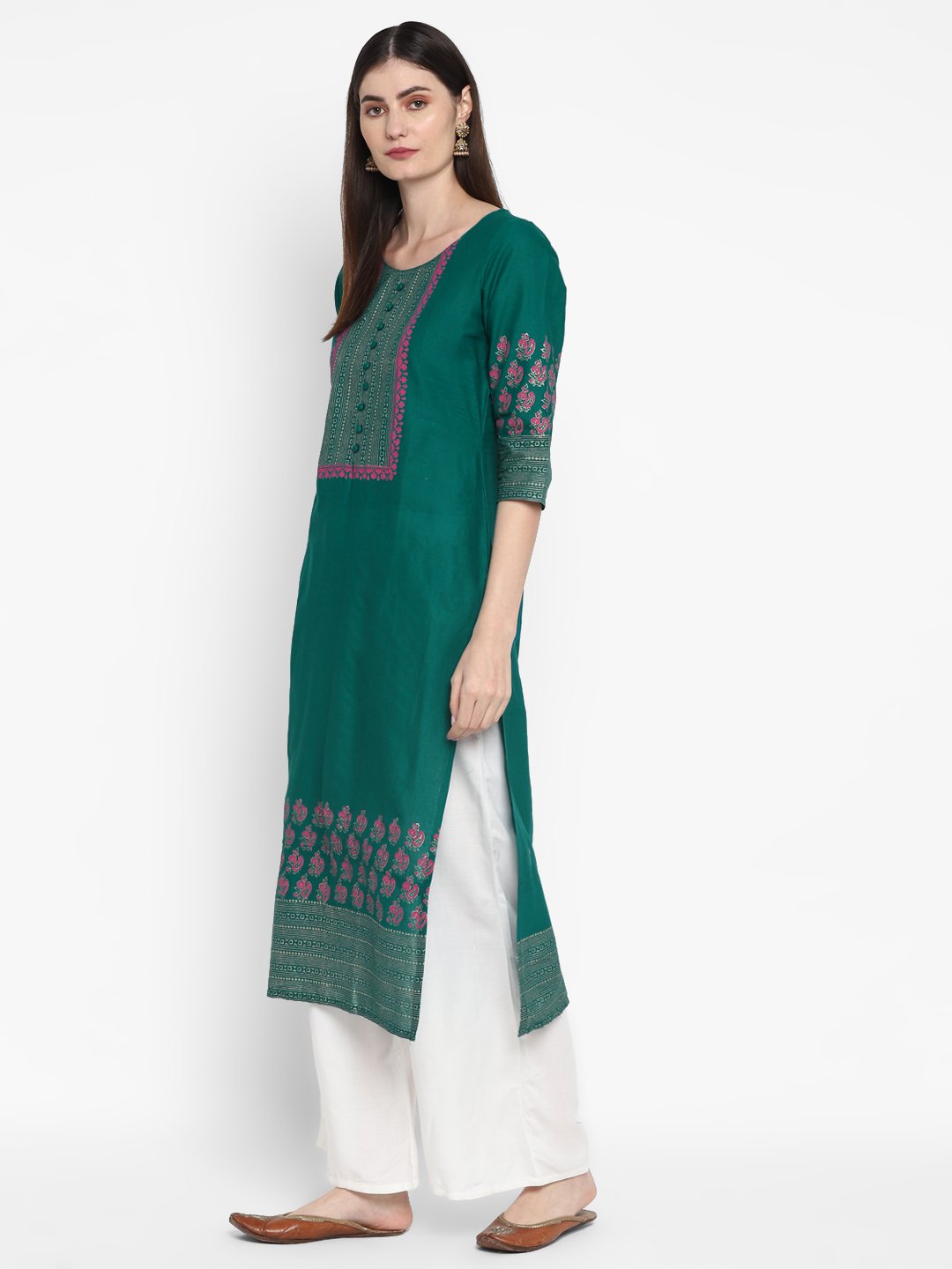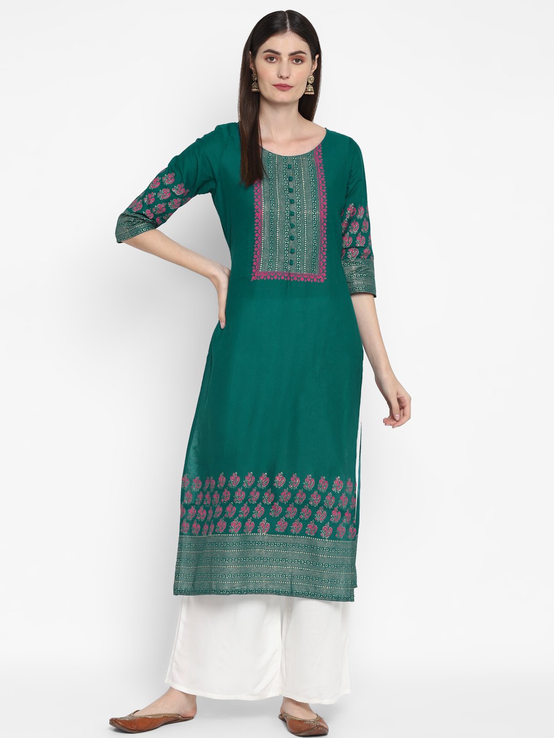Women's Sea Green Cotton Printed Straight Kurti With Block Print (1 Pc)