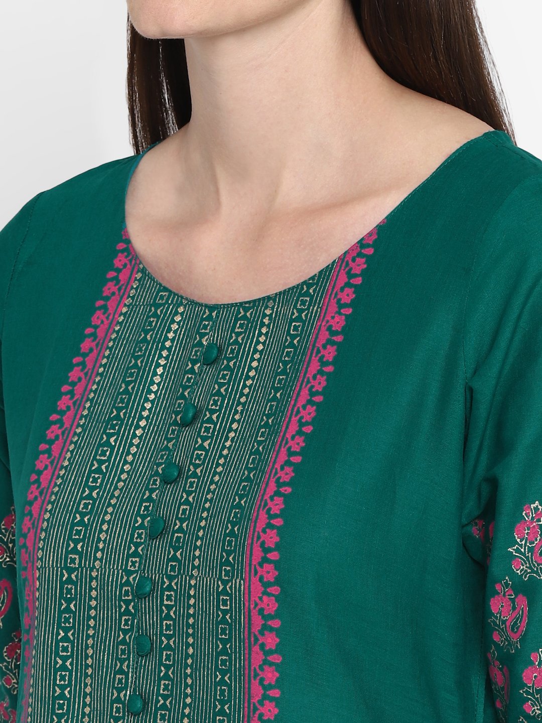 Sea Green Cotton Printed Straight Kurti With Block Print