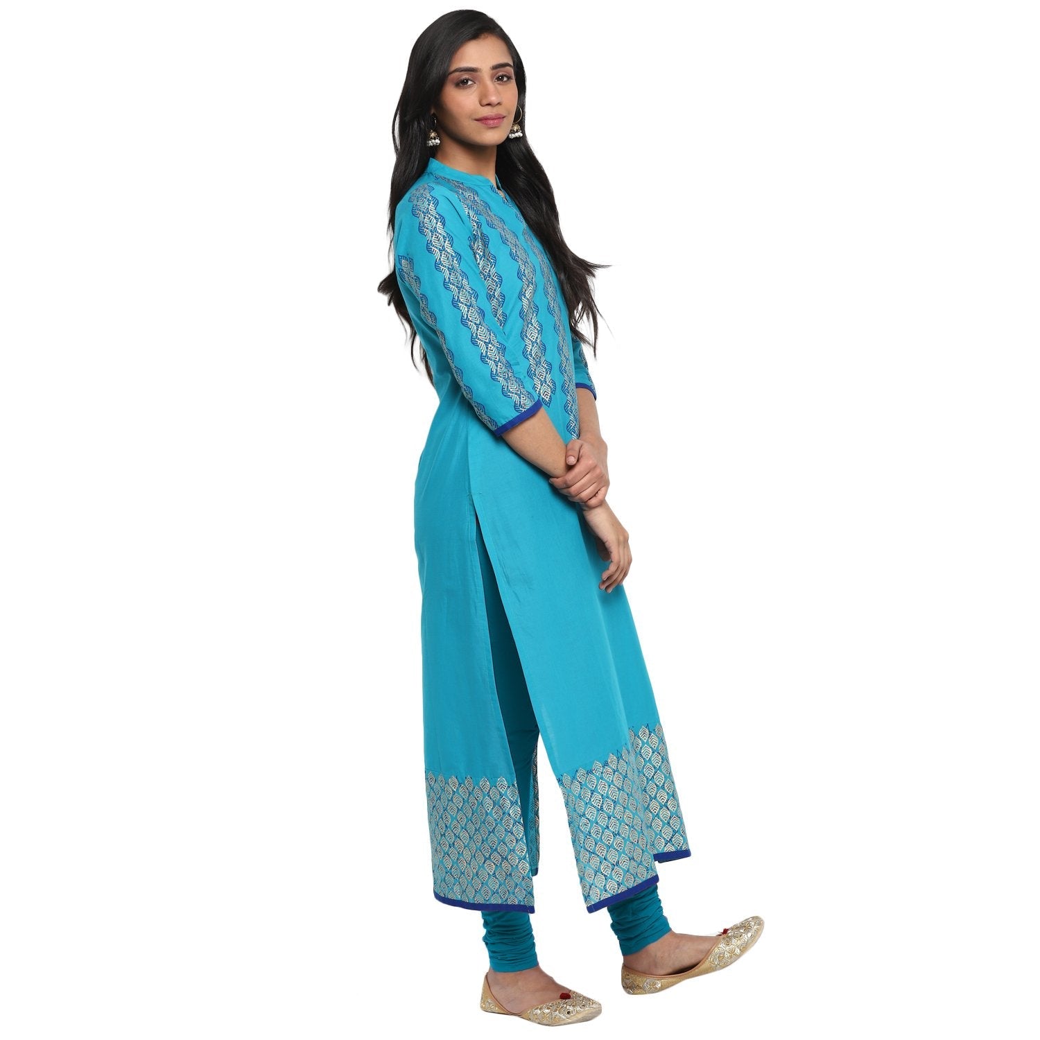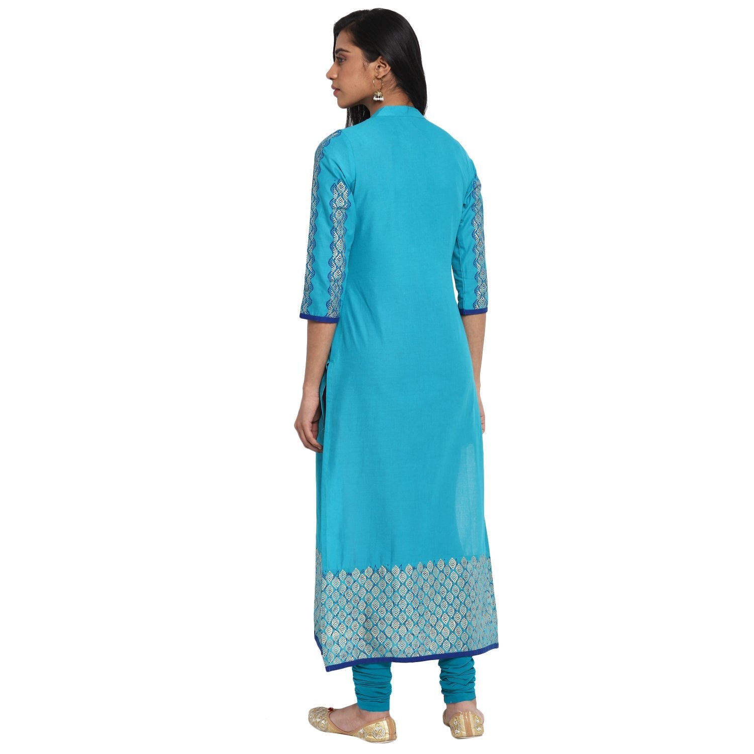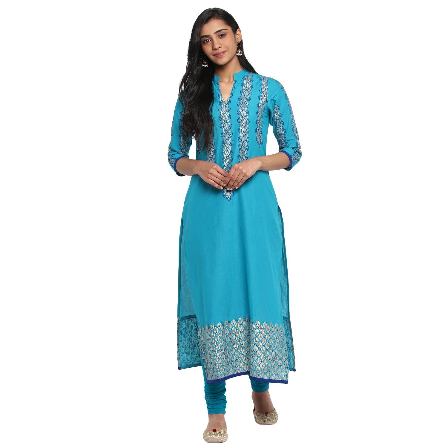 Women's Sky Blue Cotton Printed Straight Kurti With Block Print (1 Pc)