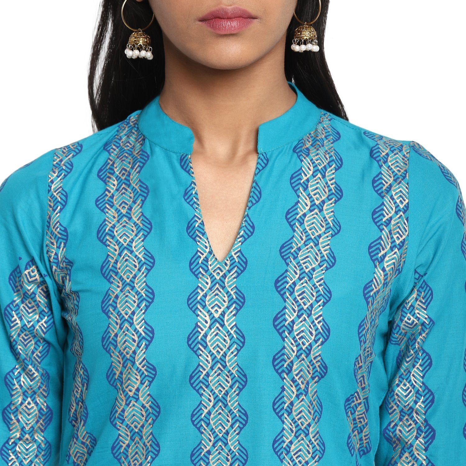 Sky Blue Cotton Printed Straight Kurti With Block Print