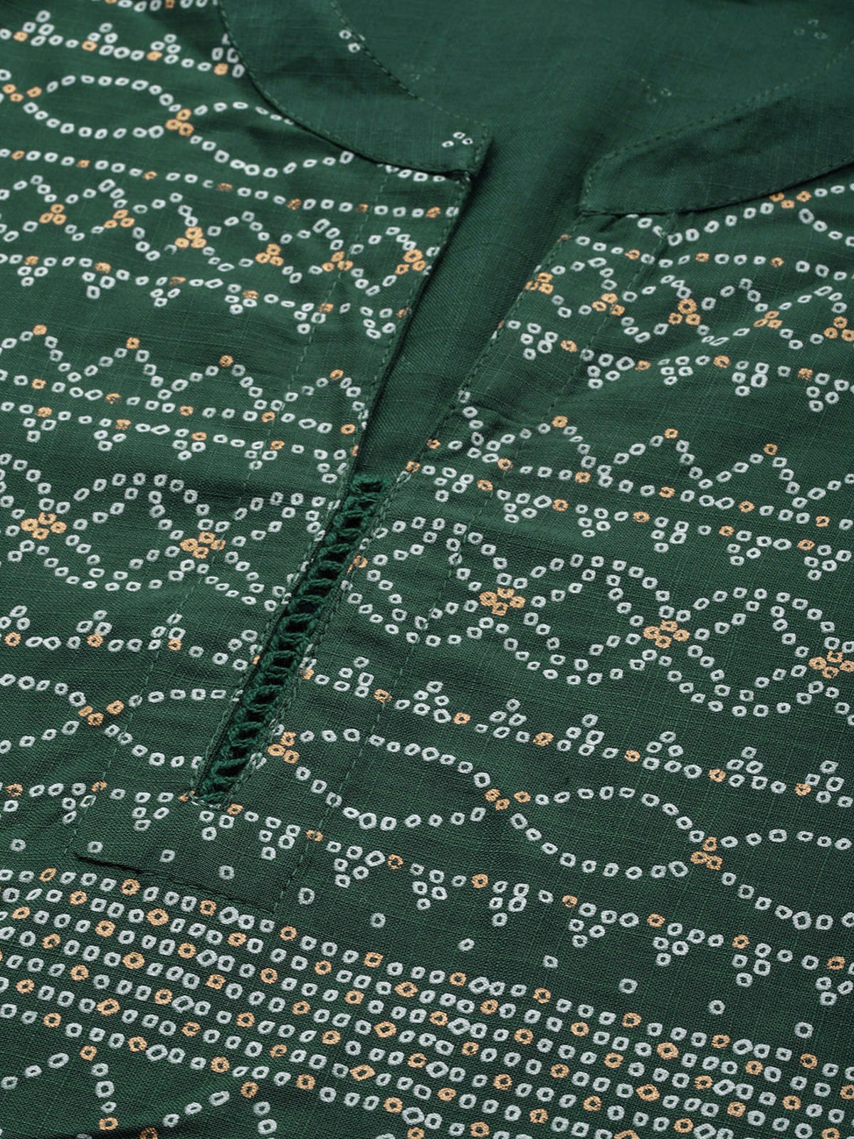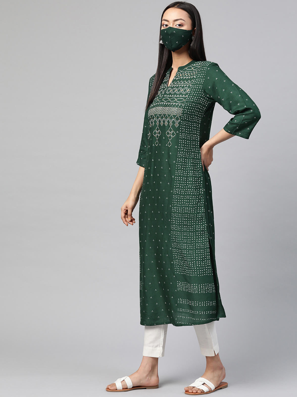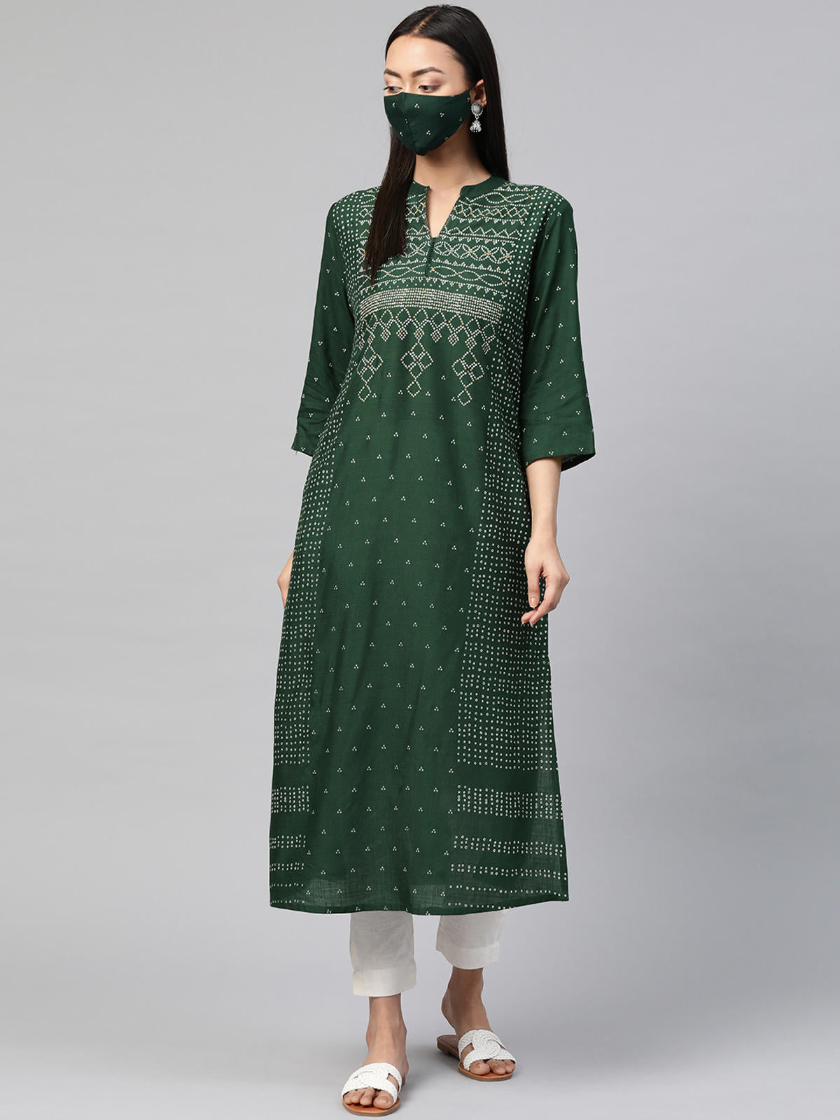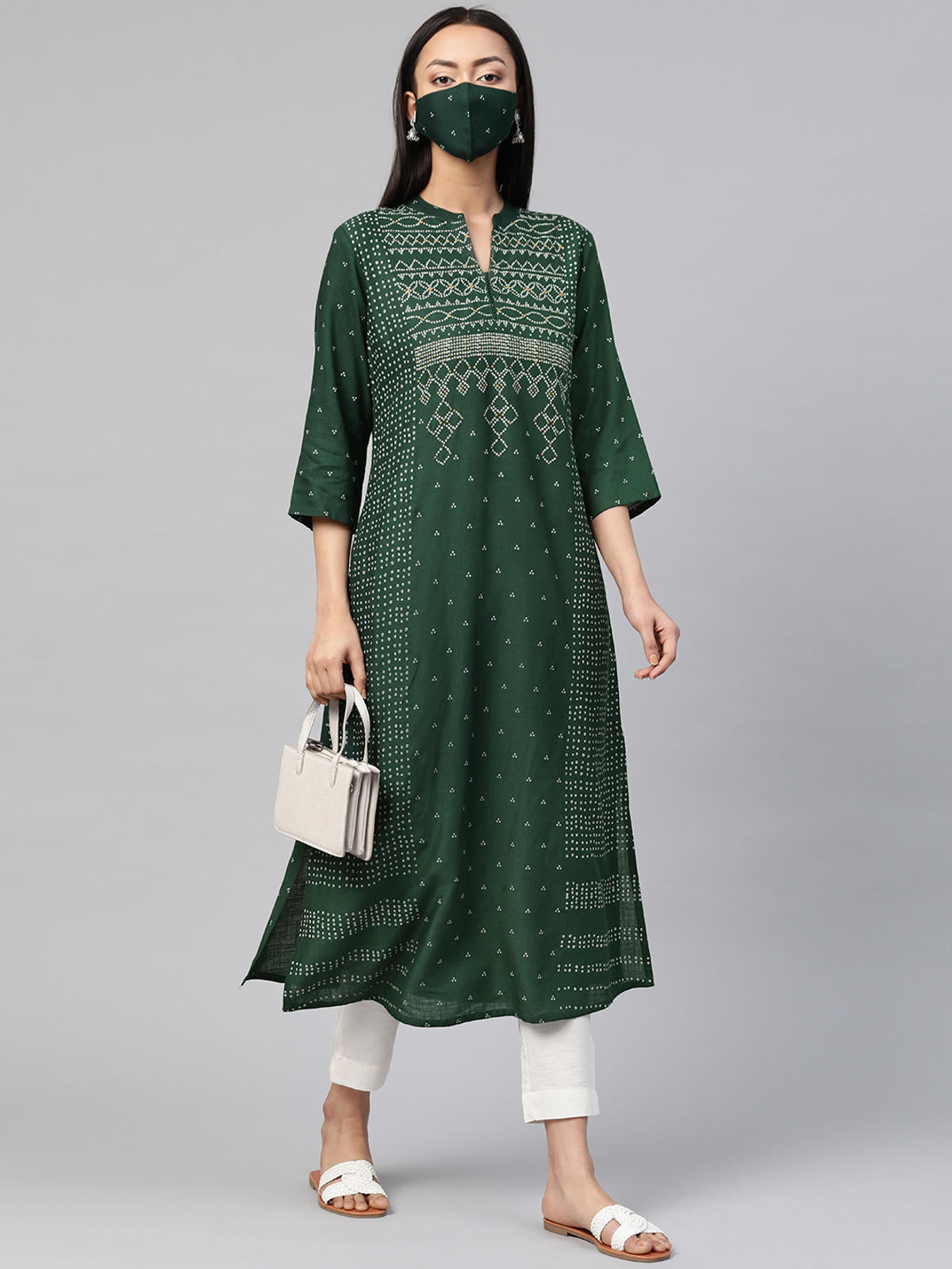 Top Details : Color :Jade Green Print :Bandhani Fabric :Rayon Slub Style :Regular Length :Calf Length Neck :Mandarin Collar Length :Three Quarter