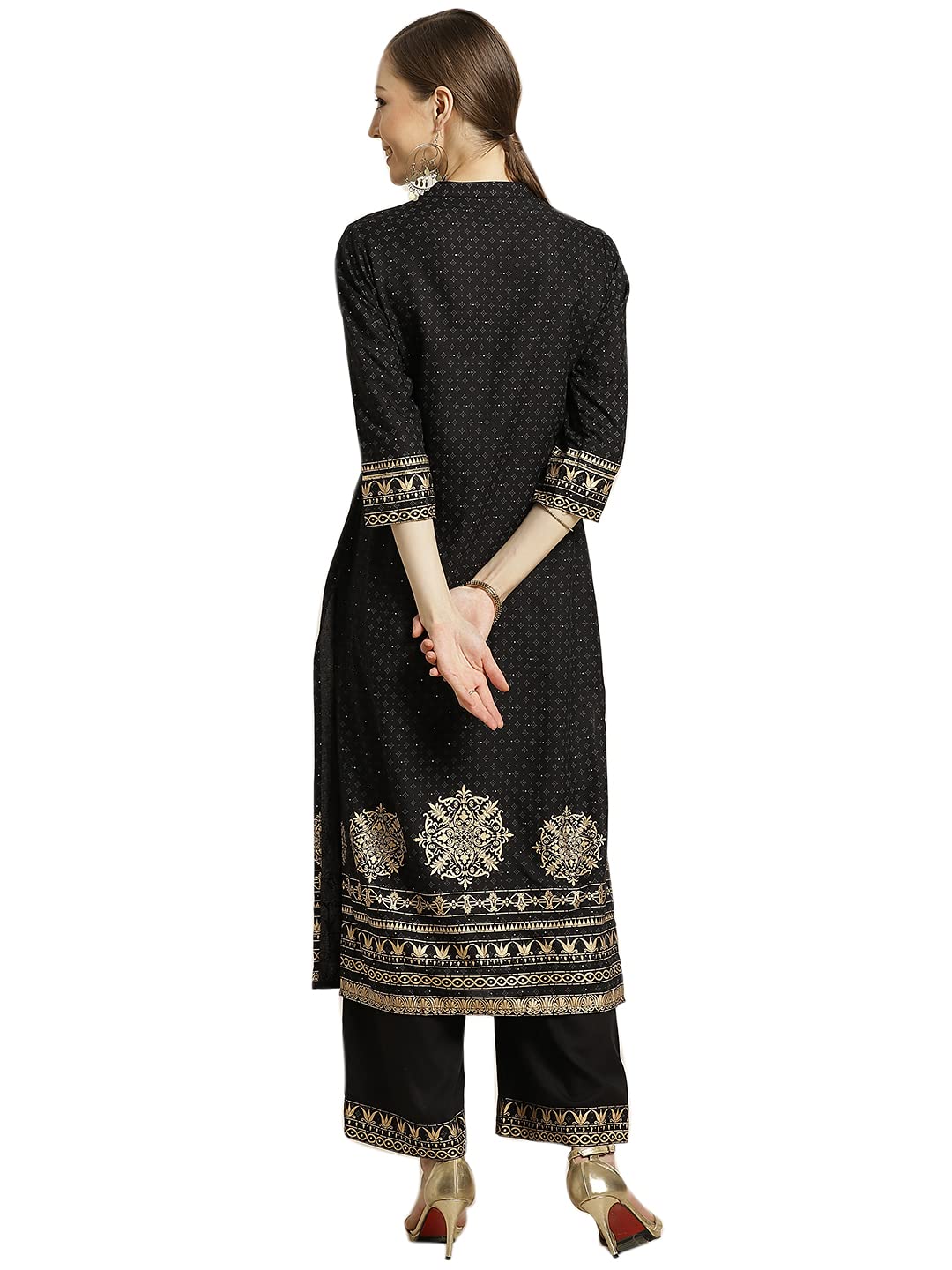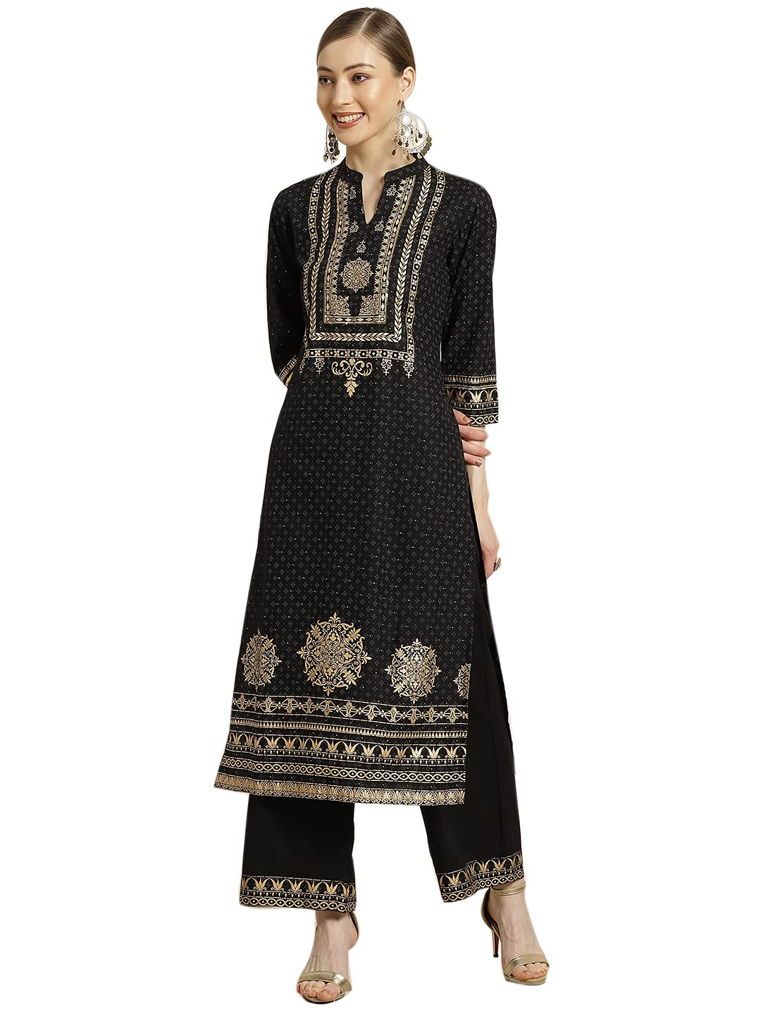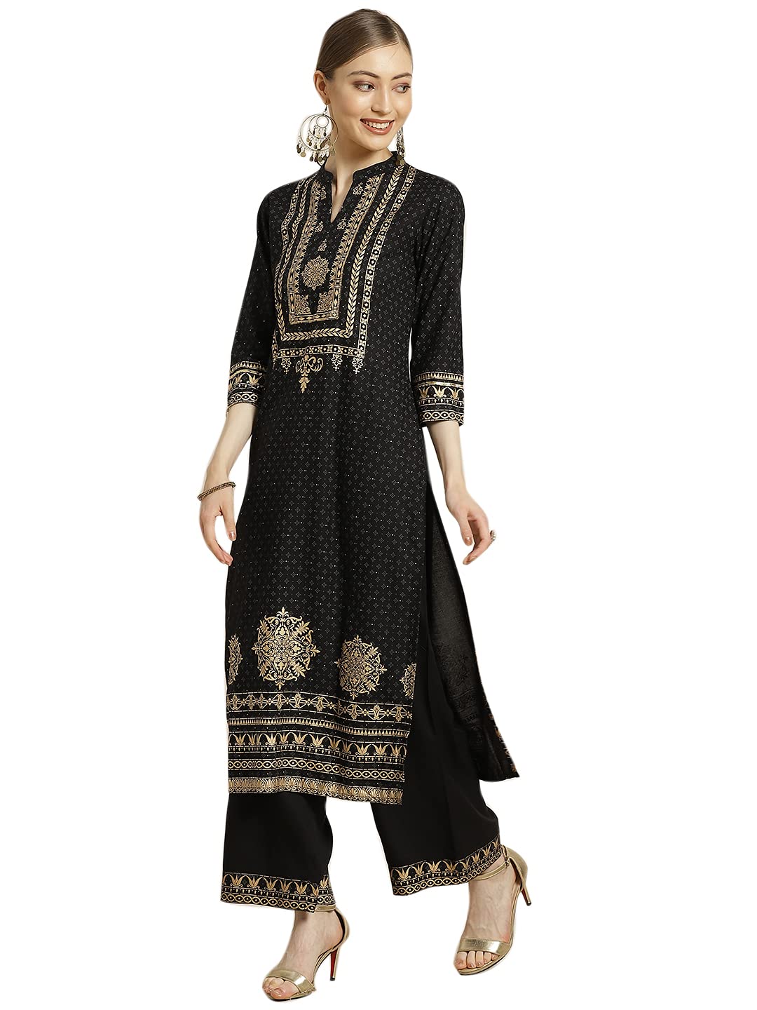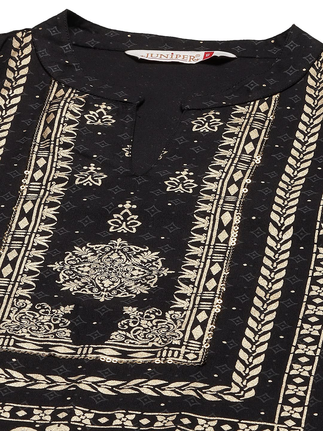 Juniper Black Rayon Gold Foil Print Straight Kurta
