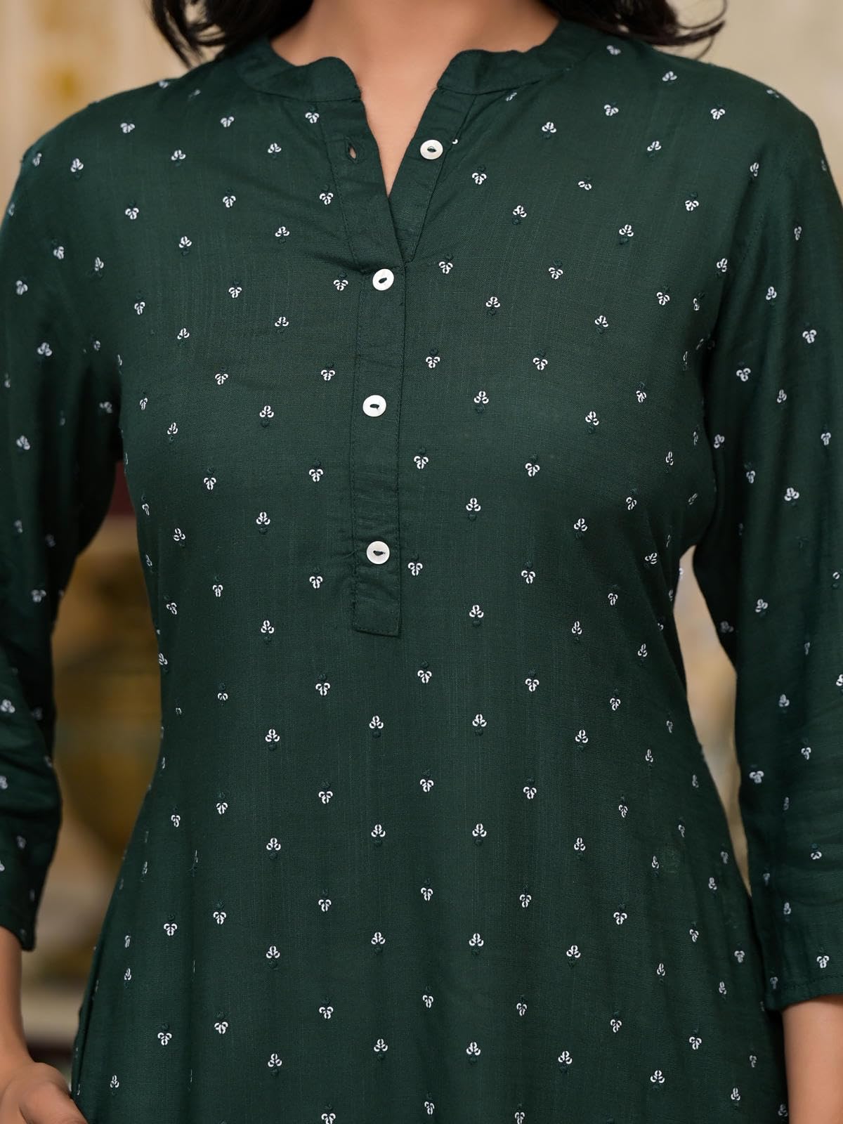Bottle Green Liva Rayon Kurta Adorned With Buttons. The Calf-Length, Straight Silhouette Features A Mandarin Collar And Three-Quarter Regular Sleeves, Offering A Sophisticated And Refined Look.
