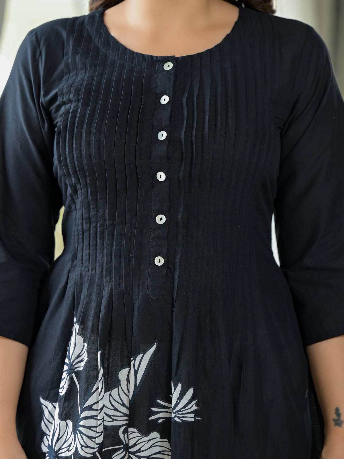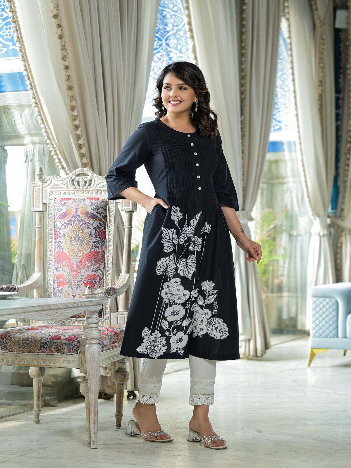 Top Details : Color :Black Print :Floral Fabric :Cotton Voile Style :Gathers Length :Knee Length Neck :Round Neck Length :Three Quarter Sleeves