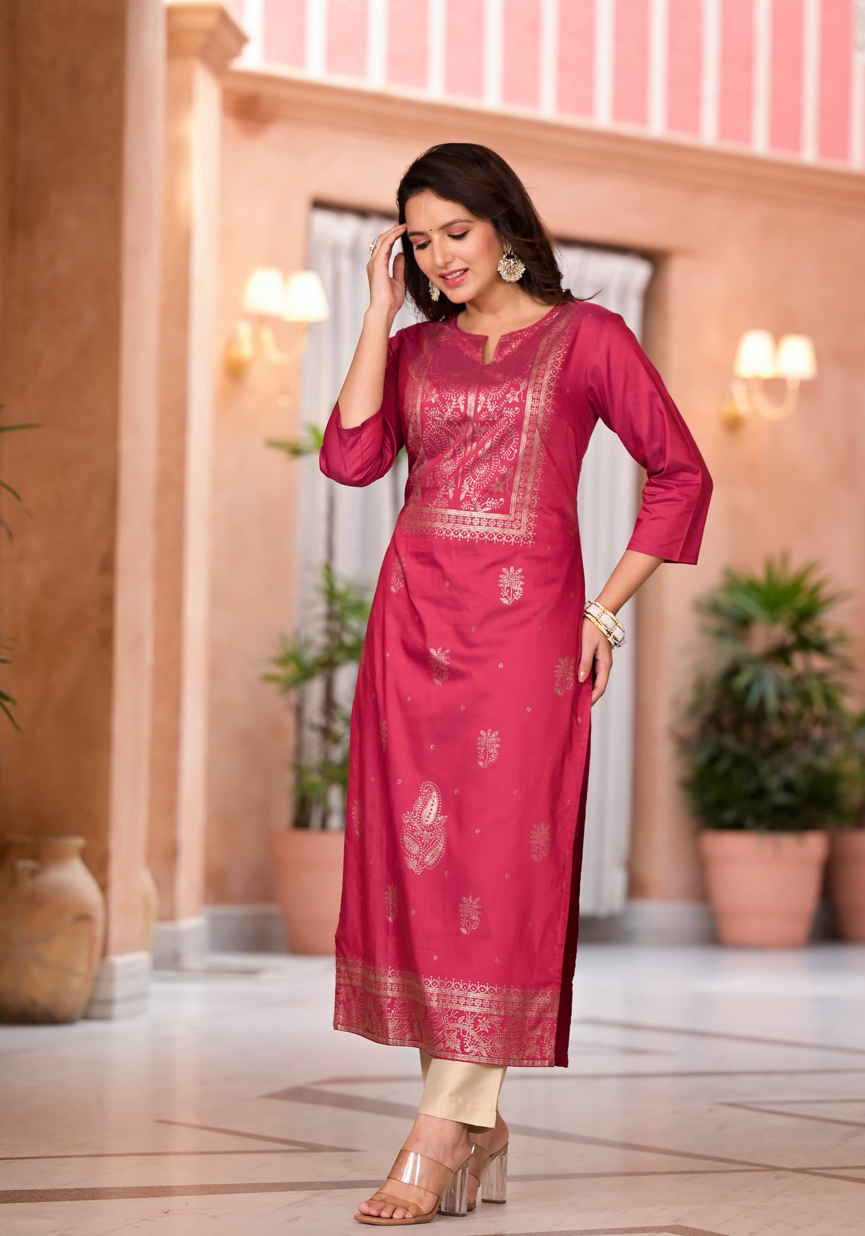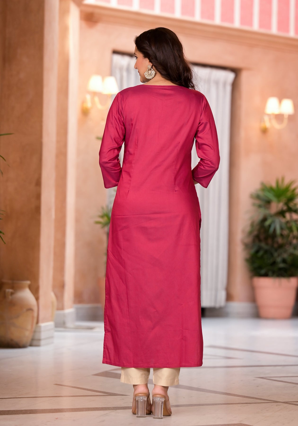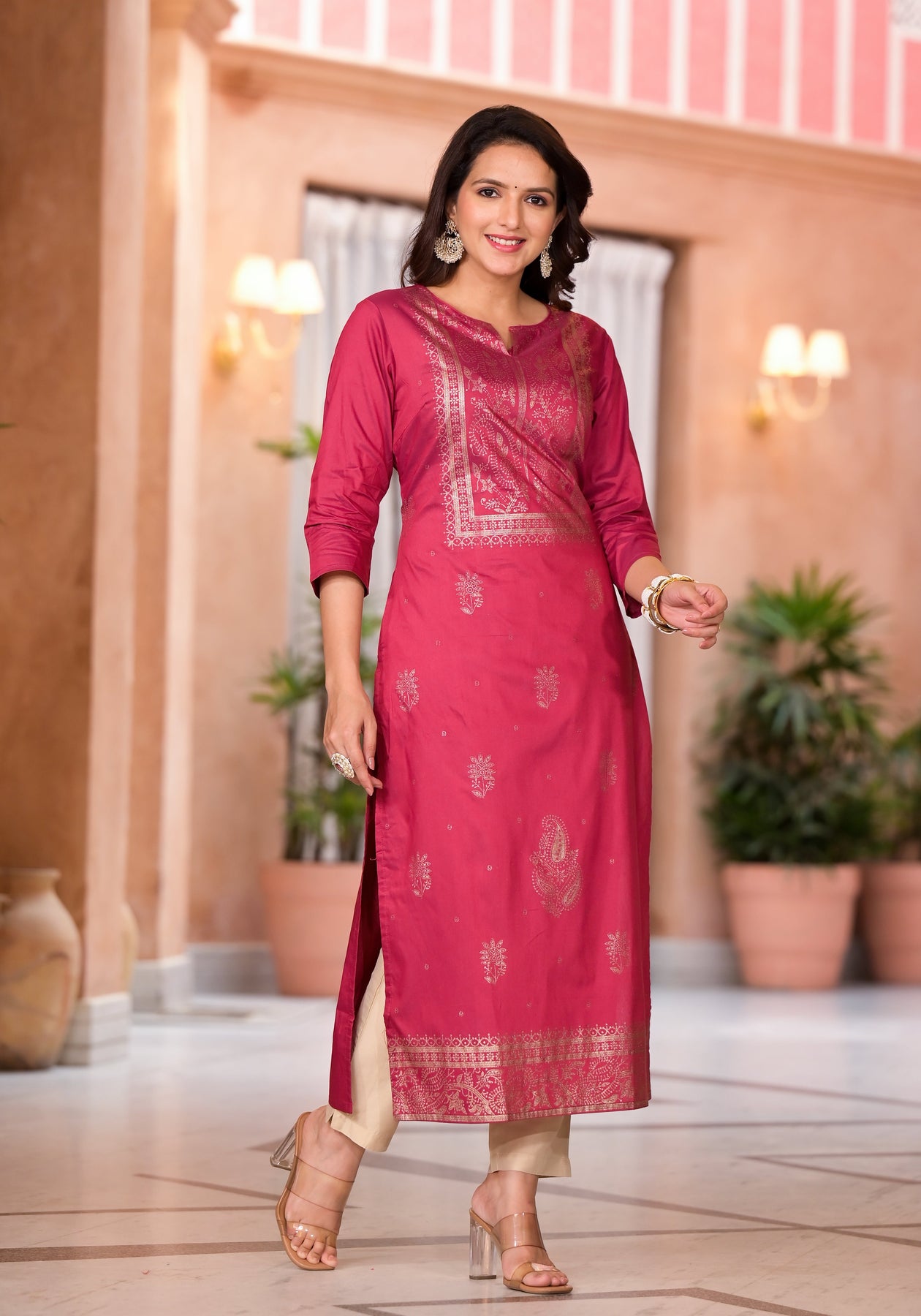 Maroon Ethnic Motif-Printed Cotton Kurta, The Calf-Length, Straight Kurta Features A Mandarin Collar And Three-Quarter Regular Sleeves, Paired With Solid Slip-On Pants For A Sophisticated And Refined Look.