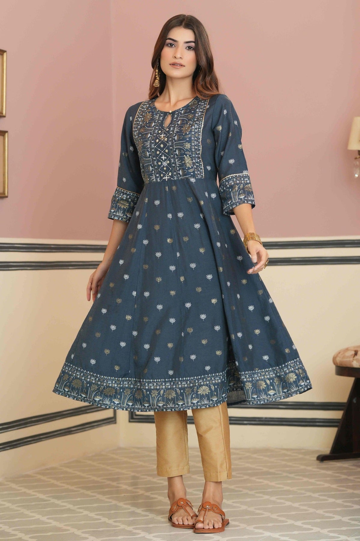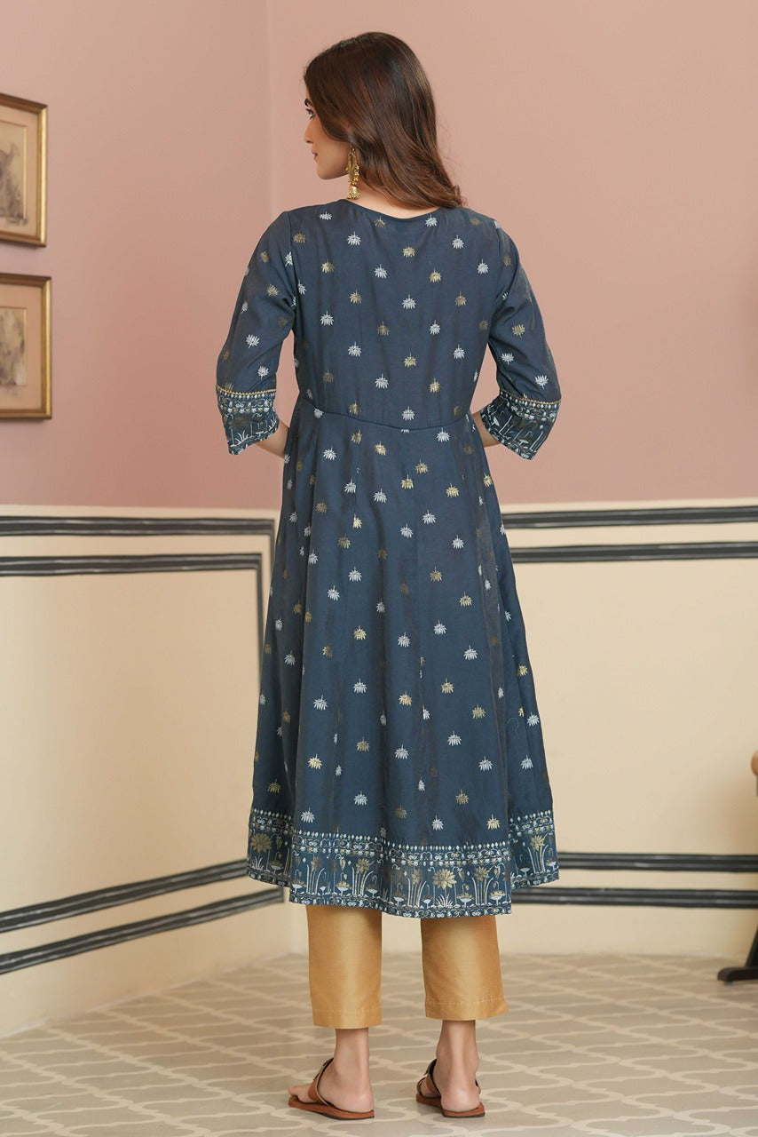 Juniper Teal rayon placement printed anarkali kurta