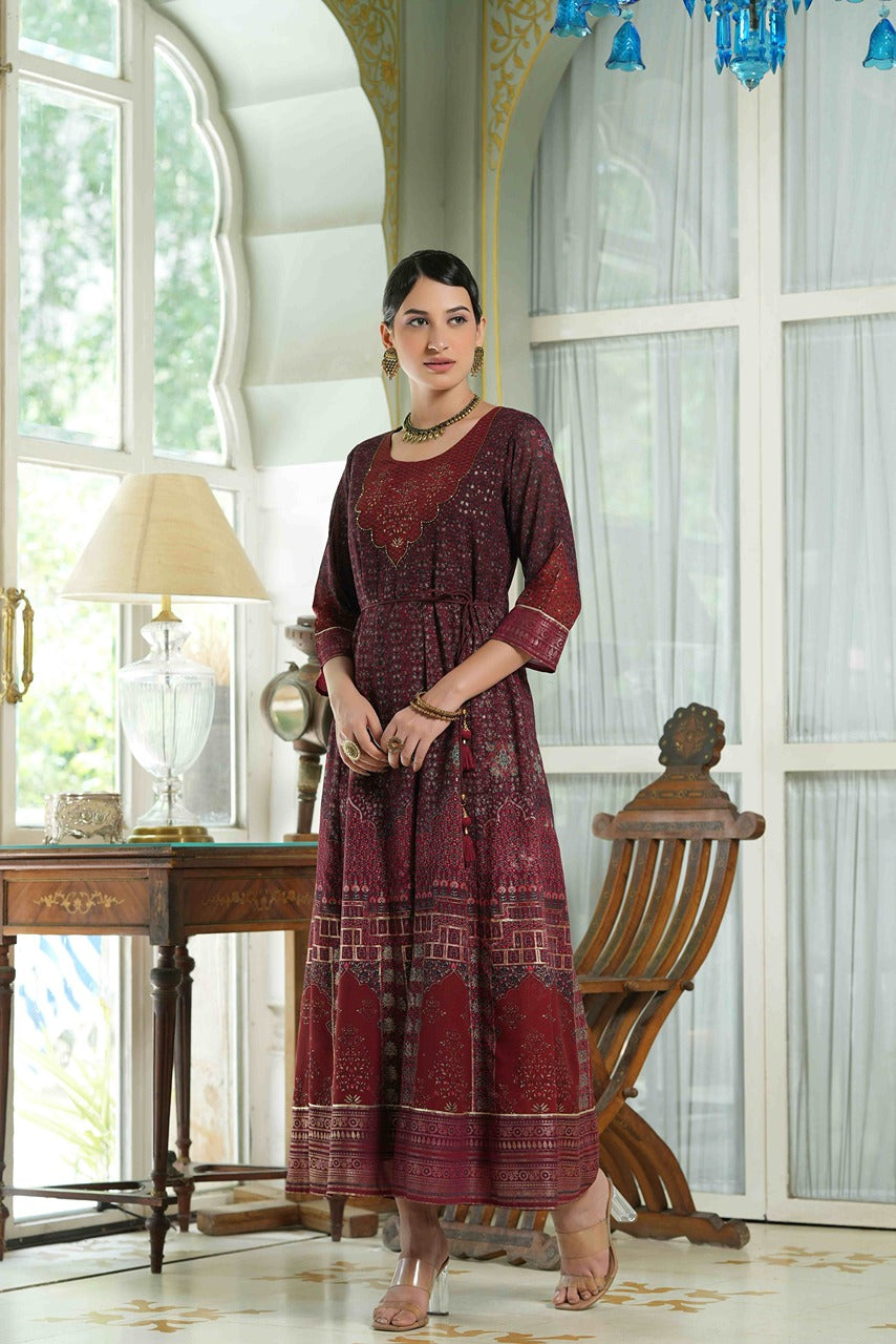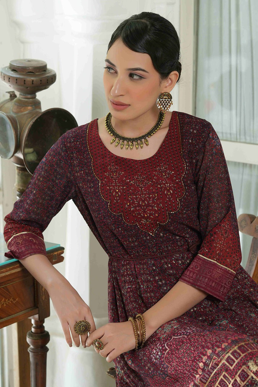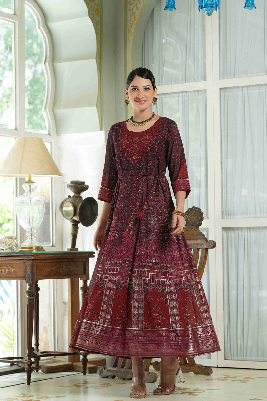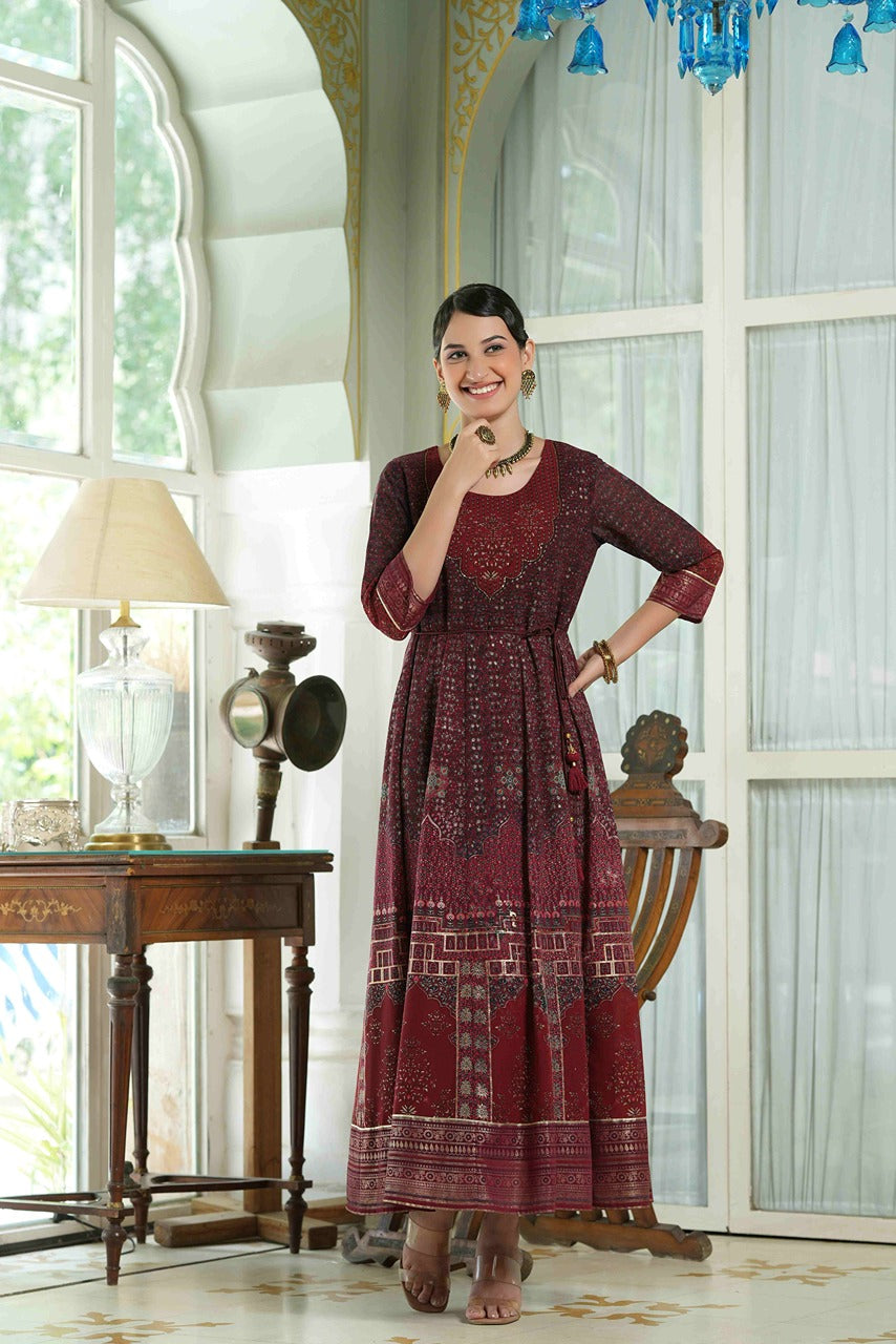 Juniper Women's Maroon multi color geogette printed anarkali kurta with waist tie-up,round neck,three-fourth regular sleeves detailed with beads,sequins and gota