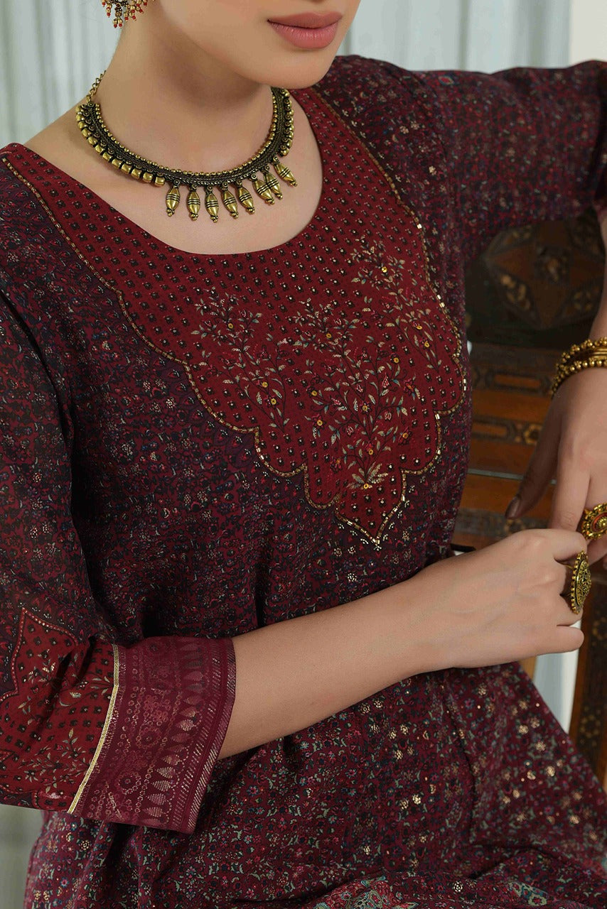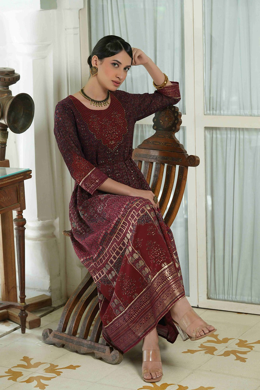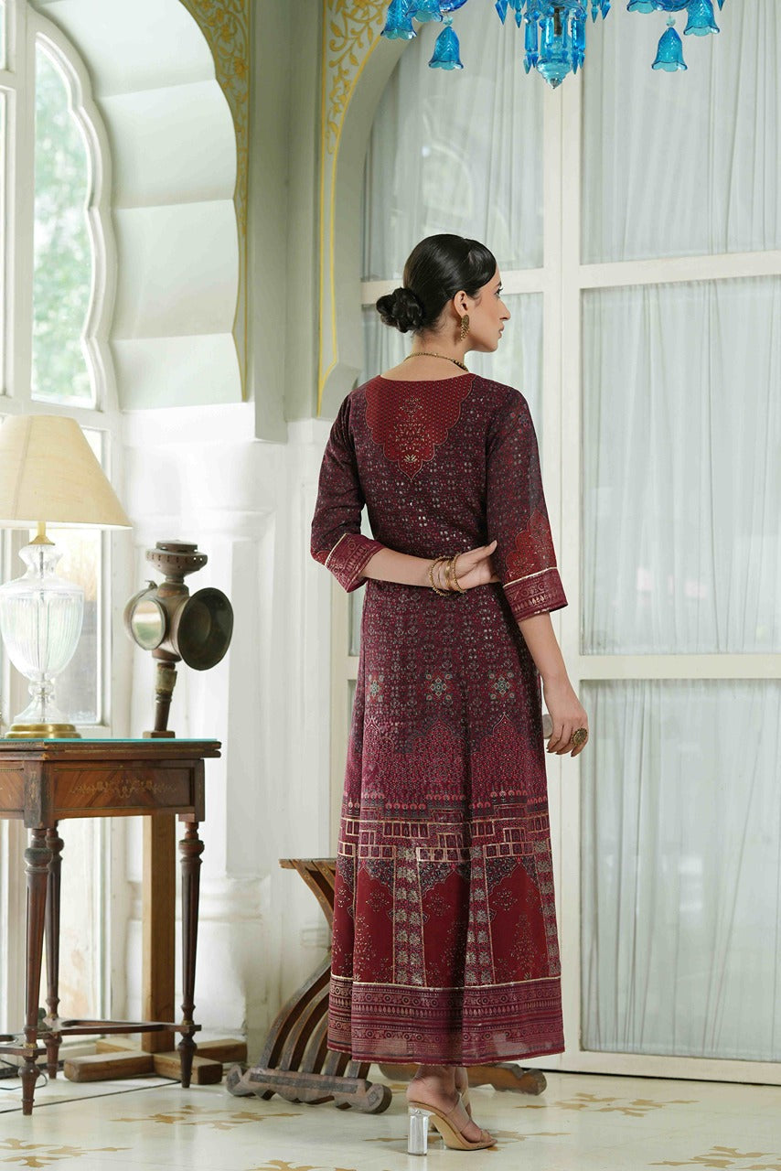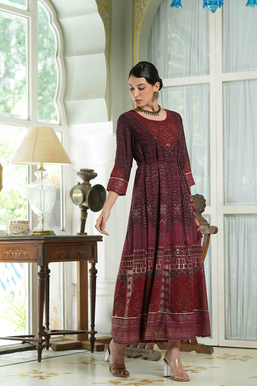 Juniper Women's Maroon multi color geogette printed anarkali kurta with waist tie-up,round neck,three-fourth regular sleeves detailed with beads,sequins and gota