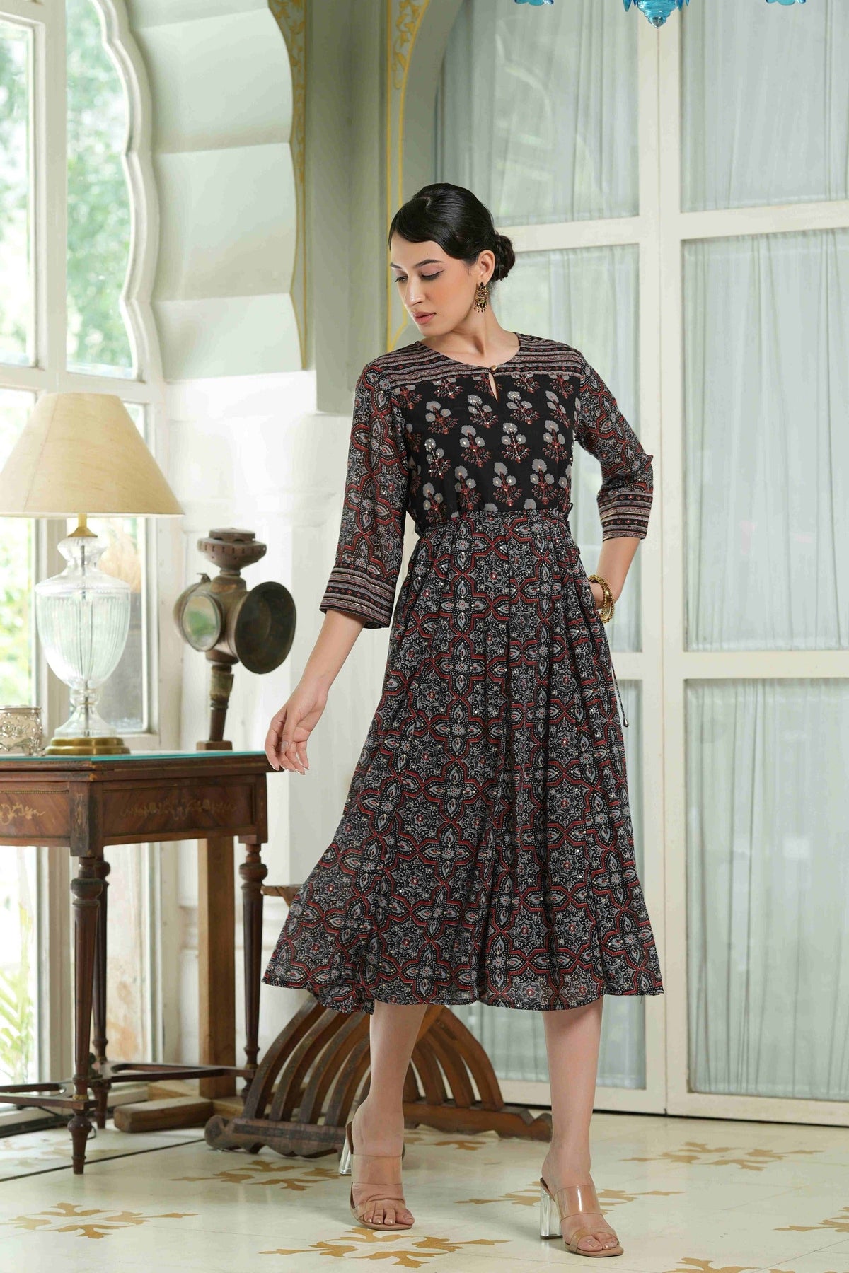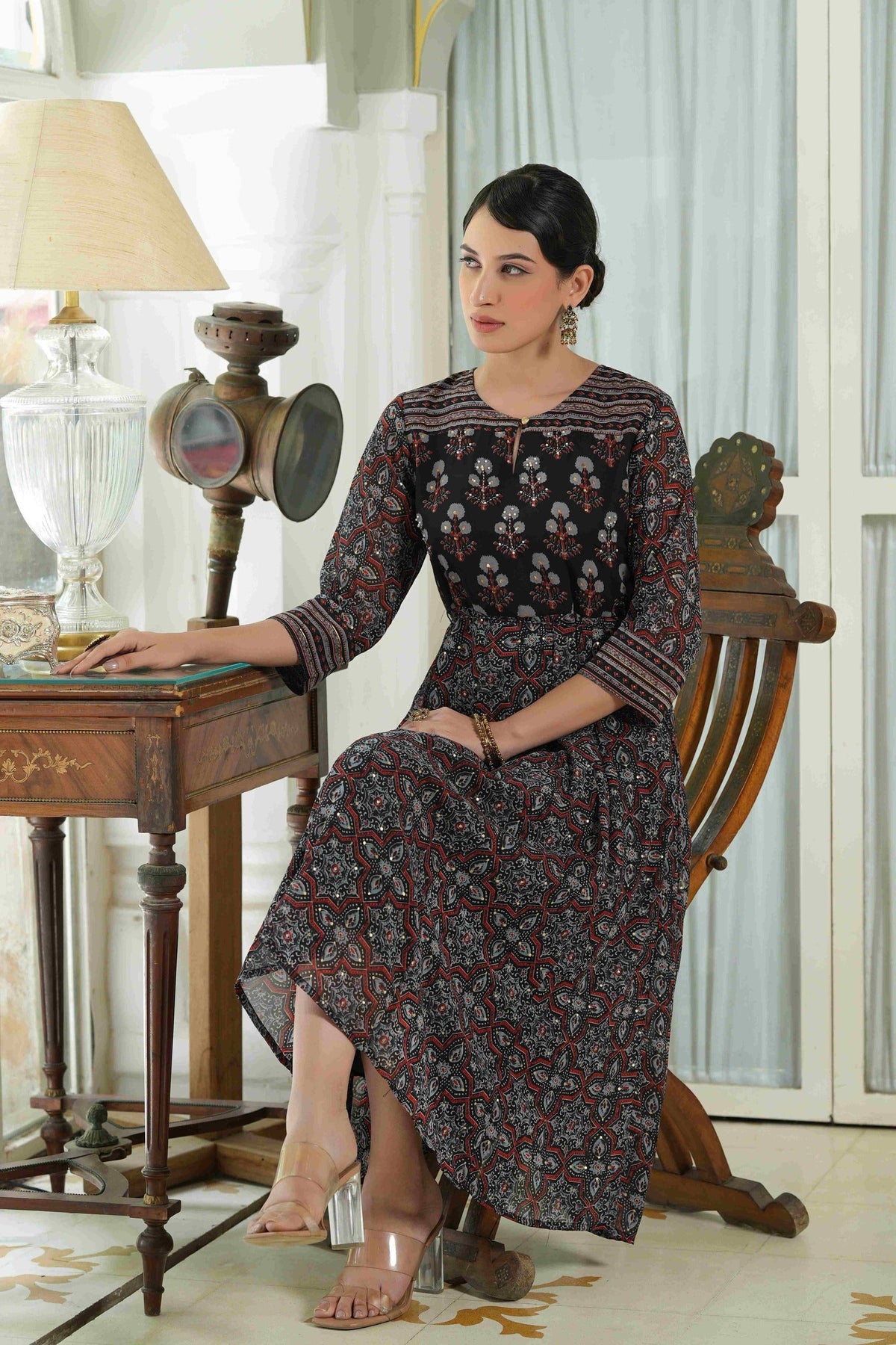 Juniper Black Georgette Festive Printed Anarkali Flared Anarkali Kurta For Women Perfect For Fusion Clothing With A Traditional Twist, Trendy Silhouette And Latest Styles