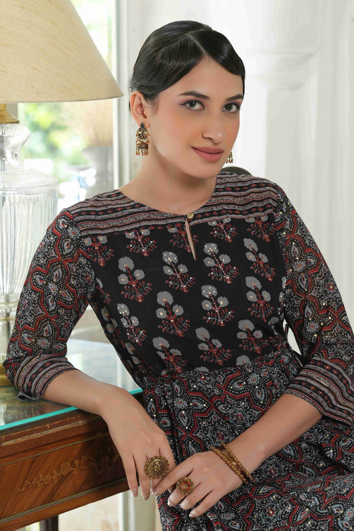 Juniper Black Georgette Festive Printed Anarkali Flared Anarkali Kurta For Women
