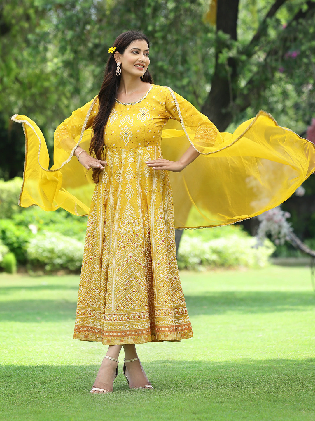 Juniper Women Mustard Santoon Slub Festive Print Flared Kurta Dupatta Set