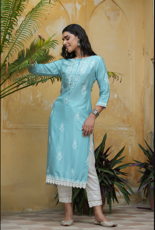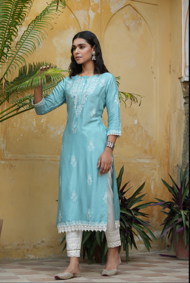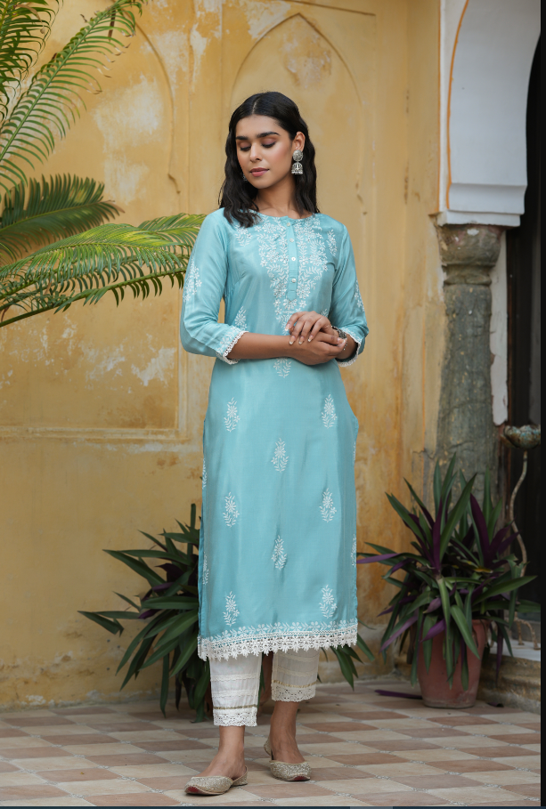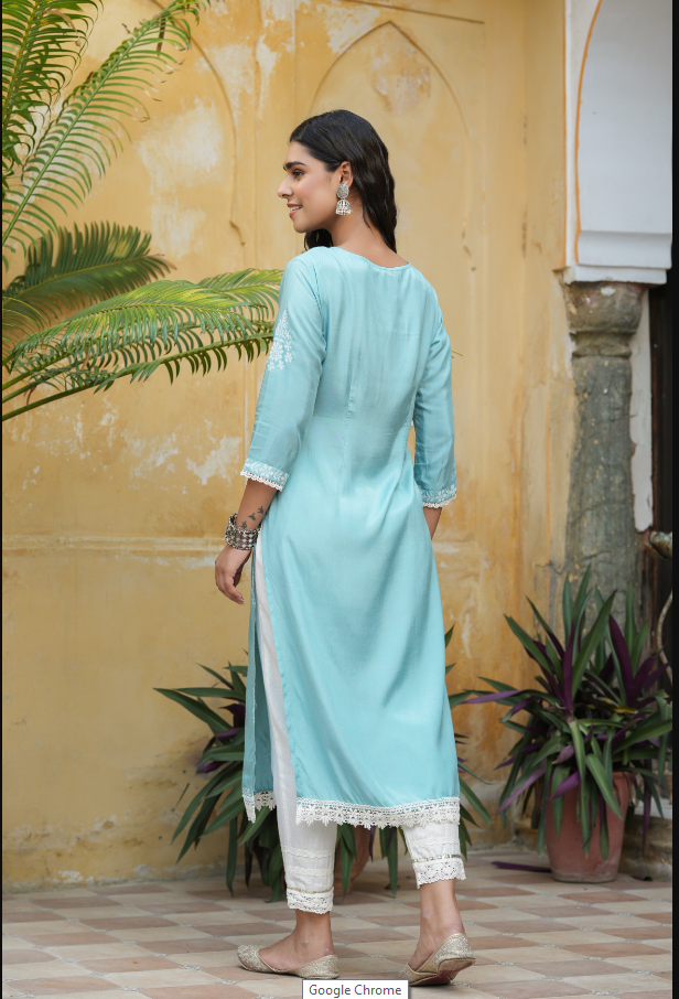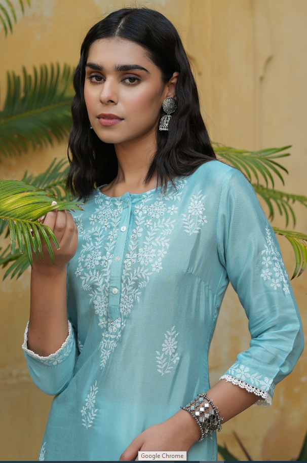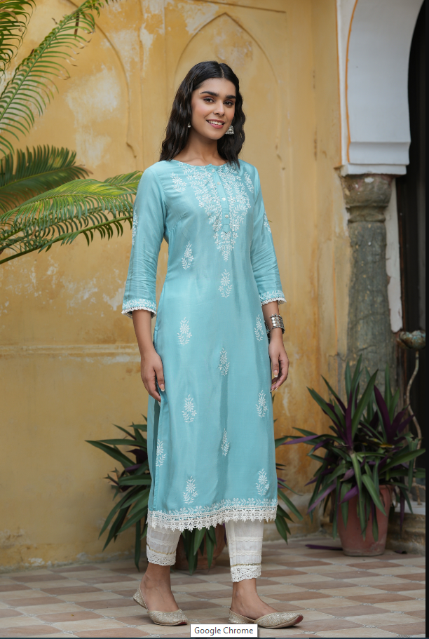 Juniper Women's Sky blue Shanton Printed Straight Kurta Length :Calf Length Shape :Straight Fabric :Shanton Color :Sky blue Pattern :Printed Neck Line :Round neck Wash Care :Hand Wash Weight(G) :300