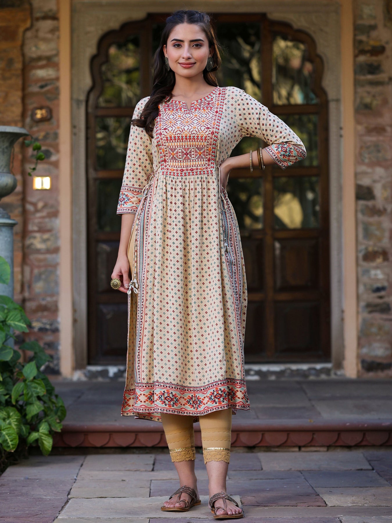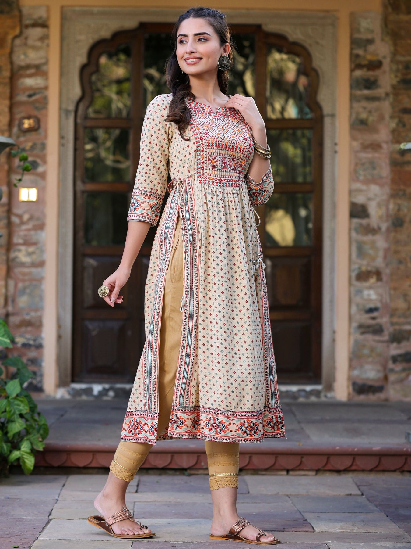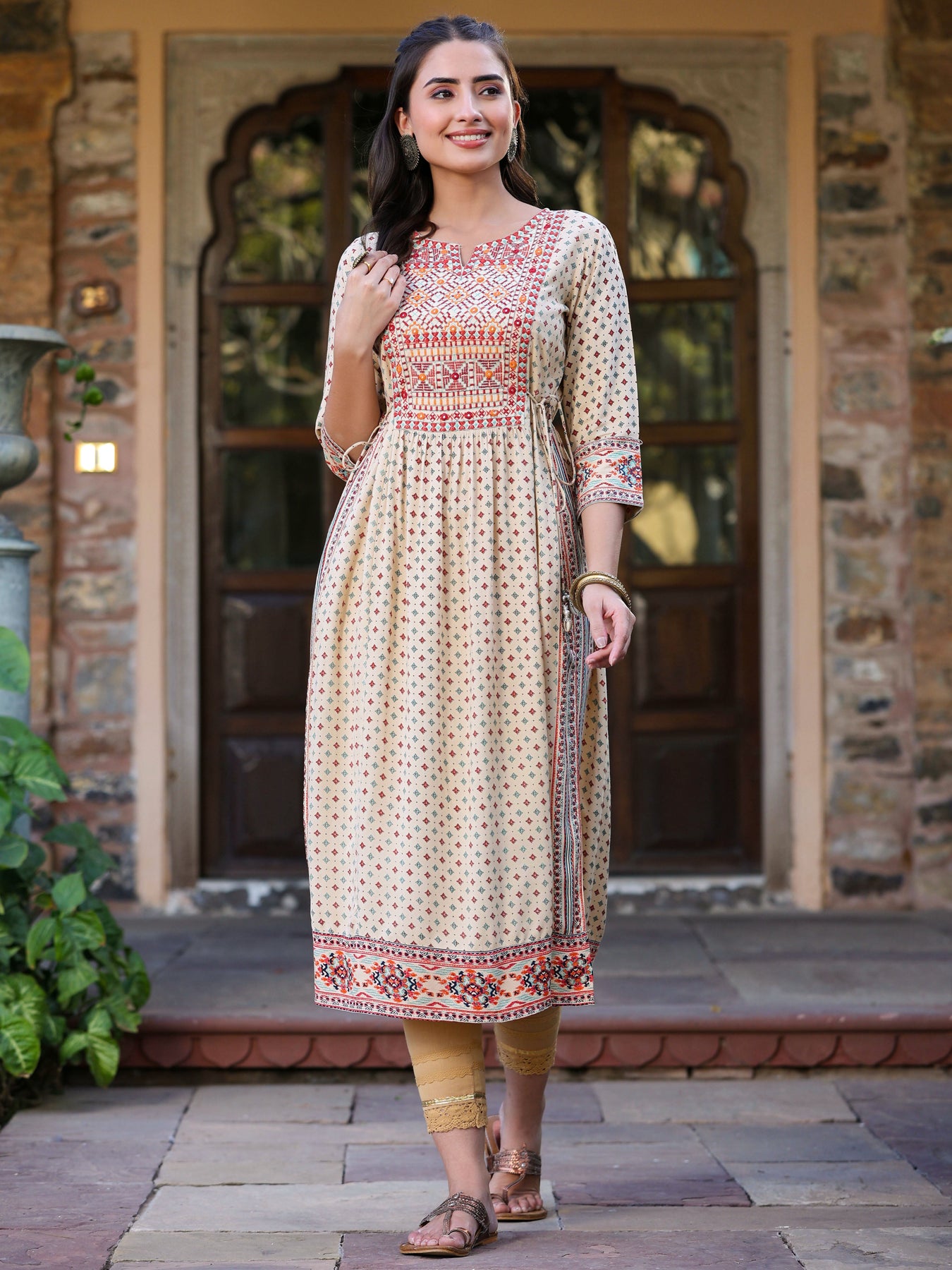 Juniper Women's Beige Rayon Printed Embroidered Straight Kurta Length :Calf Length Shape :Straight Fit Fabric :Rayon Color :Beige Pattern :Print Neck Line :Round Neck Wash Care :Hand Wash Weight(G) :300