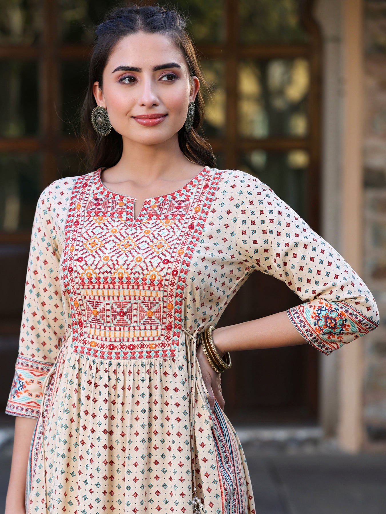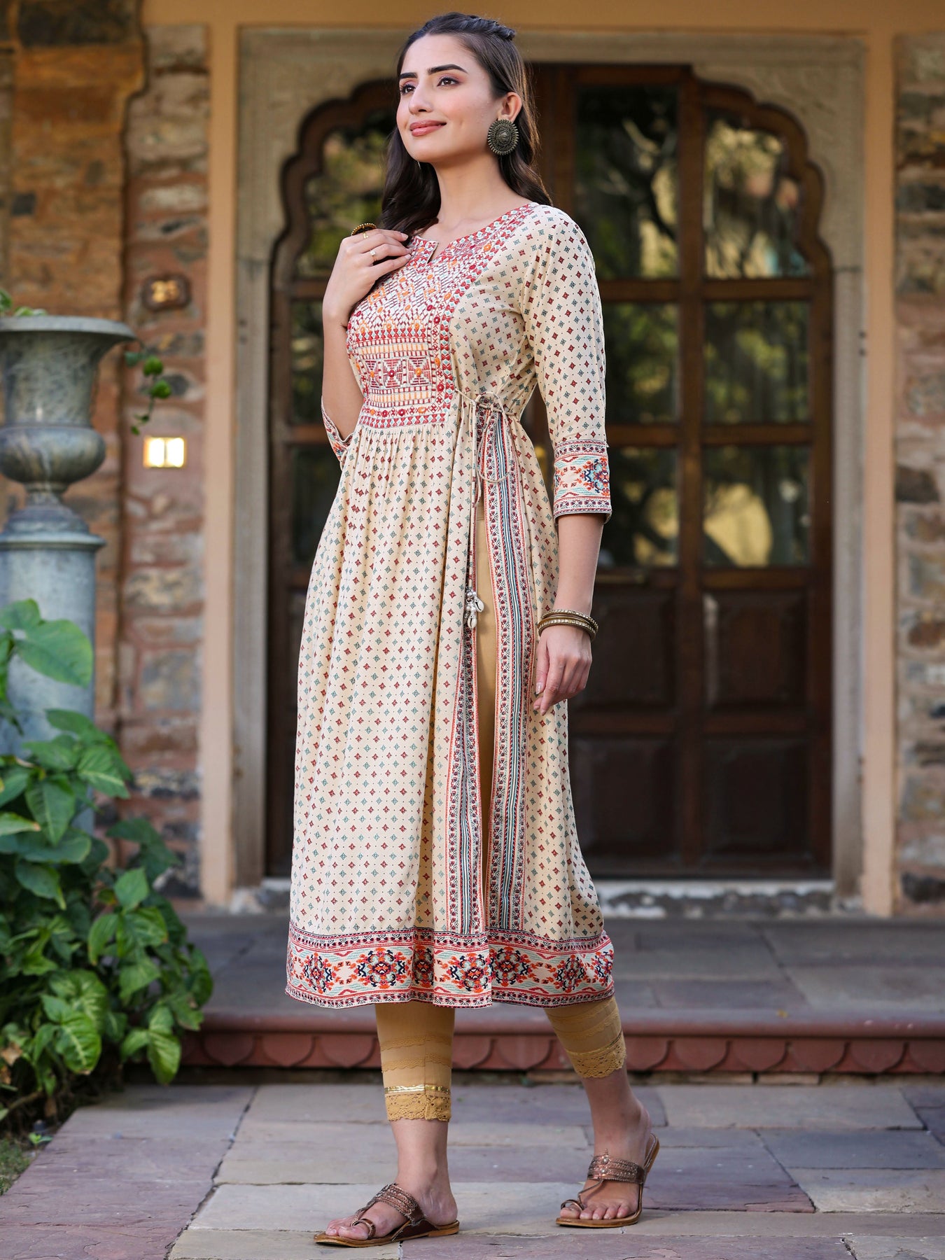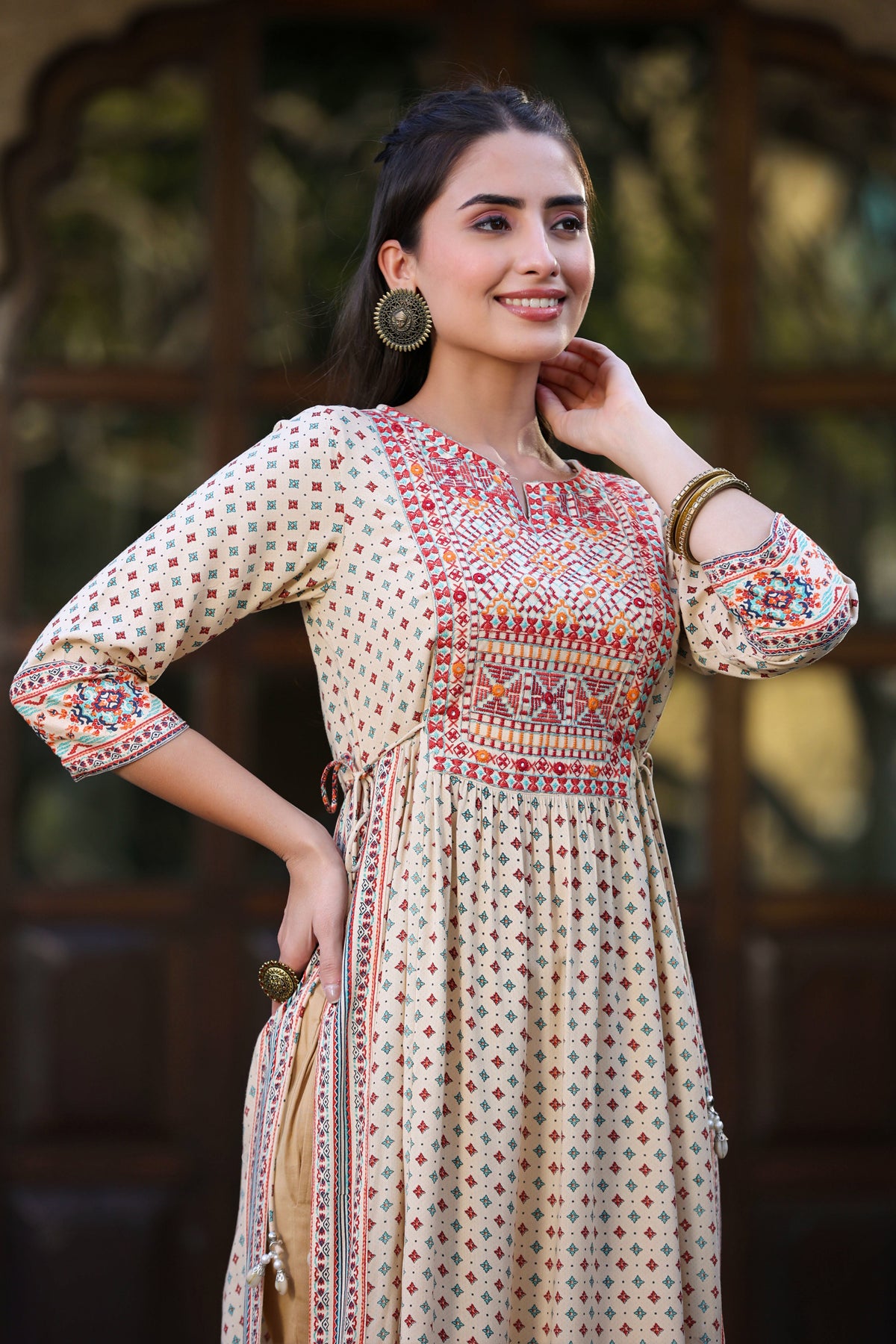 Juniper Women's Beige Rayon Printed Embroidered Straight Kurta Length :Calf Length Shape :Straight Fit Fabric :Rayon Color :Beige Pattern :Print Neck Line :Round Neck Wash Care :Hand Wash Weight(G) :300