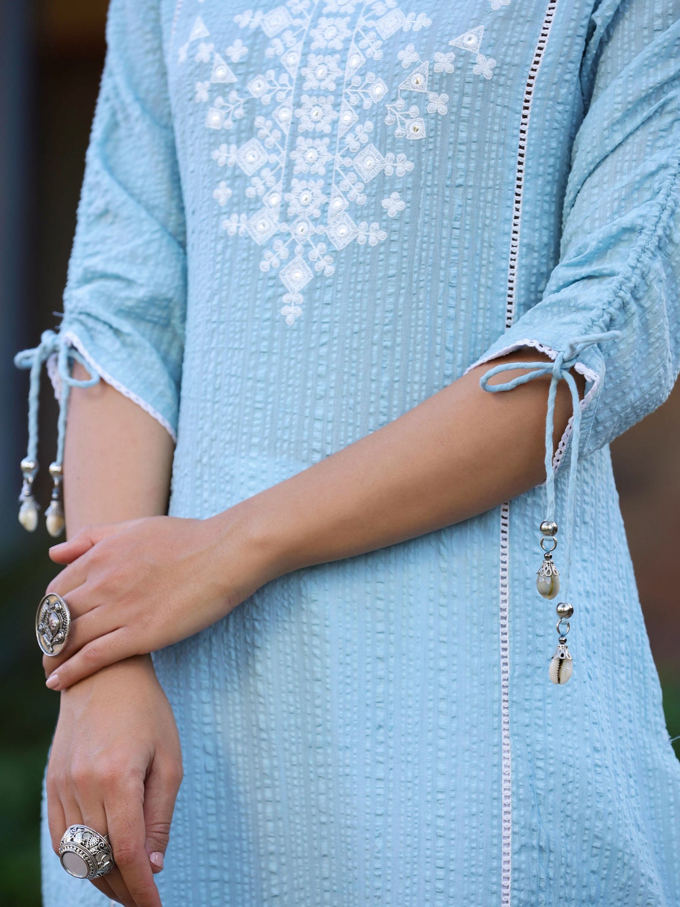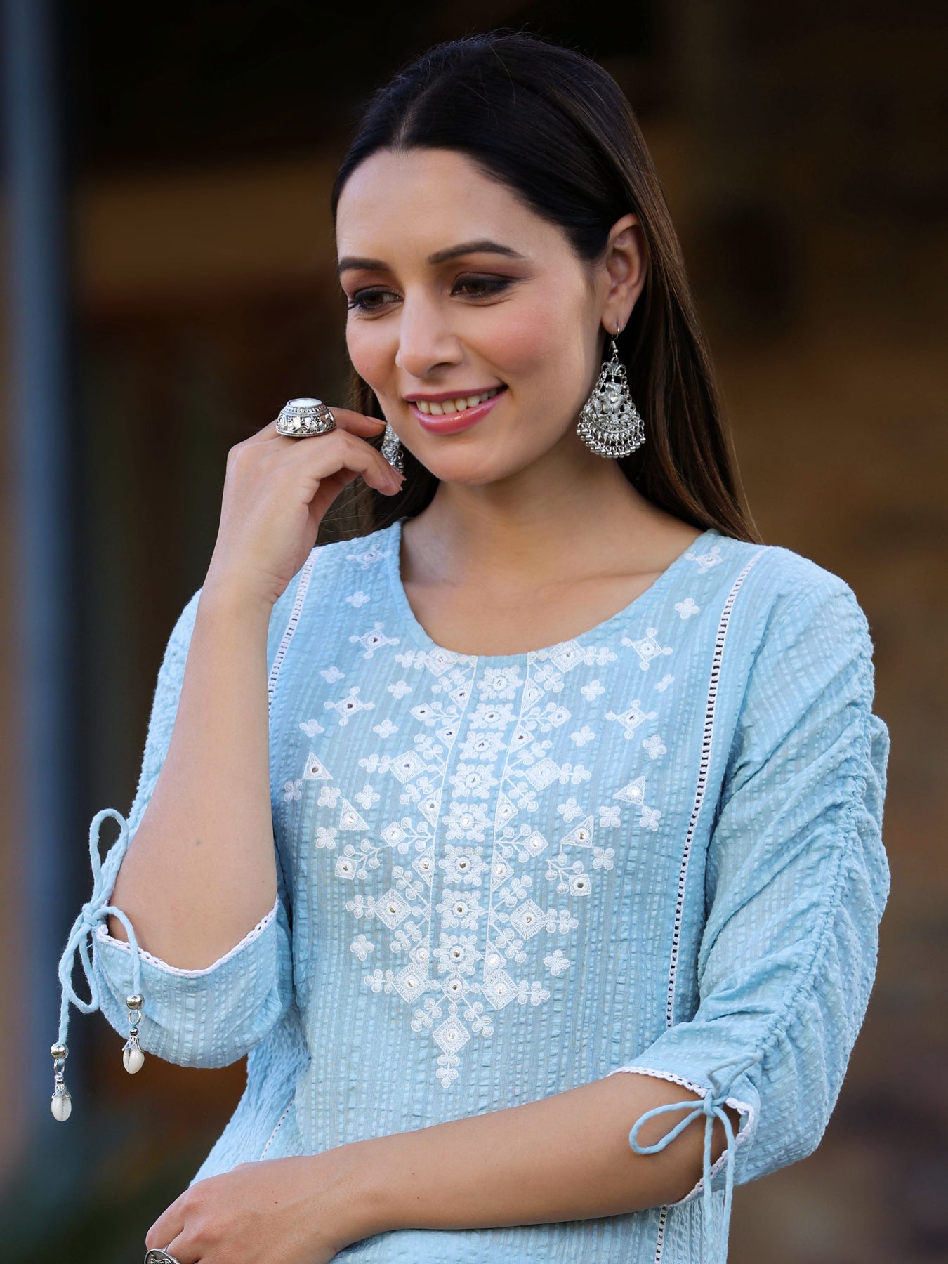 Juniper Women'S Blue Sheer Sucker Embroidered Straight Kurta Length :Calf Length Shape :A-line Fit Fabric :Sheer Sucker(Cotton) Color :Blue Pattern :Embellished Neck Line :Round neck Wash Care :Hand Wash Weight(G) :300