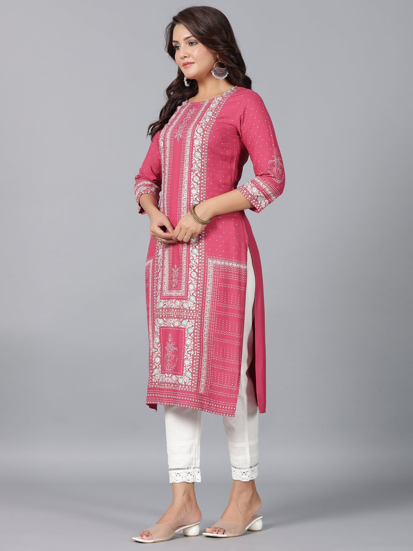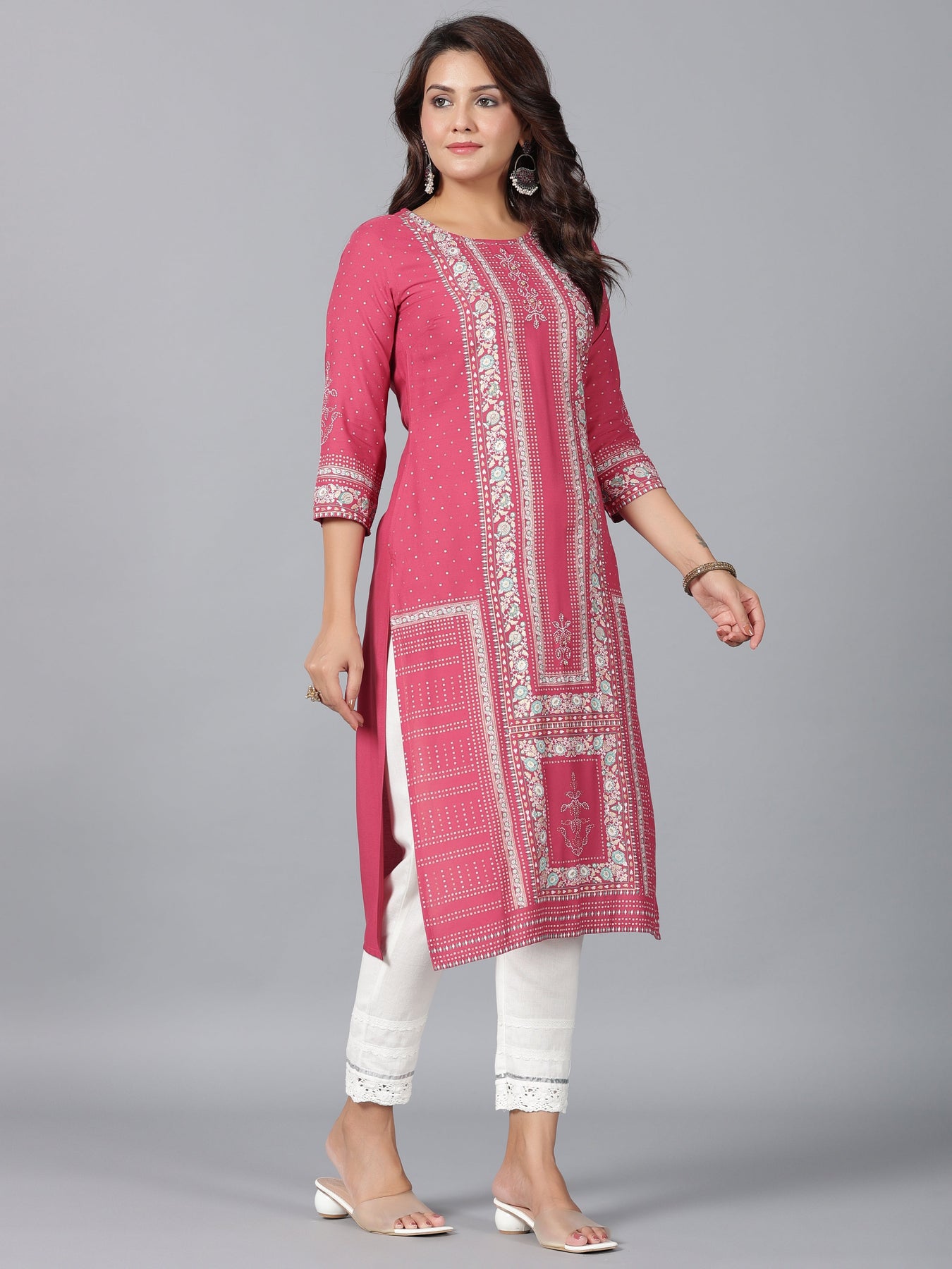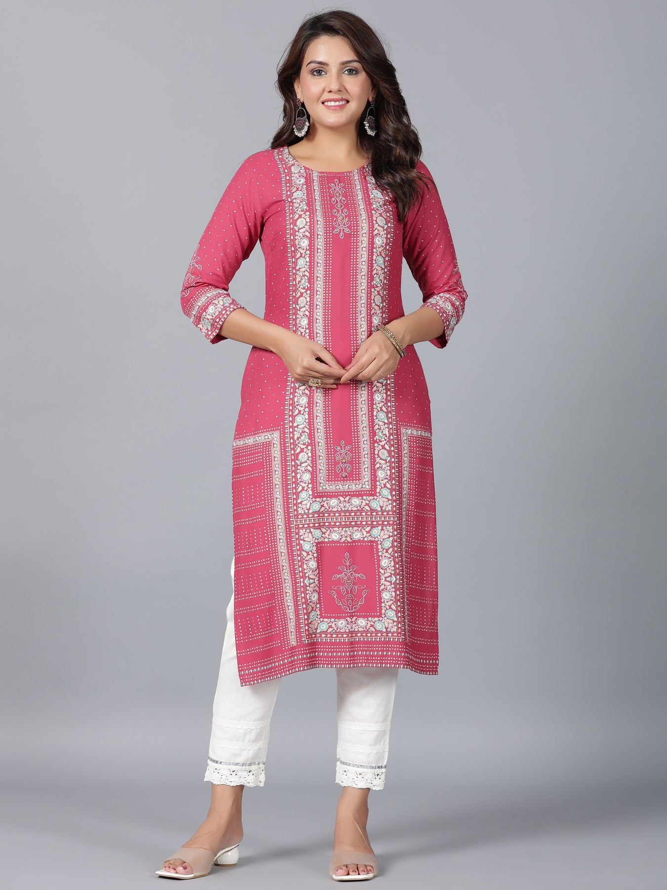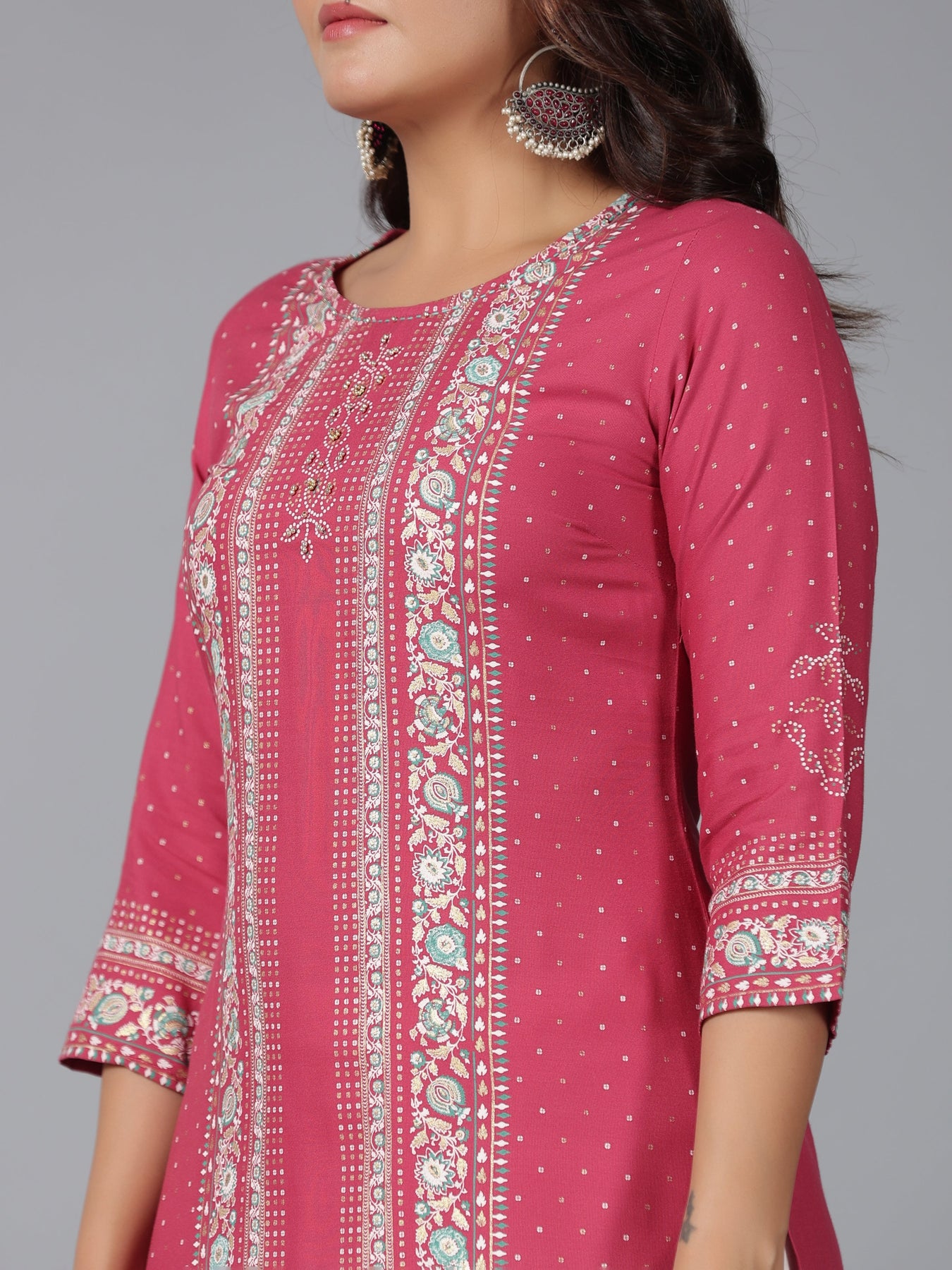 Mauve Rayon Printed Straight Kurta With Round Neck, Three Quarter Regular Sleeves And Beads Detailing On Yoke.