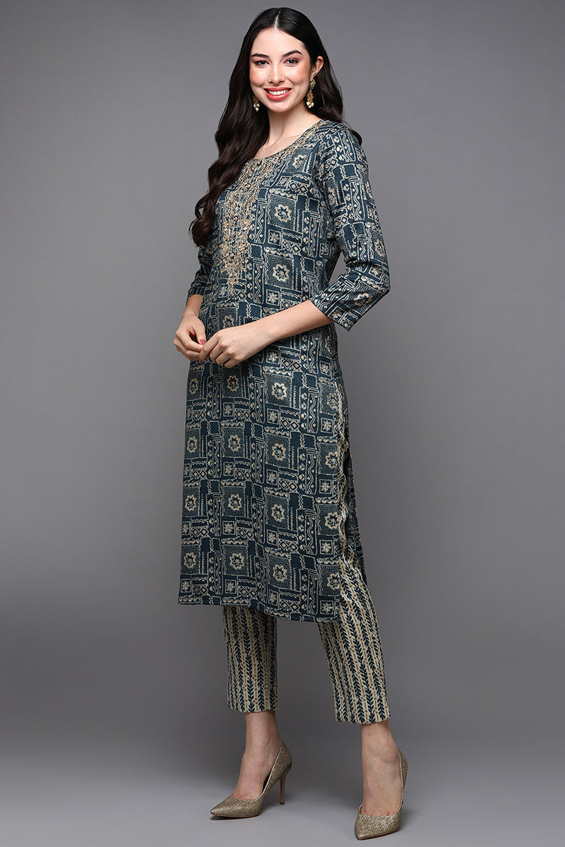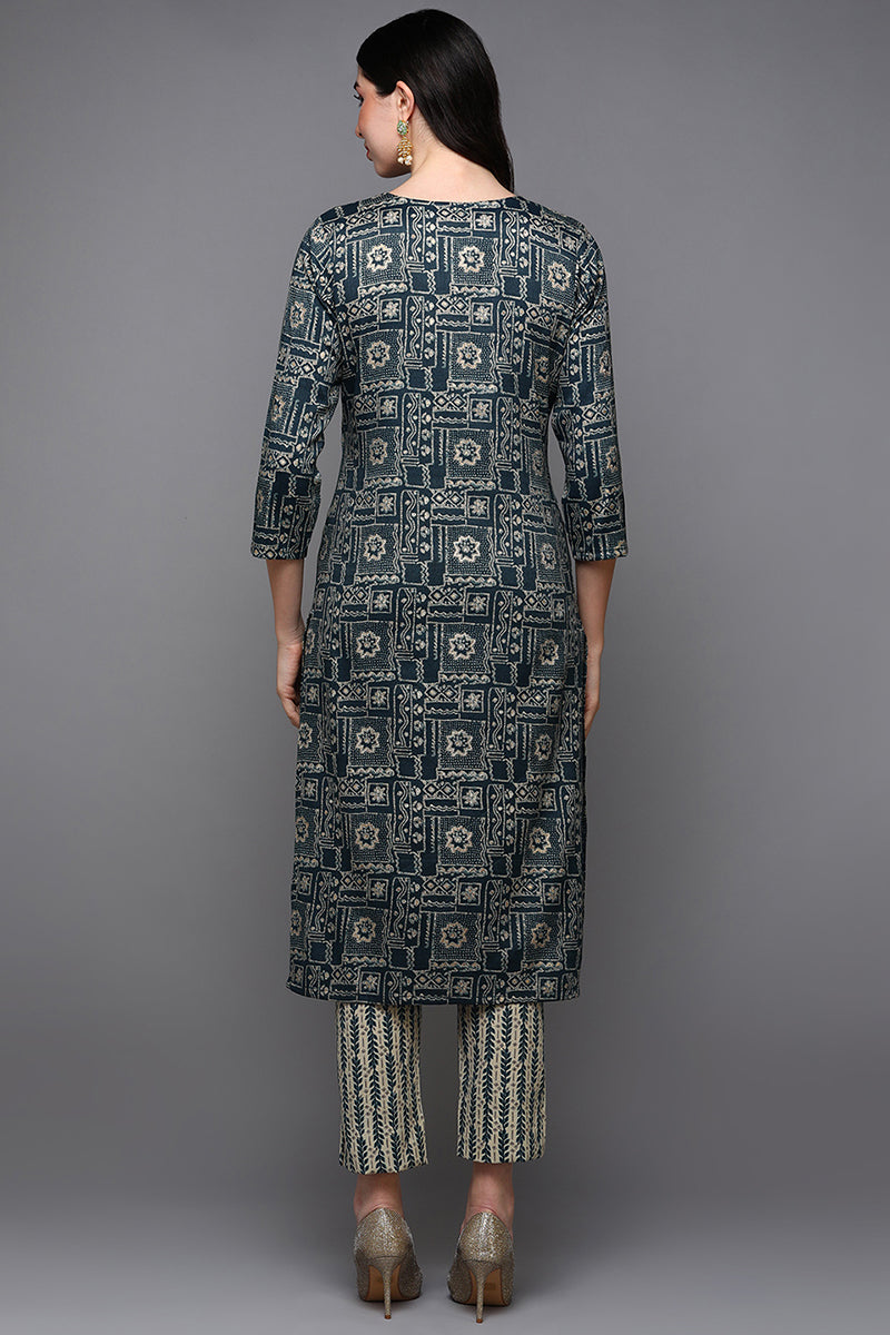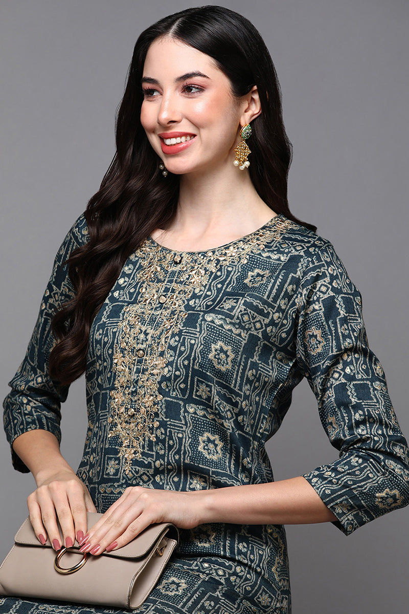 Women's Silk Blend Navy Blue Printed Regular Fit Kurta