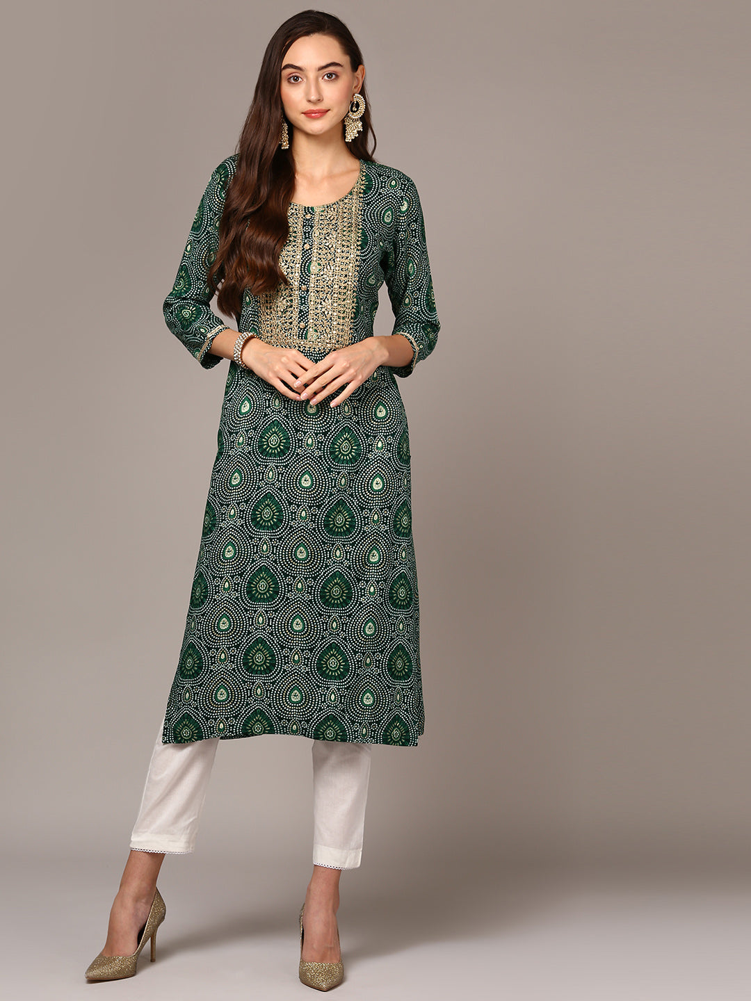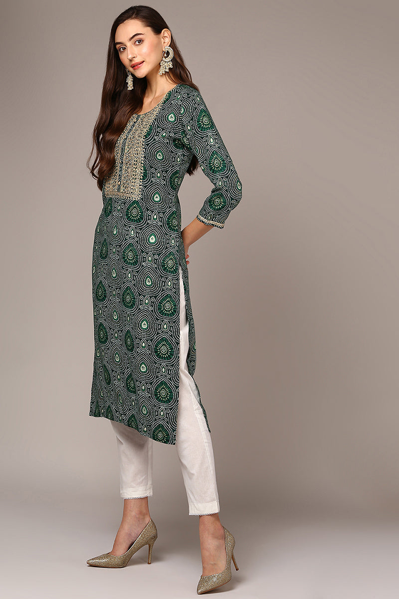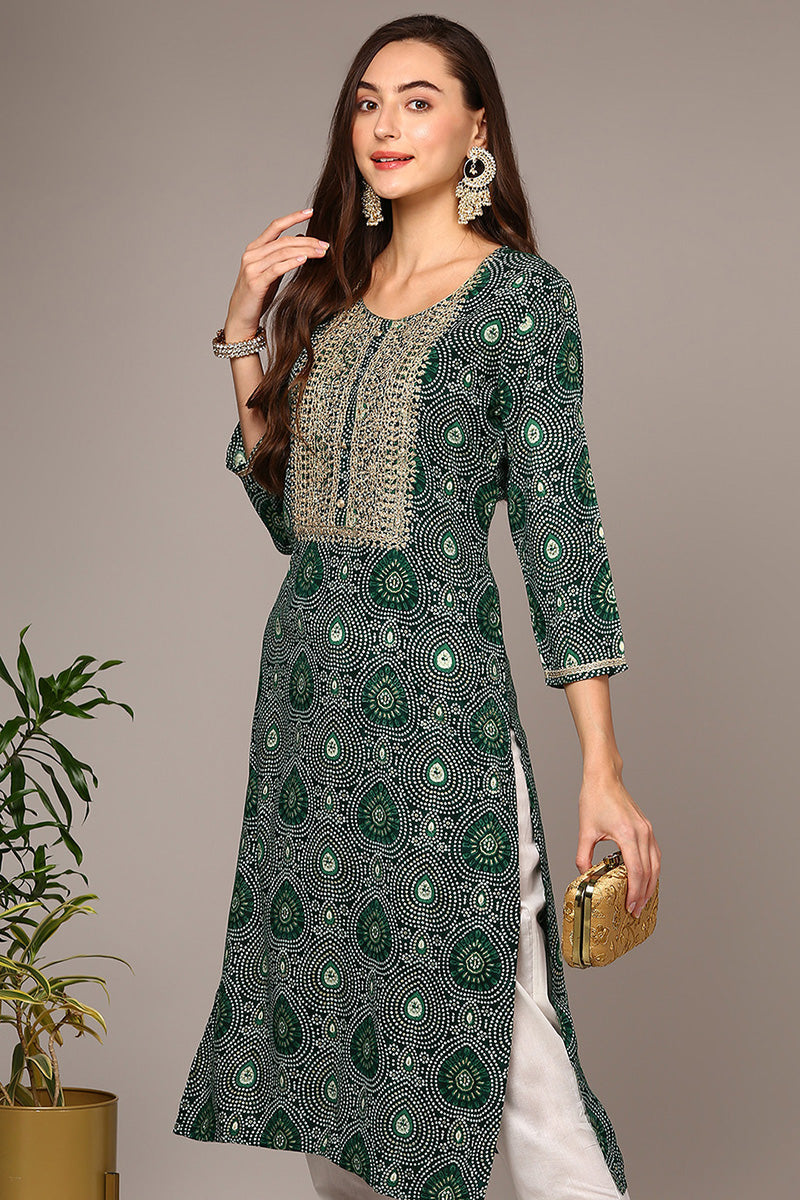 Women's Green Viscose Rayon Bandhani Regular Fit Kurta