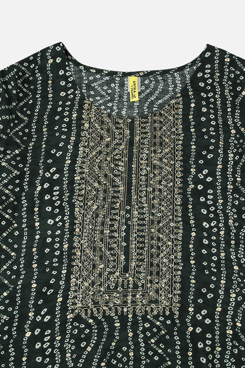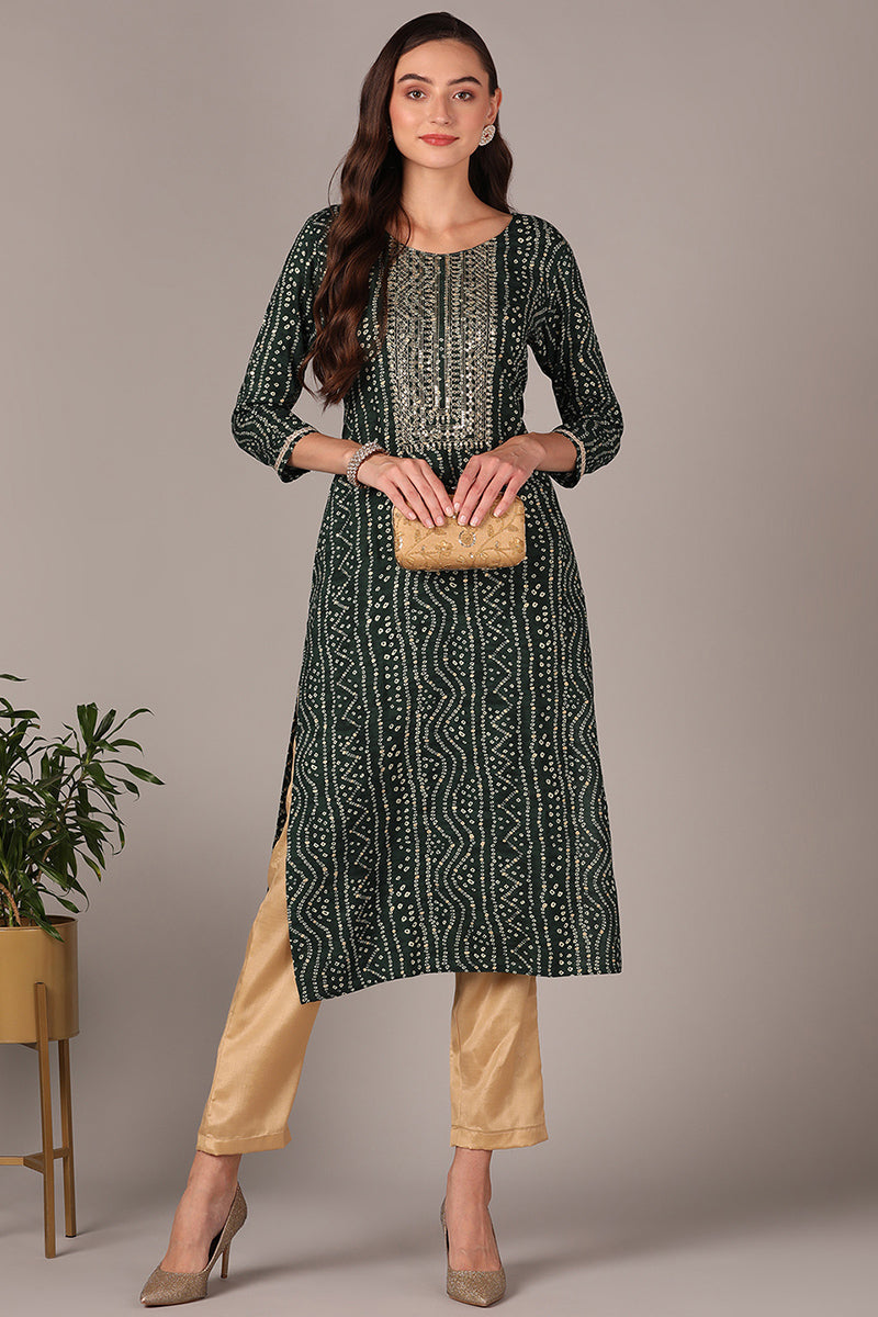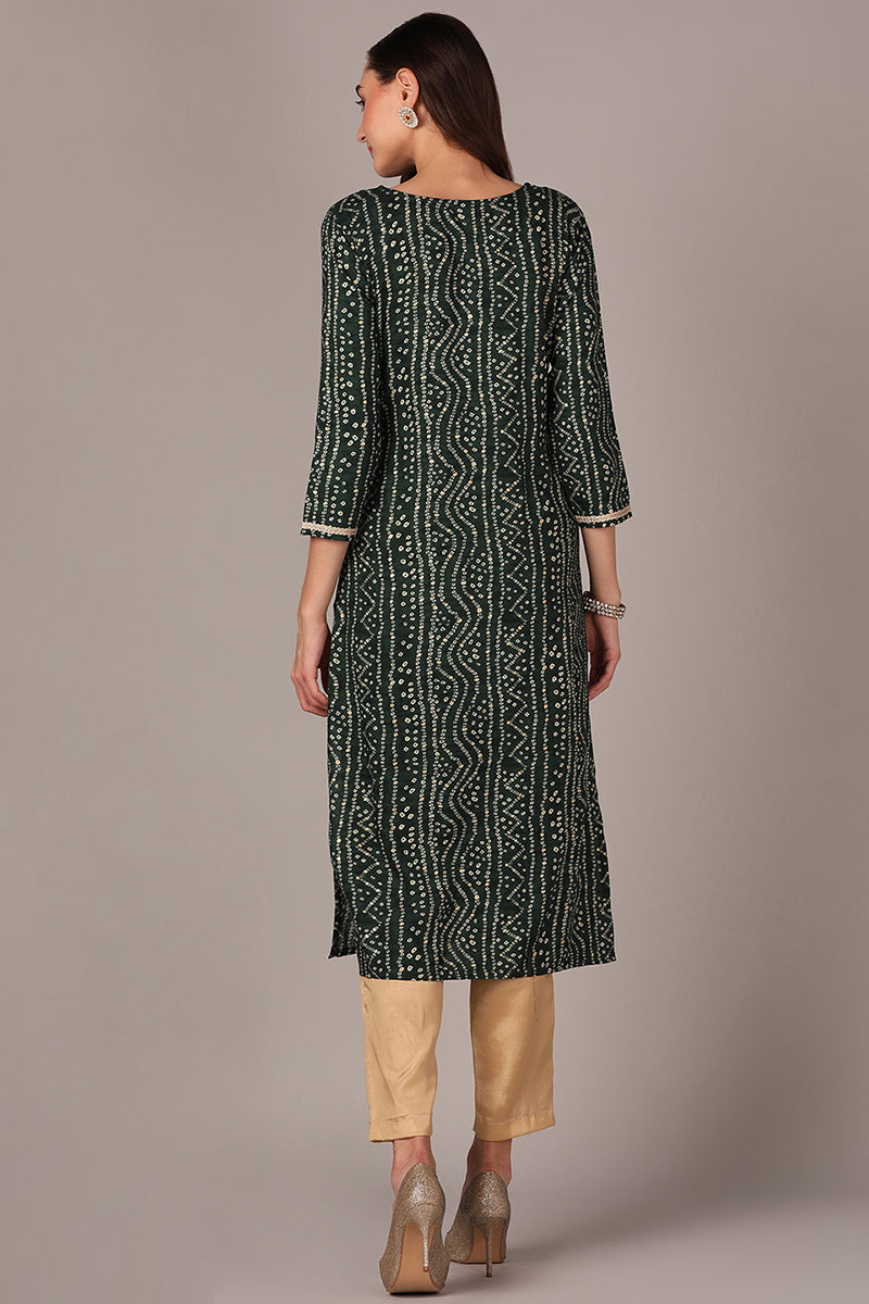 Women's Green Viscose Rayon Bandhani Embroidered Straight Kurta