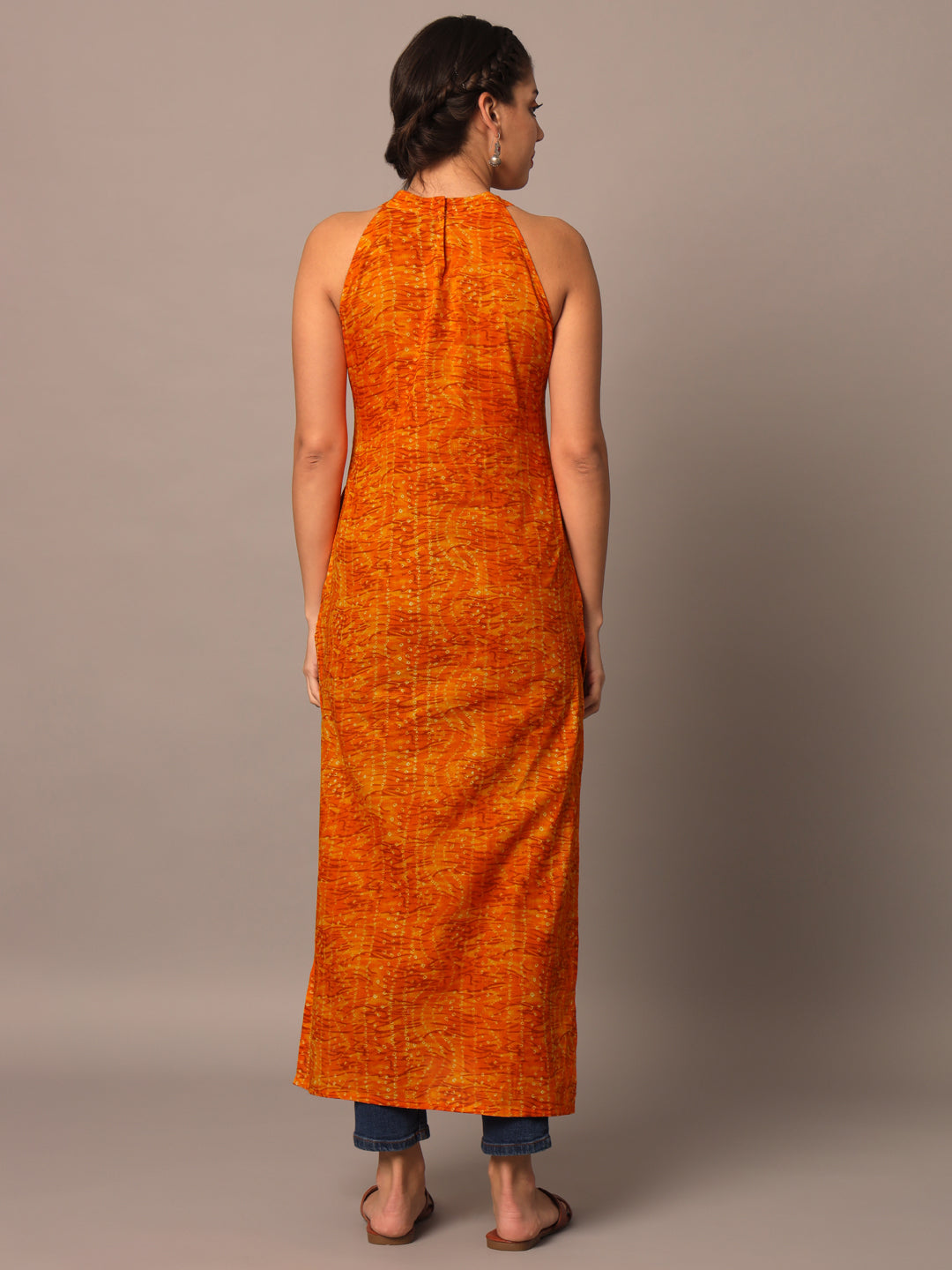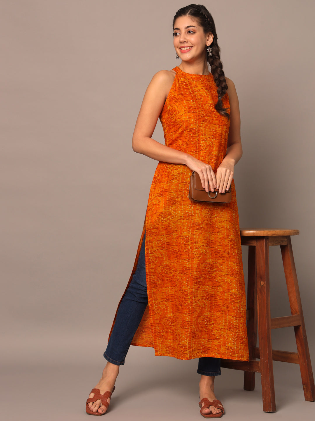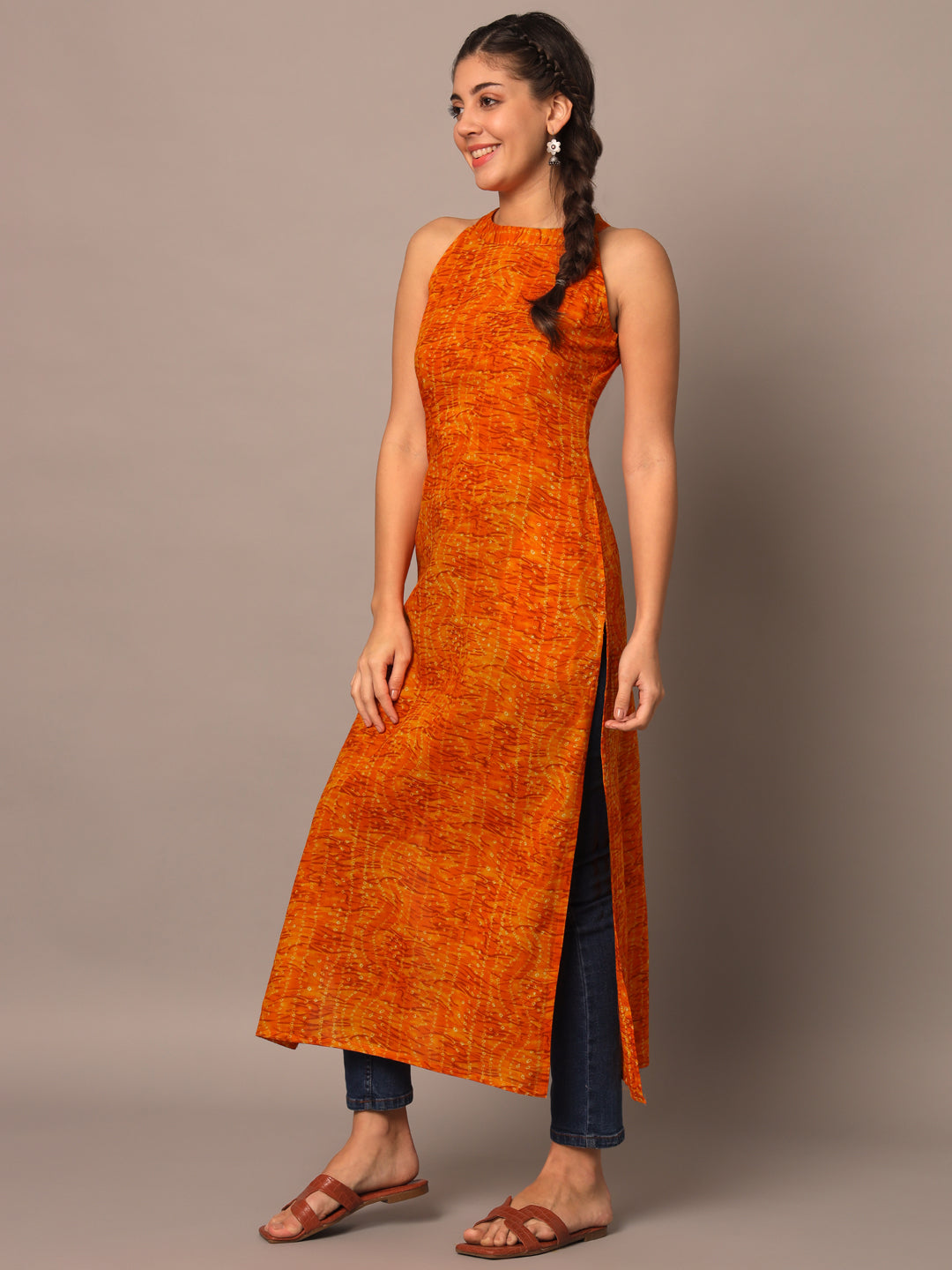 Women Yellow Bandhani Printed In Sleeveless Pattern With Turtle Neckline In Straight Calf Length Kurta