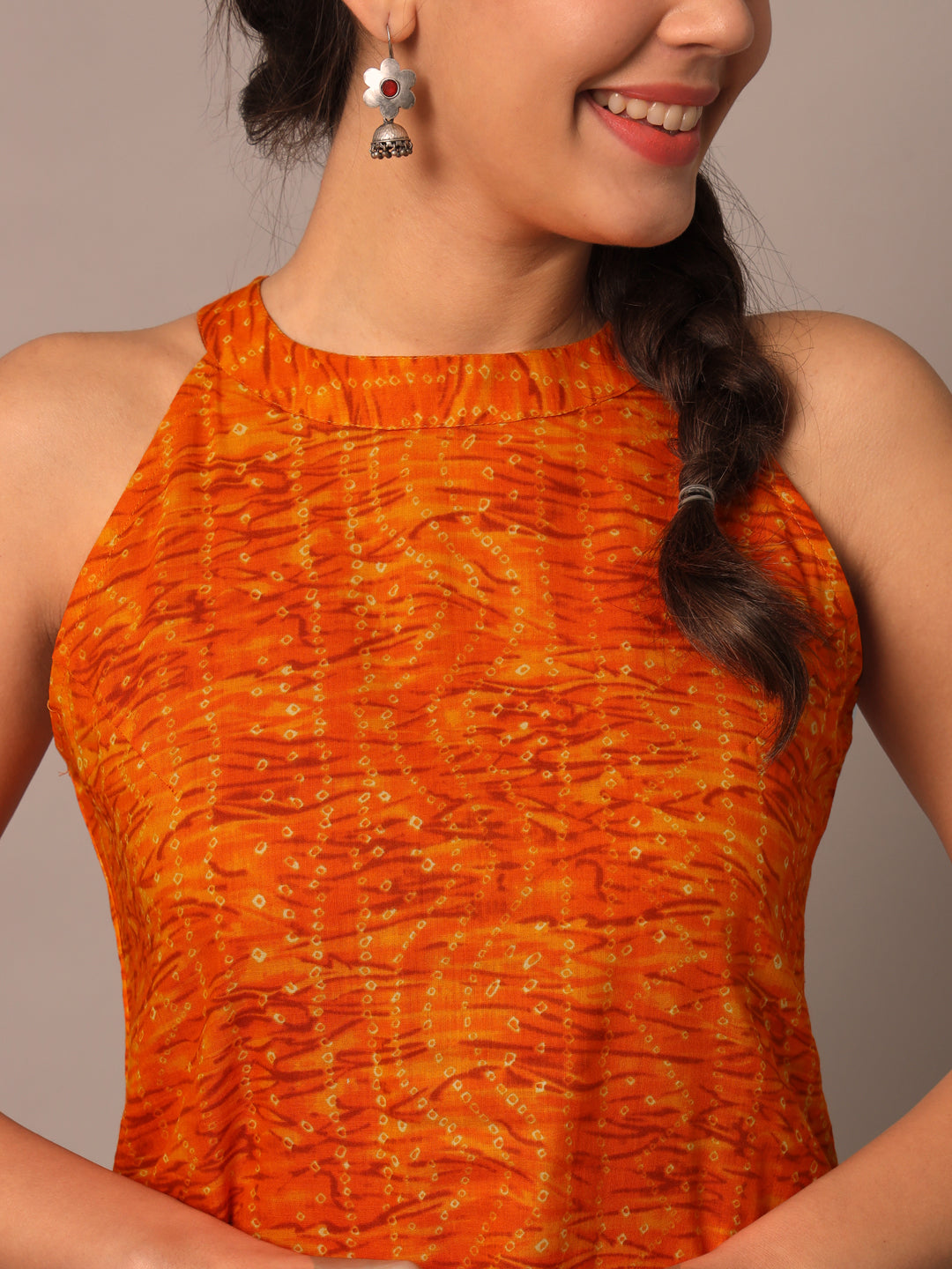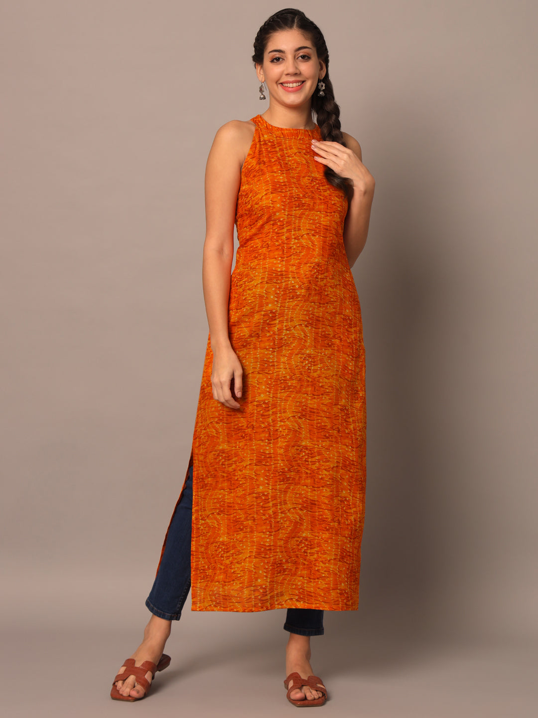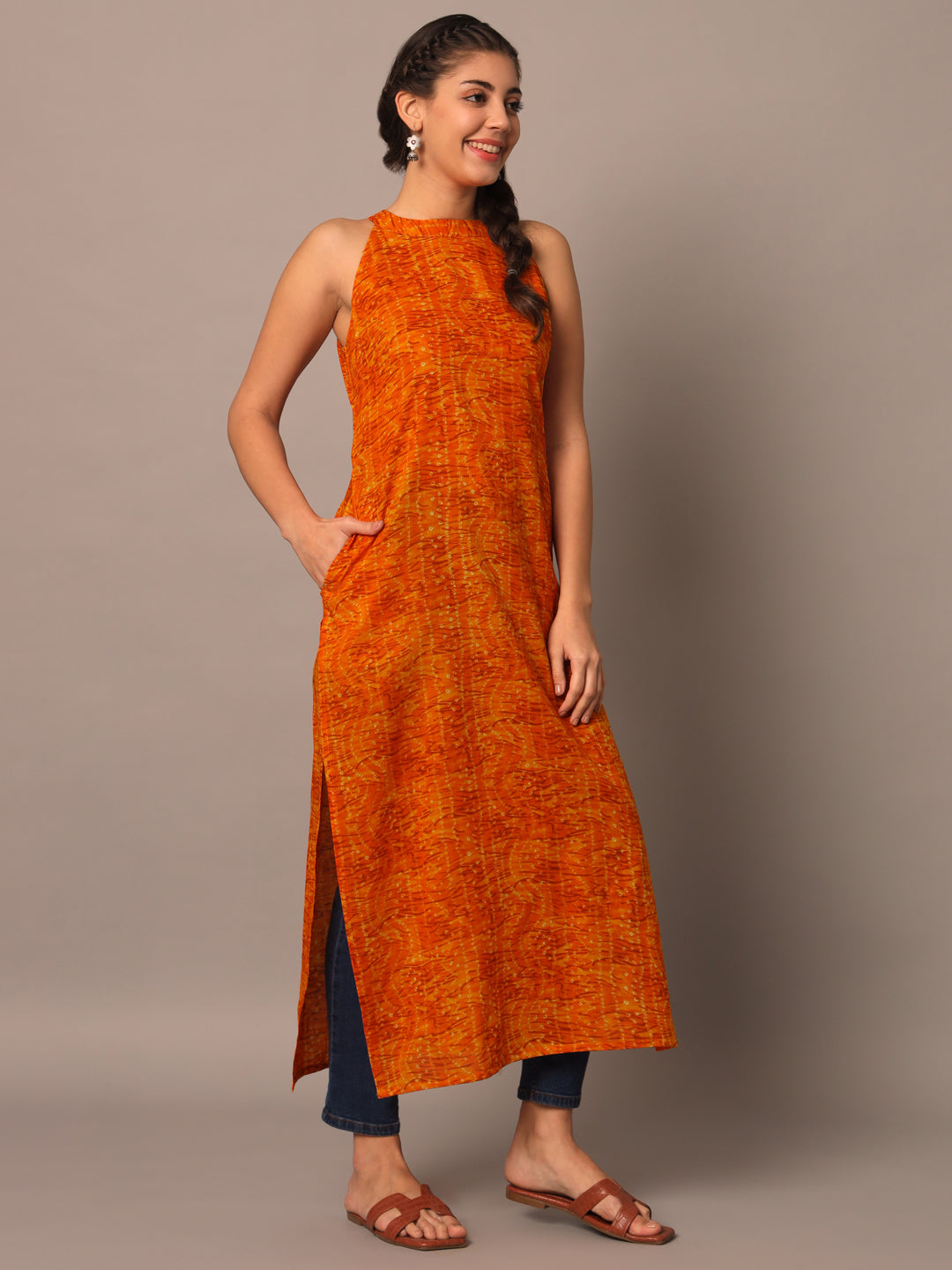 Women Yellow Bandhani Printed In Sleeveless Pattern With Turtle Neckline In Straight Calf Length Kurta