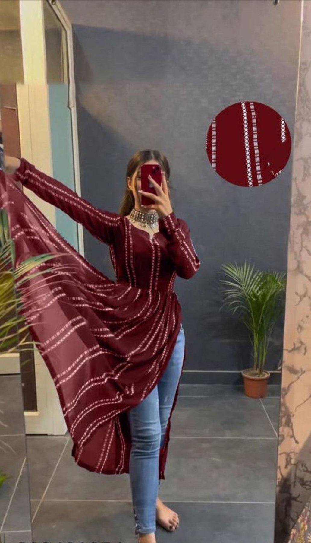 Top Details : Length :50 Inch Fabric :Butti Silk Color :Marron Work/Pattern :Digital Printed Neck Line :Round