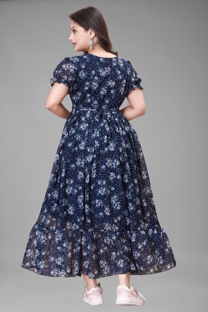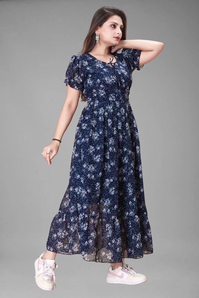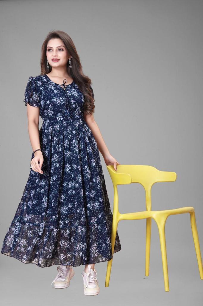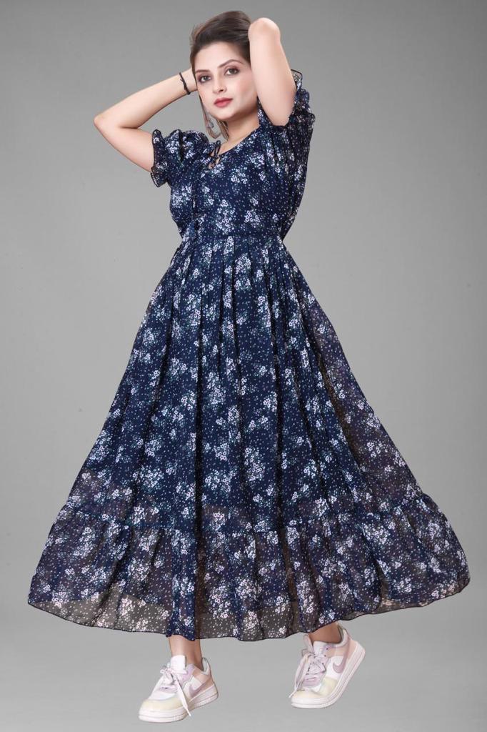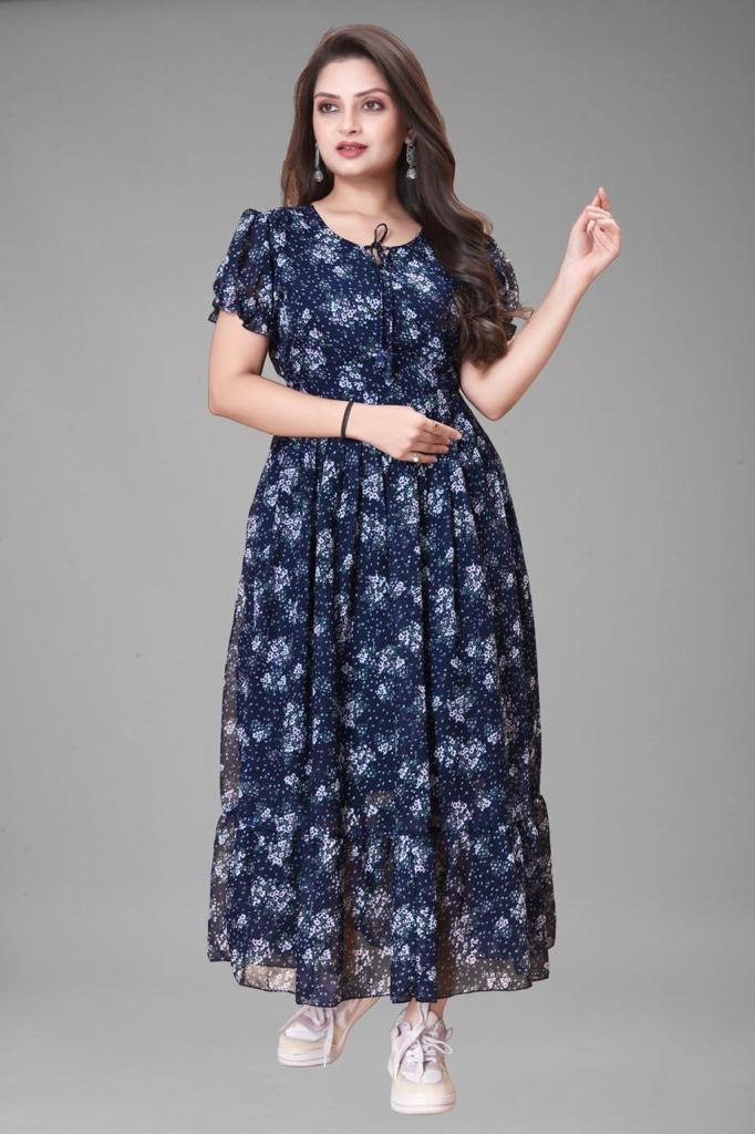 Top Details : Length :44 Inch Fabric :Georgette Color :Blue Work/Pattern :Digital Printed Neck Line :Round
