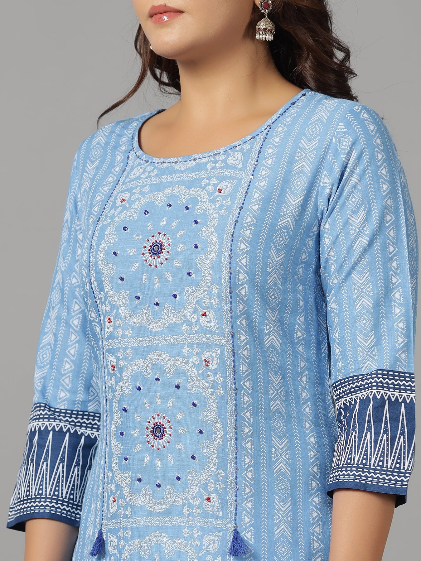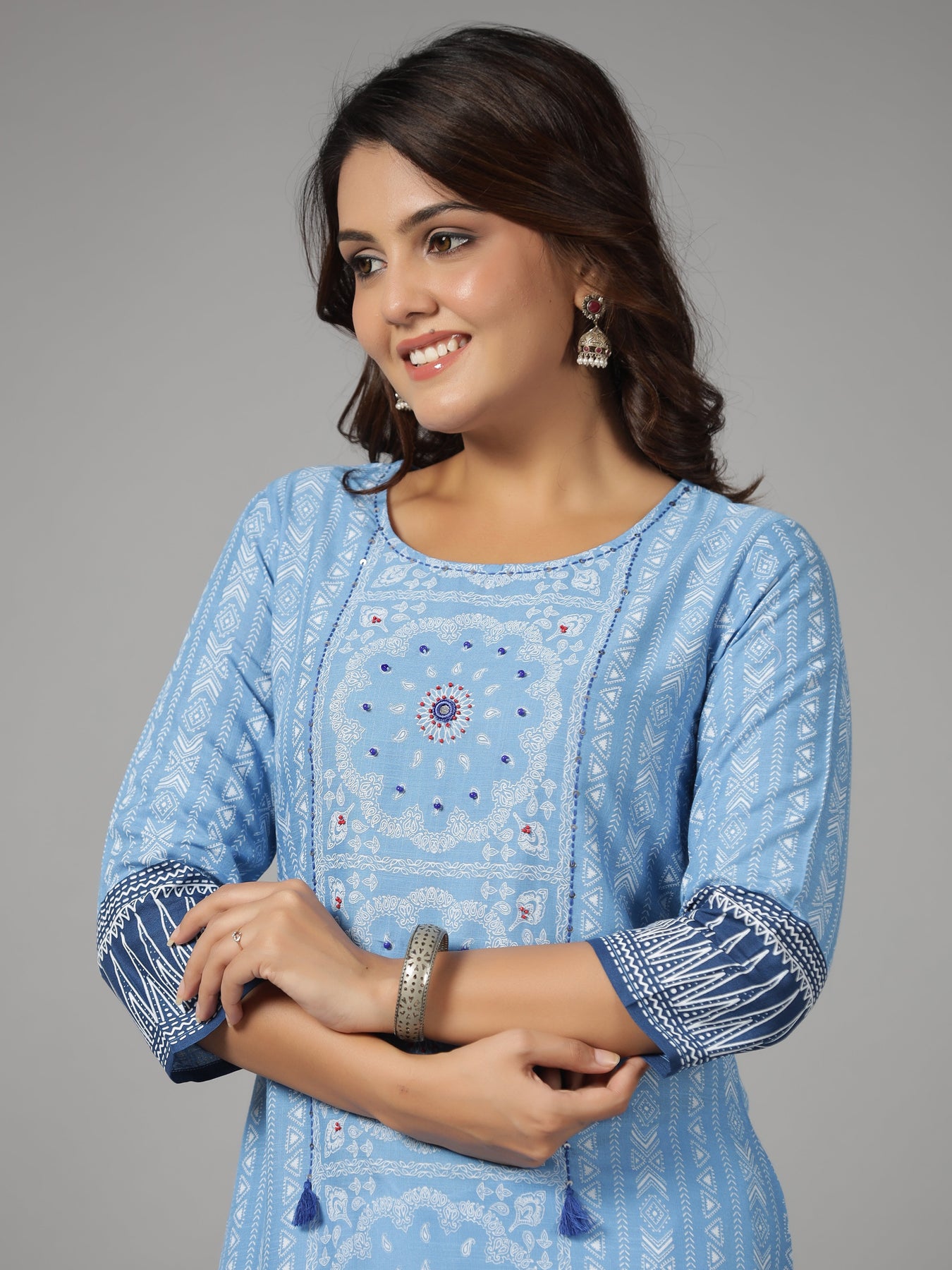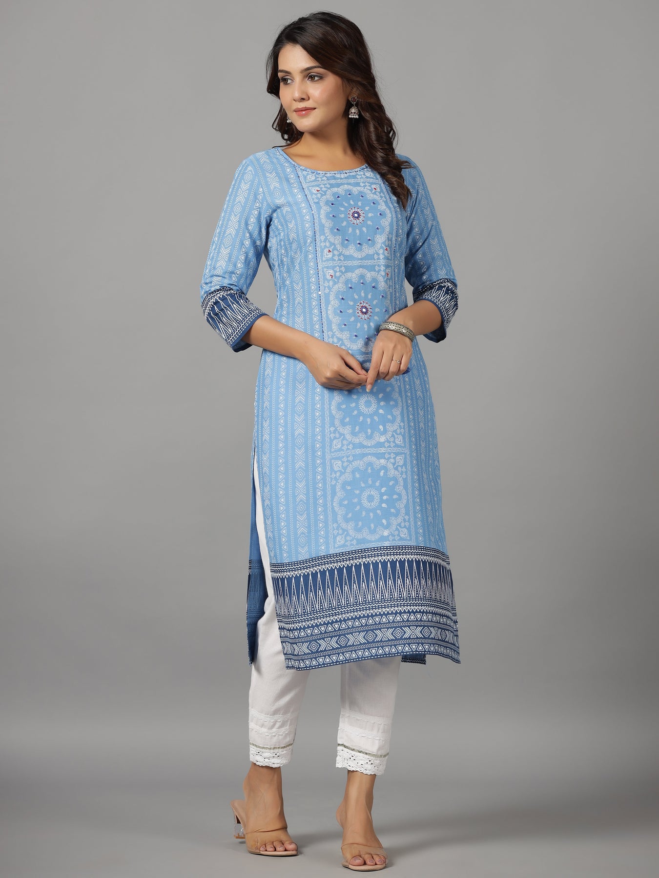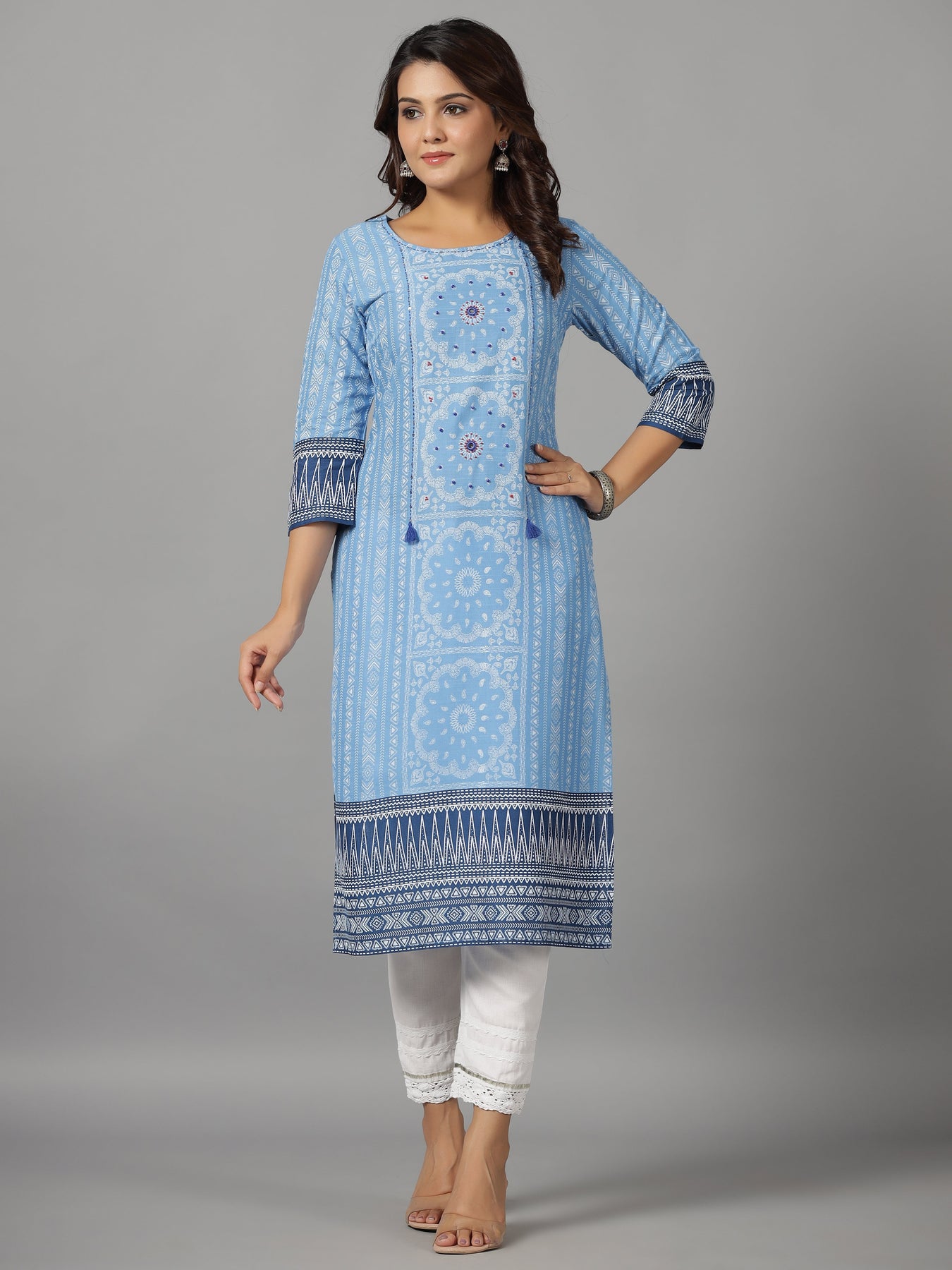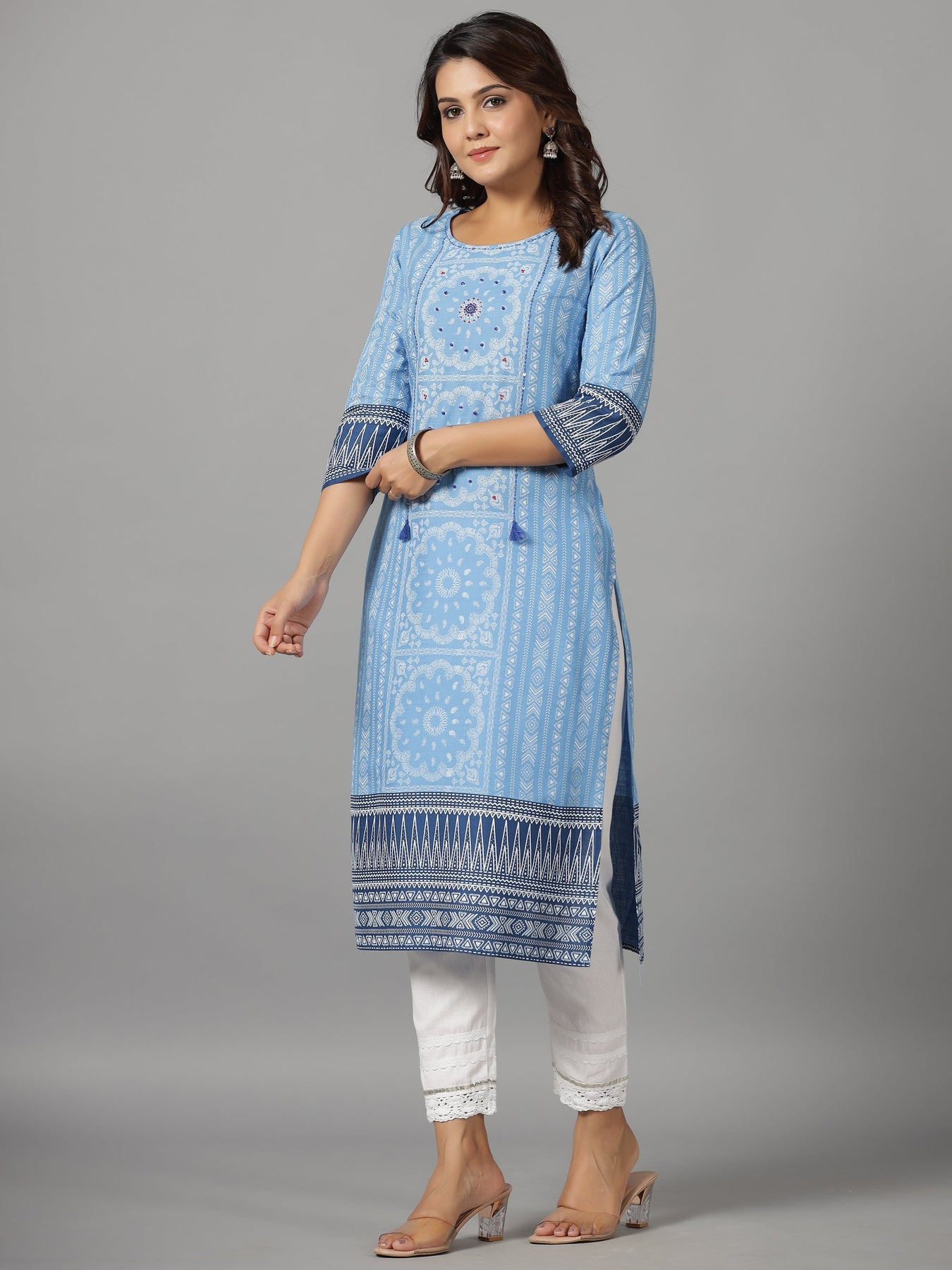 Sky Blue Rayon Slub Straight Kurta Adorned With Ethnic Motif Prints. Features A Round Neck, Three-Quarter Regular Sleeves, Calf-Length Straight Silhouette, Side Slits, Slip-On Style, And Embellished With Indie Prints And Beads.