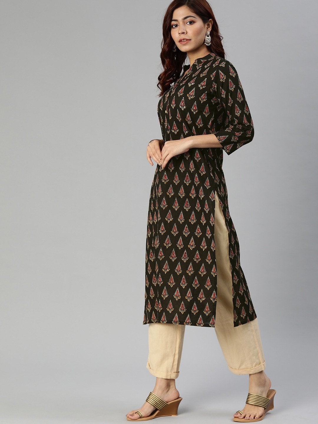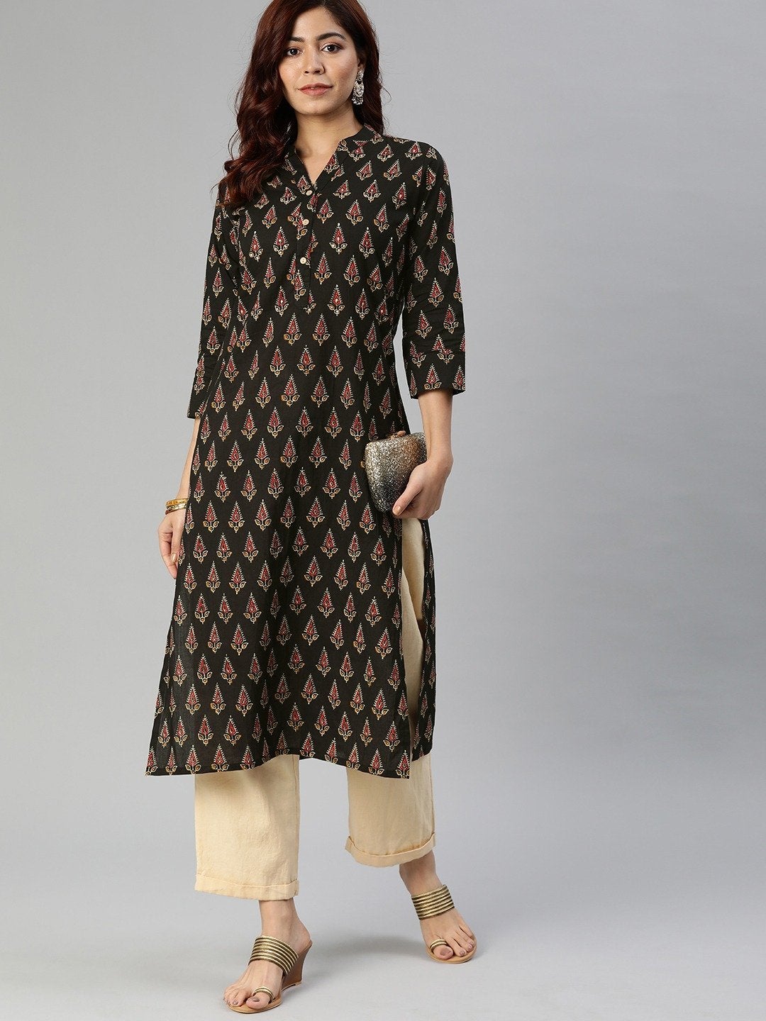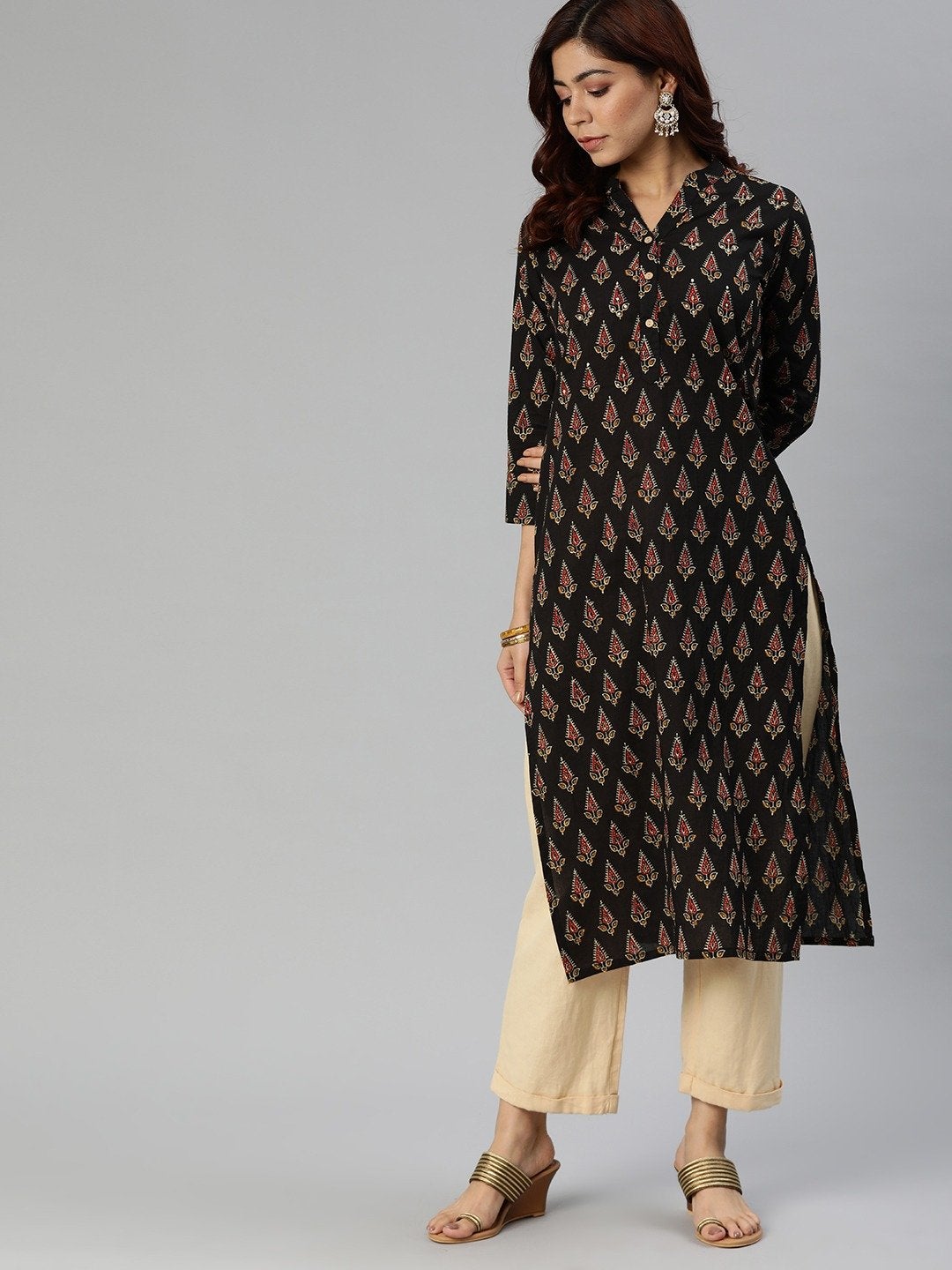 Define Ethnicity With This Gorgeous All Black Jaipuri Print Kurta With Sequin Work All Over The Neck Line And Upper Front, You Can Team It Up With Your Favorite Denim Or Straight Pants, Best Suited For Any Informal Occasion And Even Office Wear.