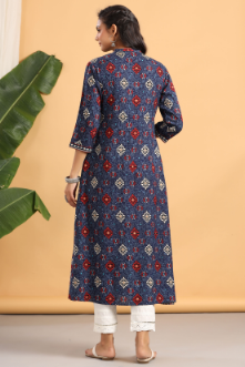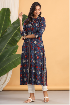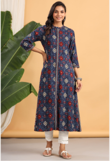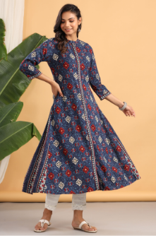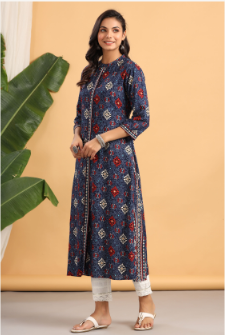 Juniper Women Indigo Rayon Printed A-Line Kurta perfect for fusion clothing with a traditional twist, trendy silhouette and latest styles