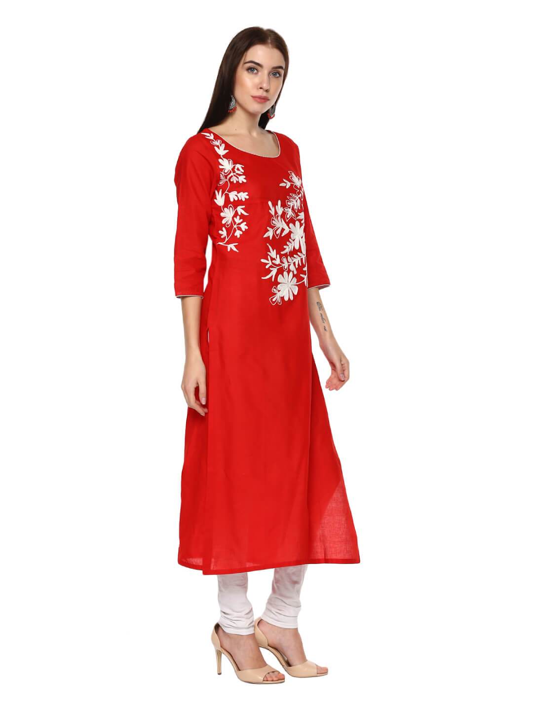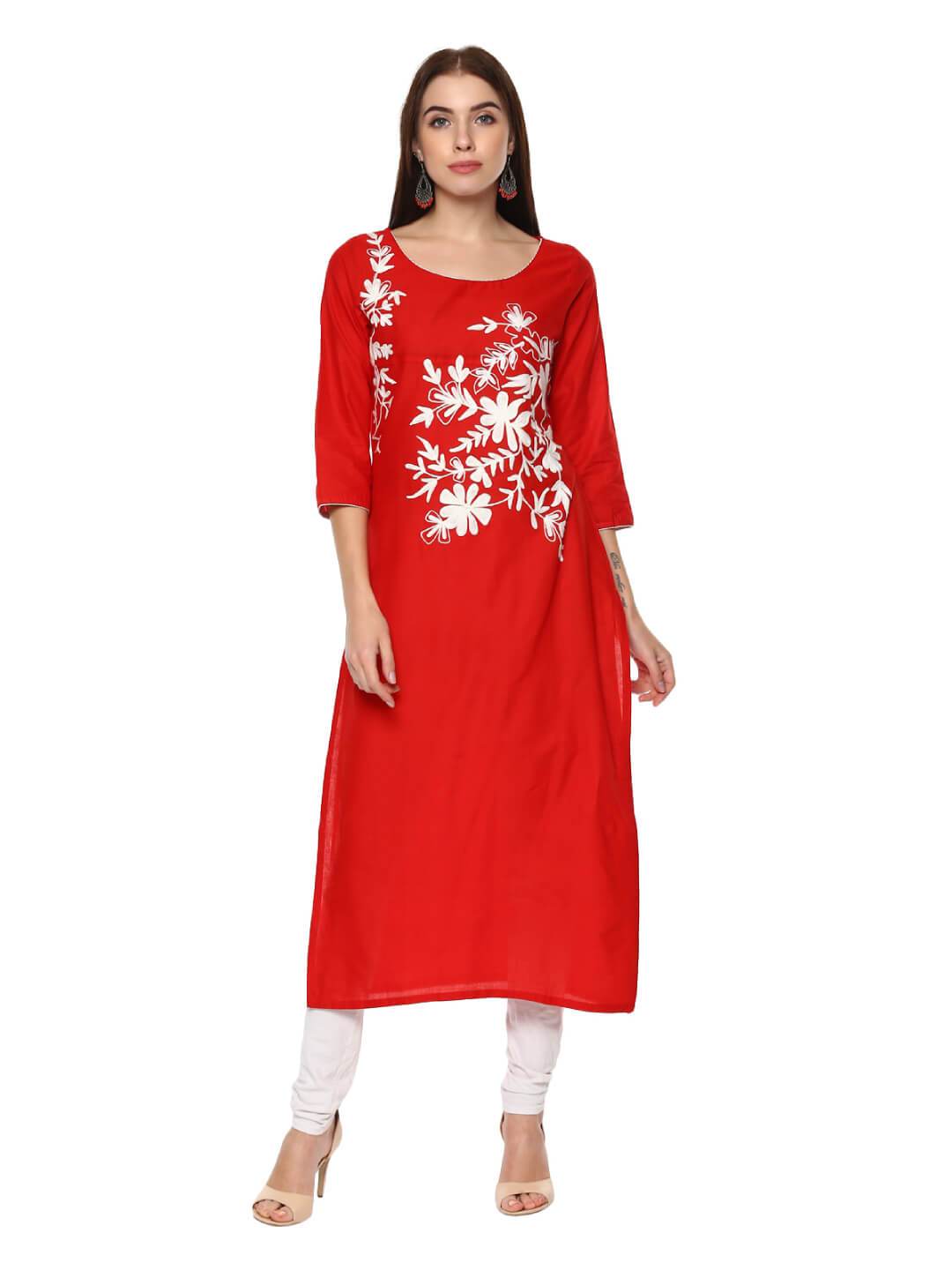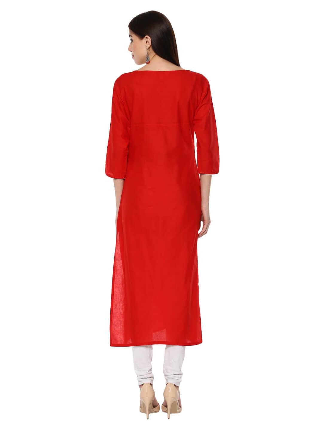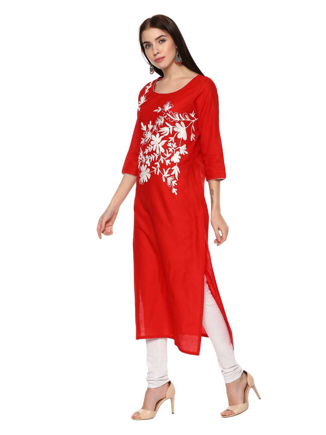 A Modern And Chique Bright Red Color Cotton Kurta, Featuring A Classic Round Neck, Three-Fourth Sleeves, And A Straight Silhouette. It Has Further Been Enhanced By Vibrant Contrast Hand Block Floral Prints Topped With Statement Golden Hand Blocked Foil Prints And Minimal Lace Detail.Inspiration:Inspired By The Beautiful Red Roses. "Inayat" Is A Mesmerizing Collection Of Refreshing Silhouettes To Entrust Your Style With A Surreal Charm."Styling Tipswhen To Wear: College, Professional Parties, Daily Wear, Offices.Bottom: White Leggings Or Palazzos (For Regular Outings) Or Style With Golden Or Turquoise Printed Dupattas For Parties And Get-Togethers Accessories: Long Earrings, Minimal Jhumkis, Studs, Or Simple Bracelets Will Give An Elegant Look. Footwear: Sandals, Mules, Wedges, Peep Toes Heels, Kolhapuriswash Care: Gentle Handwash, Don'T Bleach, Dry In Shade