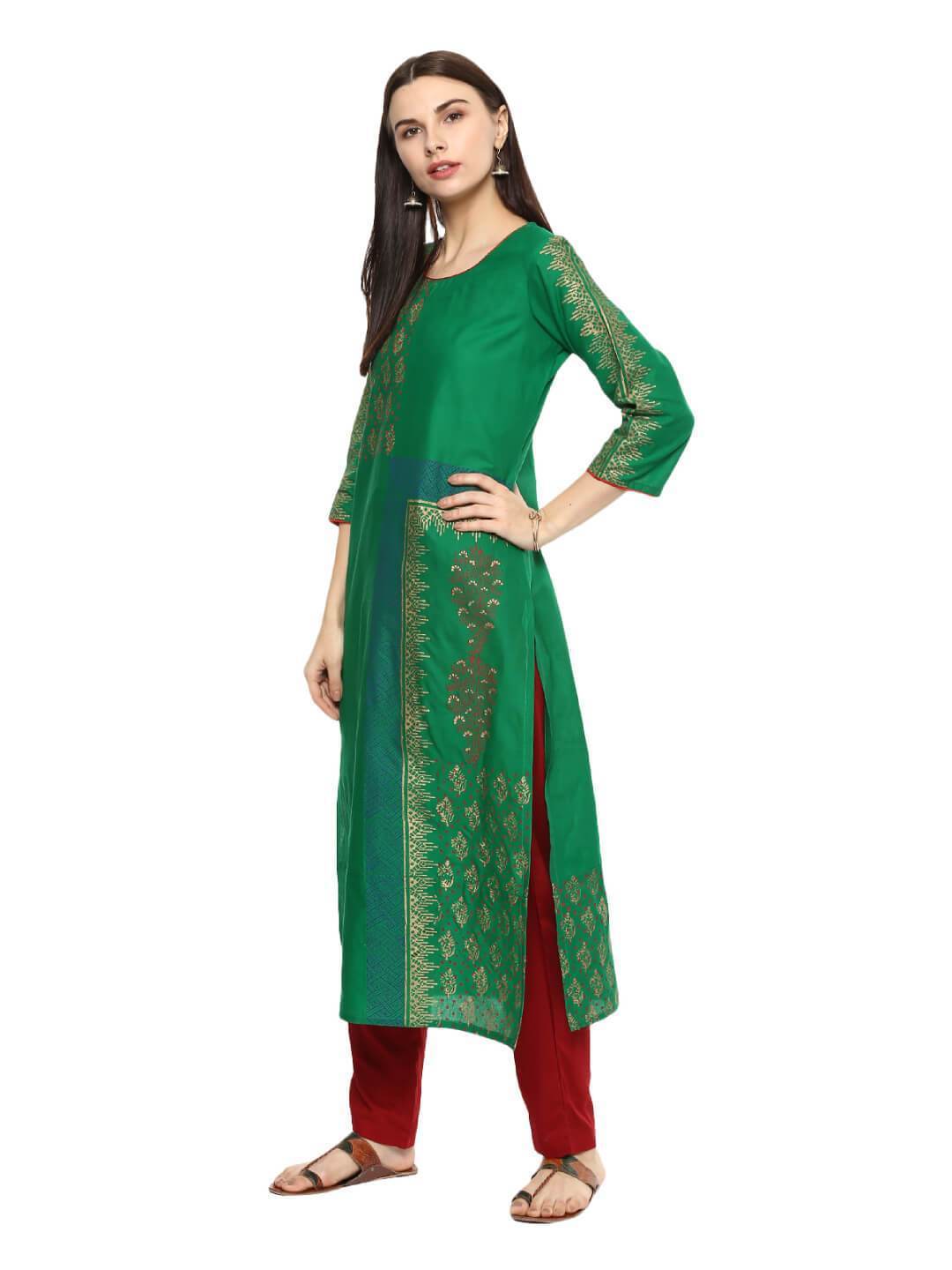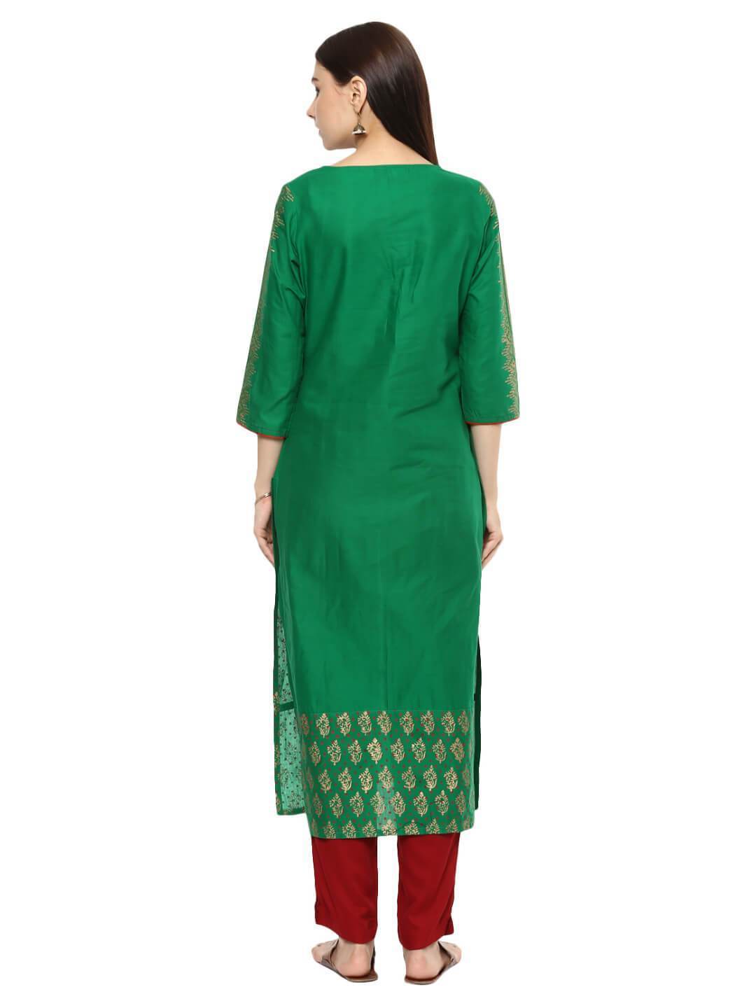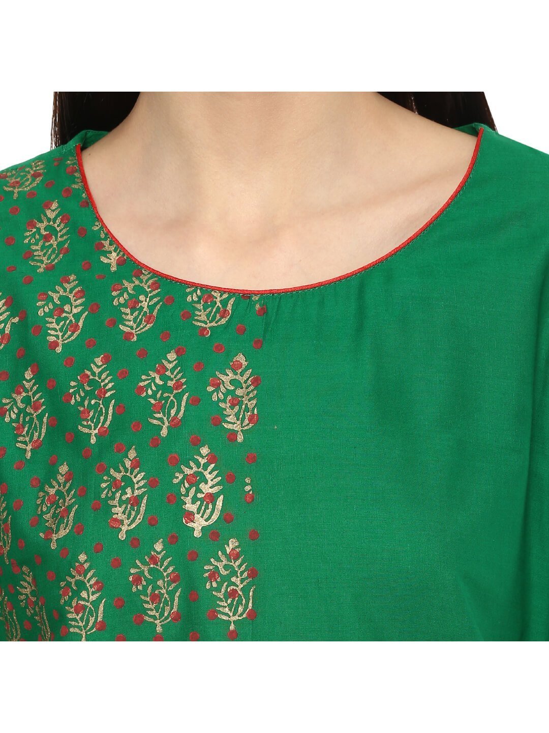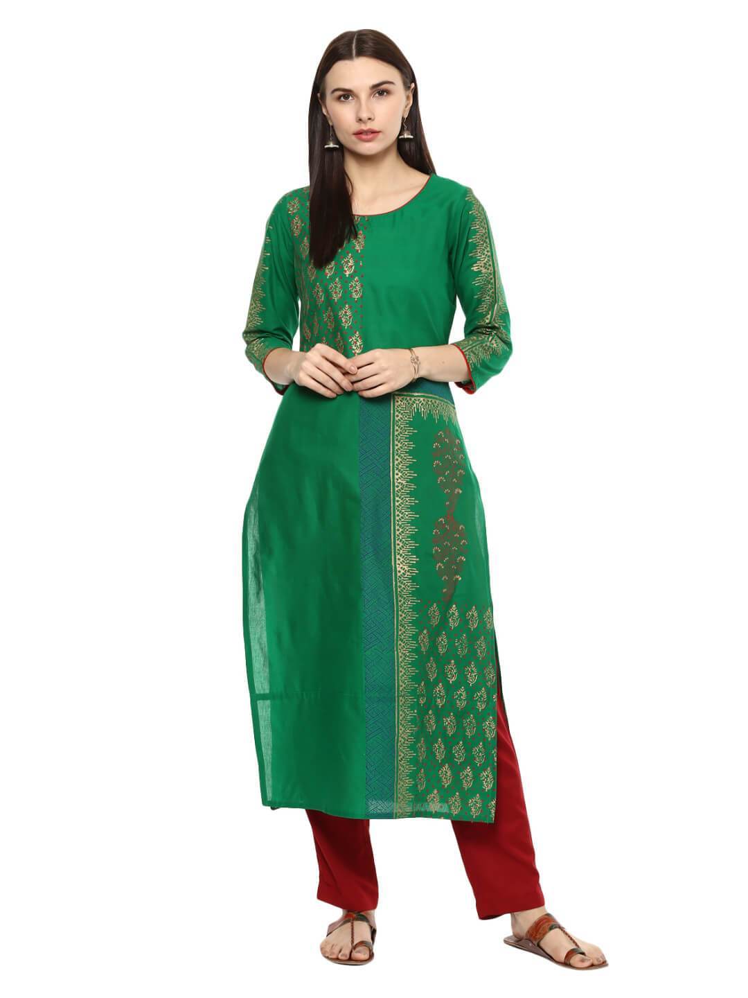 An Elegant Cotton Green Cotton Kurta Featuring A Basic Round Neckline, Three-Fourth Sleeves And A Straight Silhouette. It Has Further Been Enhanced By Subtle Floral Hand Block Prints Topped With Creatively Placed Golden Foil Prints.Inspired By The Rhythemic Movements Of A Luscious Forests "Noor Is A Mesmerizing Collection Of Refreshing Silhouettes To Entrust Your Style With A Surreal Charm."Styling Tipswhen To Wear: College, Professional Parties, Daily Wear, Offices.Bottom:Blue Or Red (For Regular Outings) Or Style With A Golden Or Blue Brocade Dupatta For Parties And Get Togethers Accessories: Long Earrings,Minimal Jhumkis, Studs Or Simple Bracelet Will Give An Elegant Look. Footwear: Sandals, Mules, Wedges, Peep Toes Heels, Kolhapuriswash Care: Gentle Handwash, Don'T Bleach, Dry In Shadenote: This Product Doesn'T Come With Bottoms Or Any Other Accessories