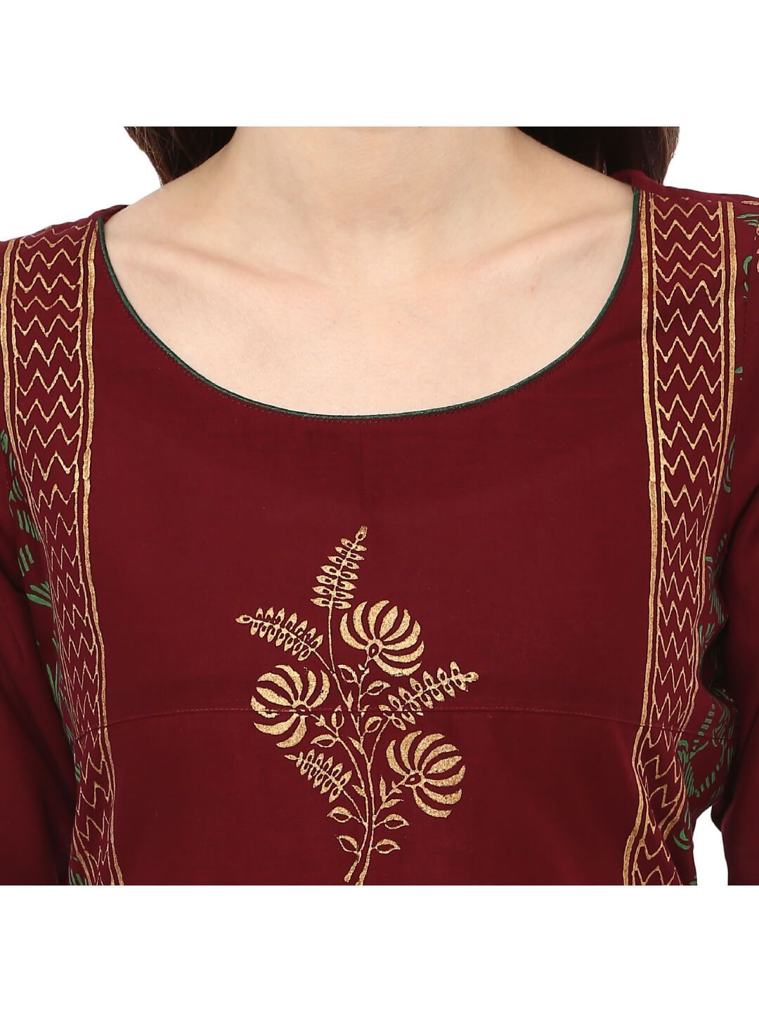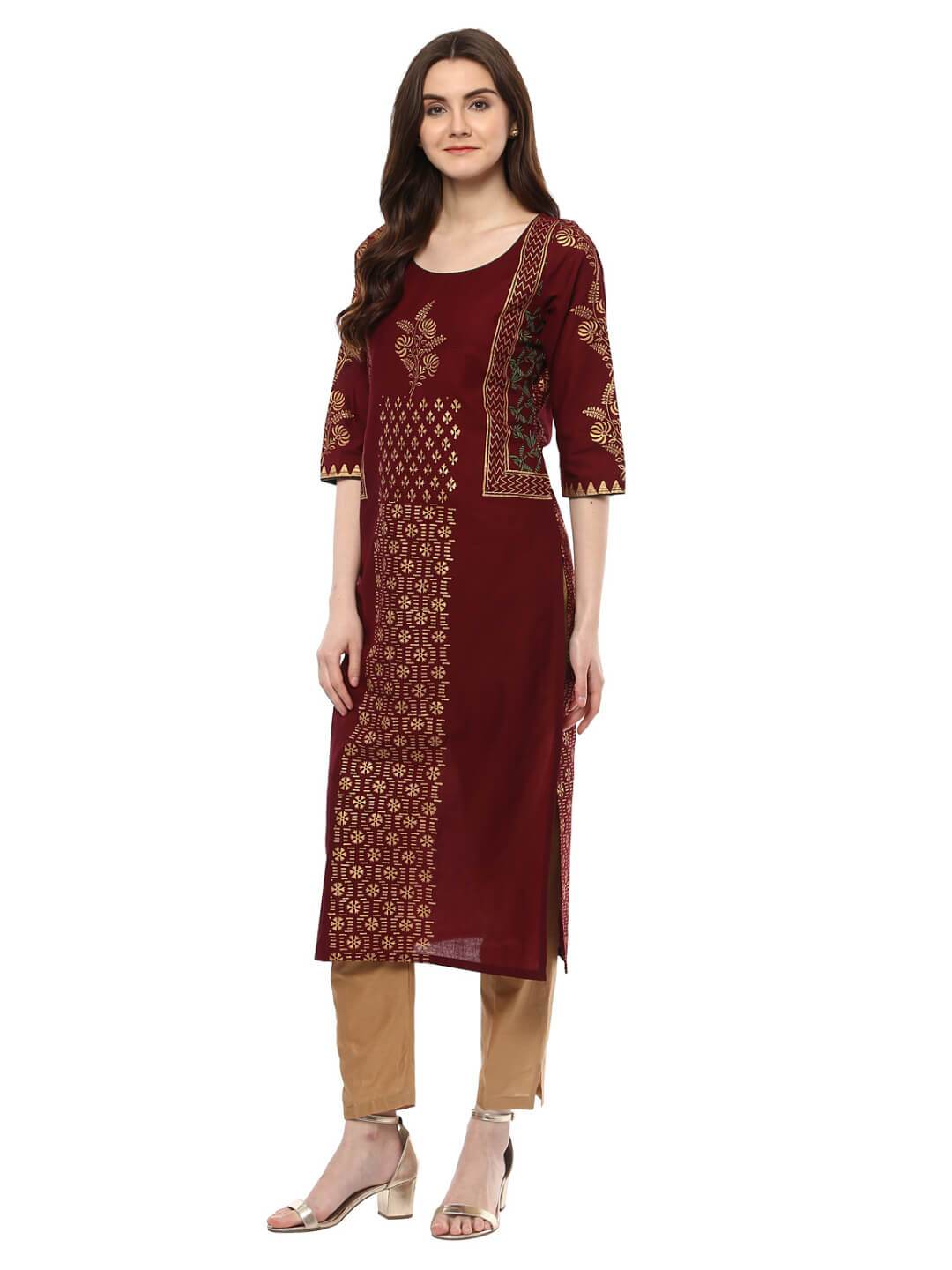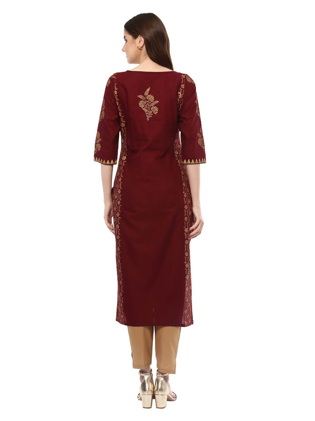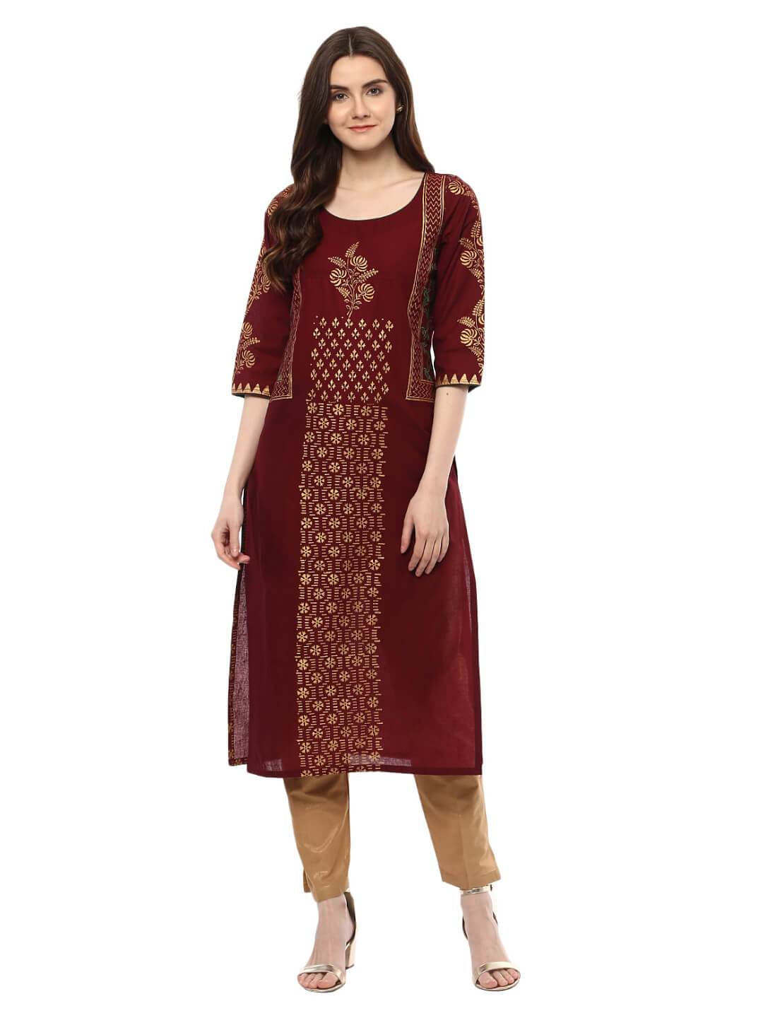 A Festive Maroon Cotton Kurta, Featuring A Classic Round Neck, Three-Fourth Sleeves, And A Straight Silhouette. It Has Further Been Enhanced By Creatively Placed, Statement Golden Foil Hand-Blocked Prints.Inspiration:Inspired By The Beautiful Sky At The Dawn. "Noor" Is A Mesmerizing Collection Of Refreshing Silhouettes To Entrust Your Style With A Surreal Charm."Styling Tipswhen To Wear: College, Professional Parties, Daily Wear, Offices.Bottom: Beige Leggings Or Palazzos (For Regular Outings) Or Style With Golden Dupattas For Parties And Get-Togethers Accessories: Long Earrings, Minimal Jhumkis, Studs, Or Simple Bracelet Will Give An Elegant Look. Footwear: Sandals, Mules, Wedges, Peep Toes Heels, Kolhapuriswash Care: Gentle Handwash, Don'T Bleach, Dry In Shadenote: This Product Doesn'T Come With Bottoms Or Any Other Accessories.