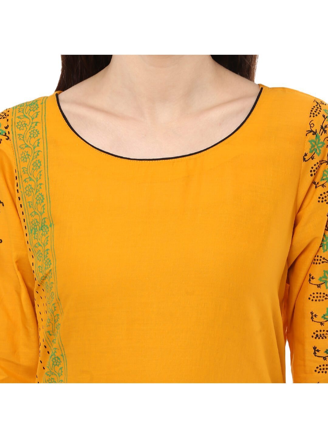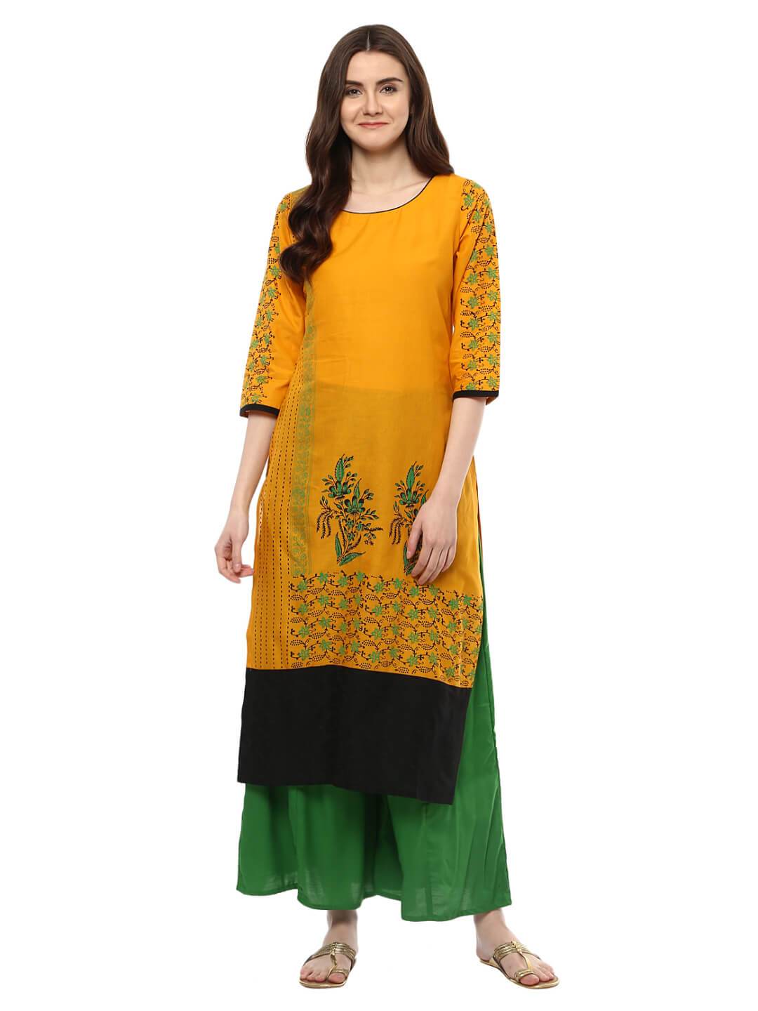 A Young And Refreshing Mustard Cotton Kurta Featuring A Classic Round Neckline, Three-Fourth Sleeves, And A Straight Silhouette. It Has Further Been Enhanced By Vibrant Contrast And Creatively Placed Hand-Blocked Floral Print, Topped With Minimal Lacework.