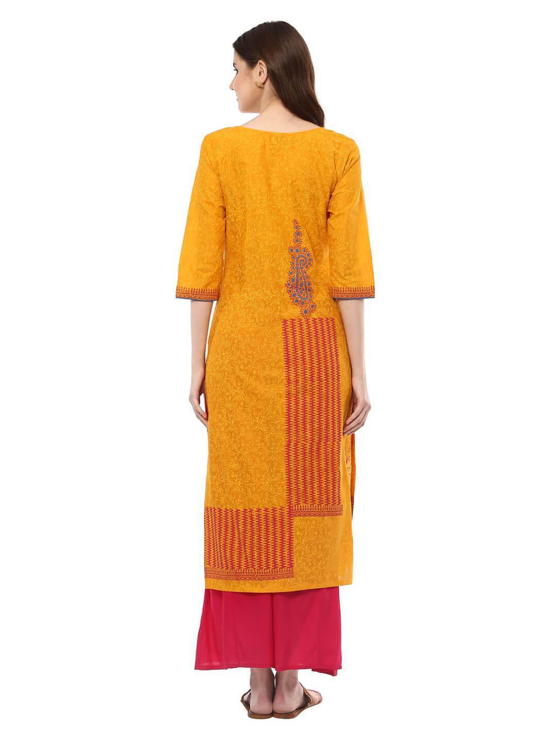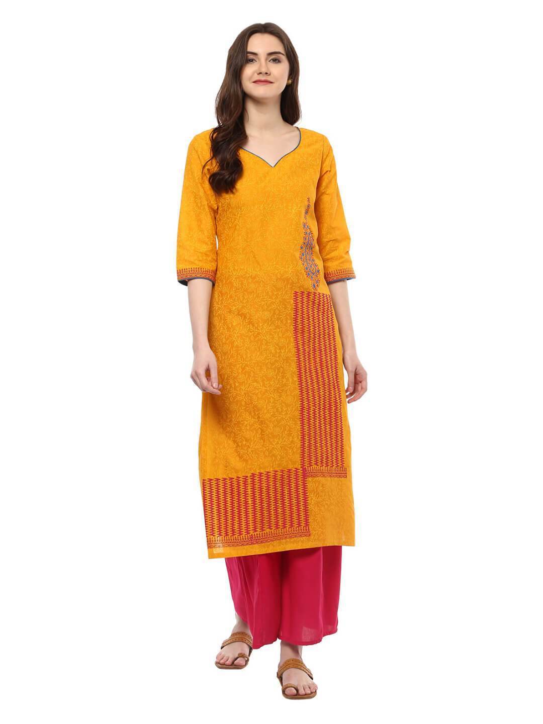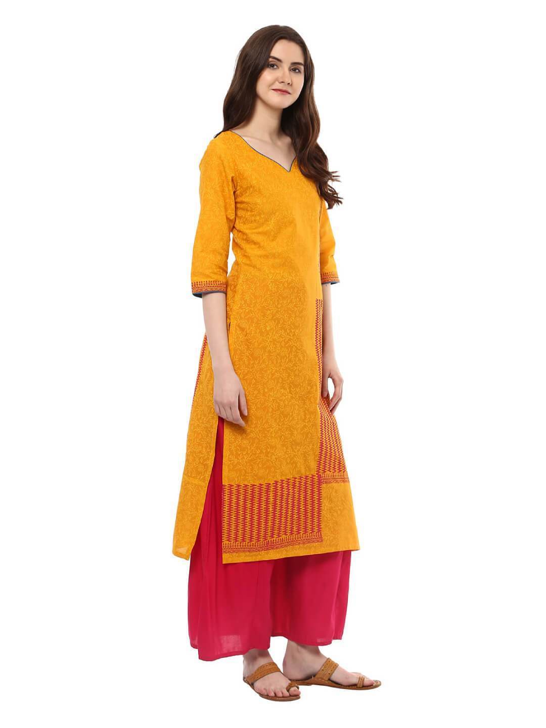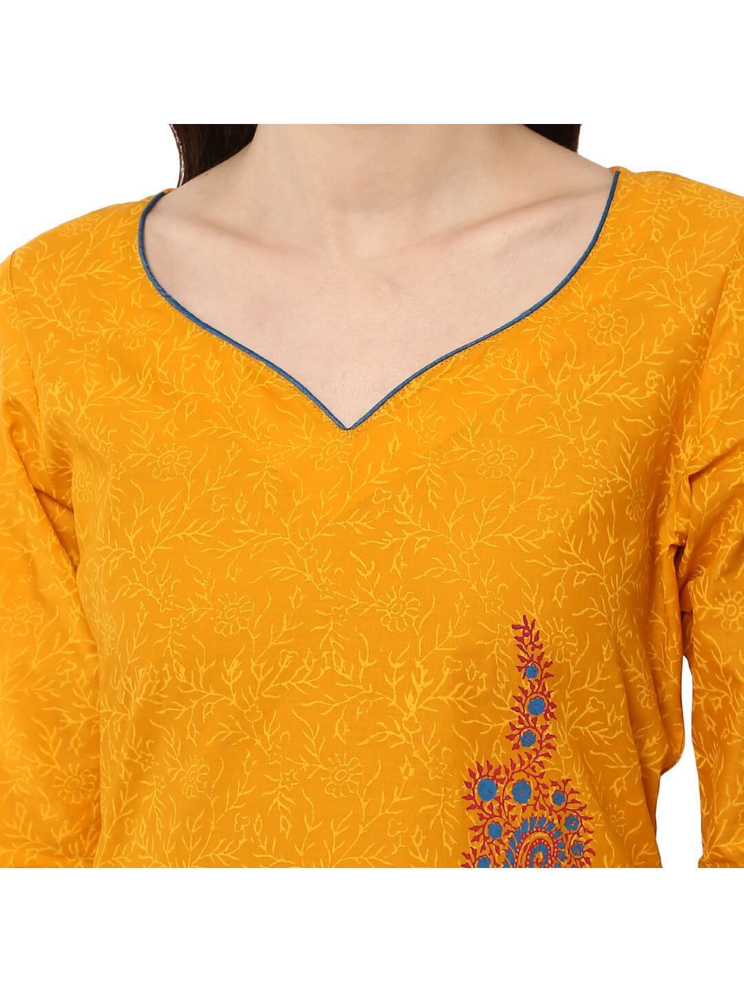 A Young And Modern Mustard Cotton Kurta Featuring A Statement Neckline, Three-Fourth Sleeves, And A Straight Silhouette. It Has Further Been Enhanced By A Subtle Overall Floral Hand Block Print, Further Topped With Vibrant, Contrast Tribal And Paisley Block Print. Inspired By The Dancing Mustard Farms. "Inayat" Is A Mesmerizing Collection Of Refreshing Silhouettes To Entrust Your Style With A Surreal Charm."
