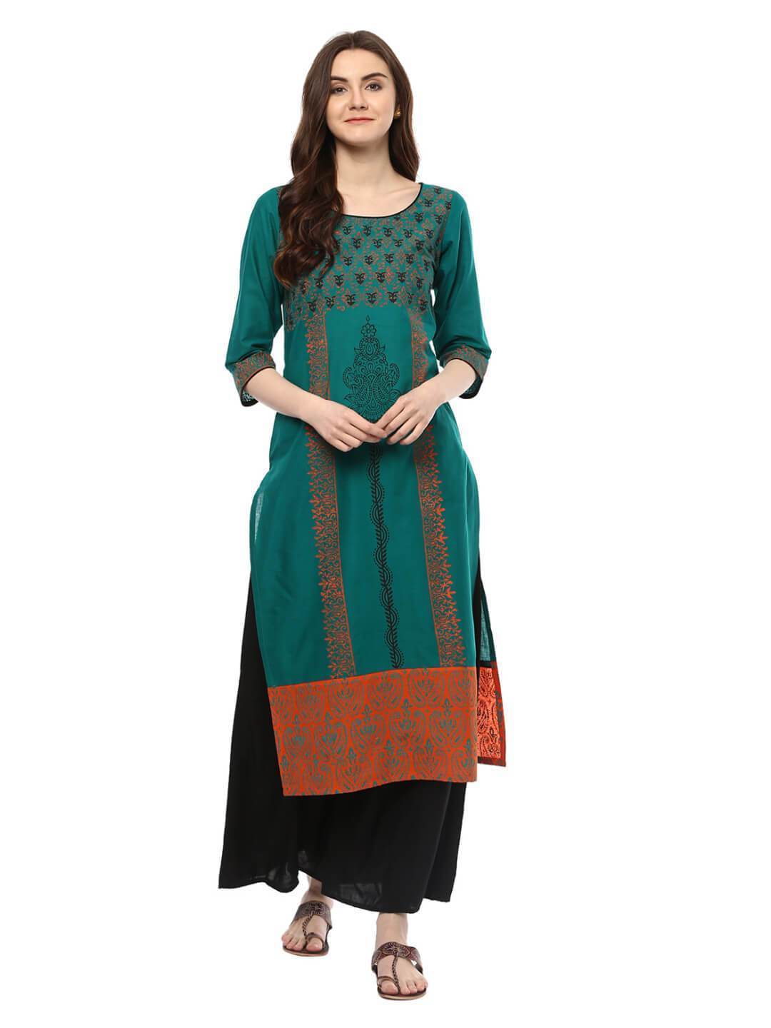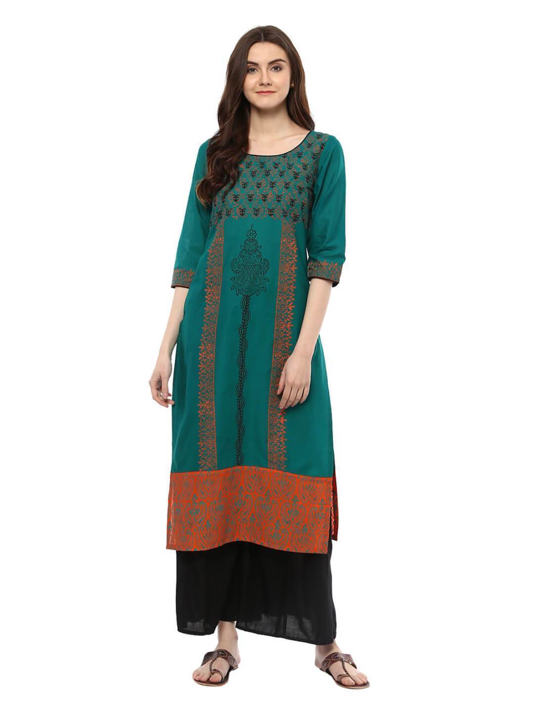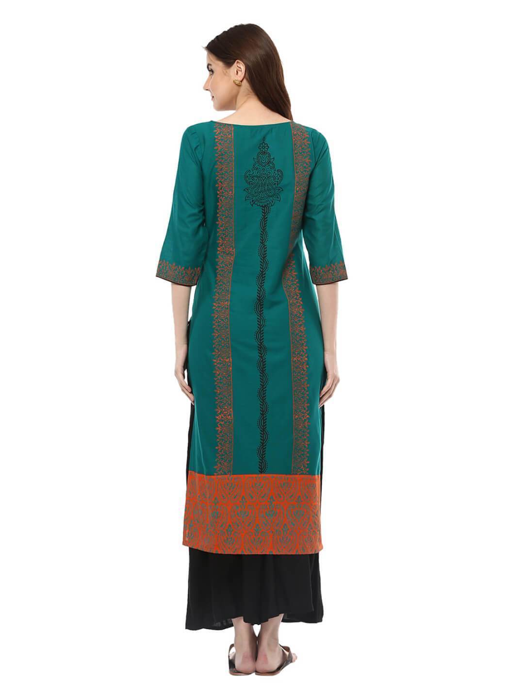 A Beautiful Peacock Blue Kurta, Featuring A Classic Round Neck, Three-Fourth Sleeves, And A Straight Silhouette. It Has Further Been Enhanced By Creatively Placed Vibrant And Contrast Hand-Blocked Floral Prints.