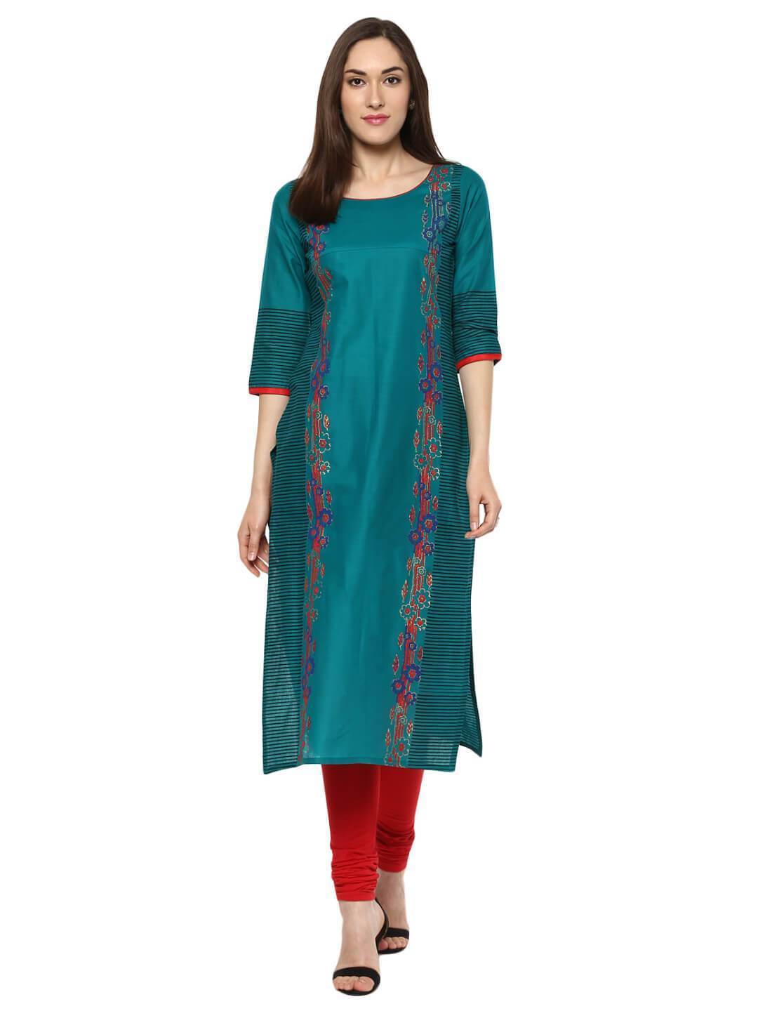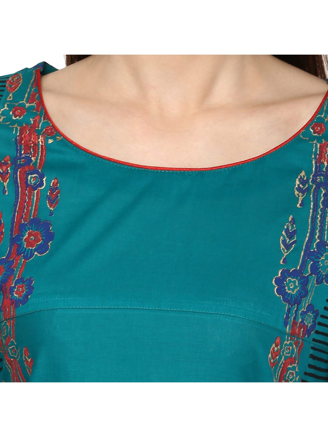 A Beautiful Peacock Blue Kurta, Featuring A Classic Round Neck, Three-Fourth Sleeves, And A Straight Silhouette. It Has Further Been Enhanced By Creatively Placed Vibrant And Contrast Hand-Blocked Floral Prints Topped With Geometric Line Designs.