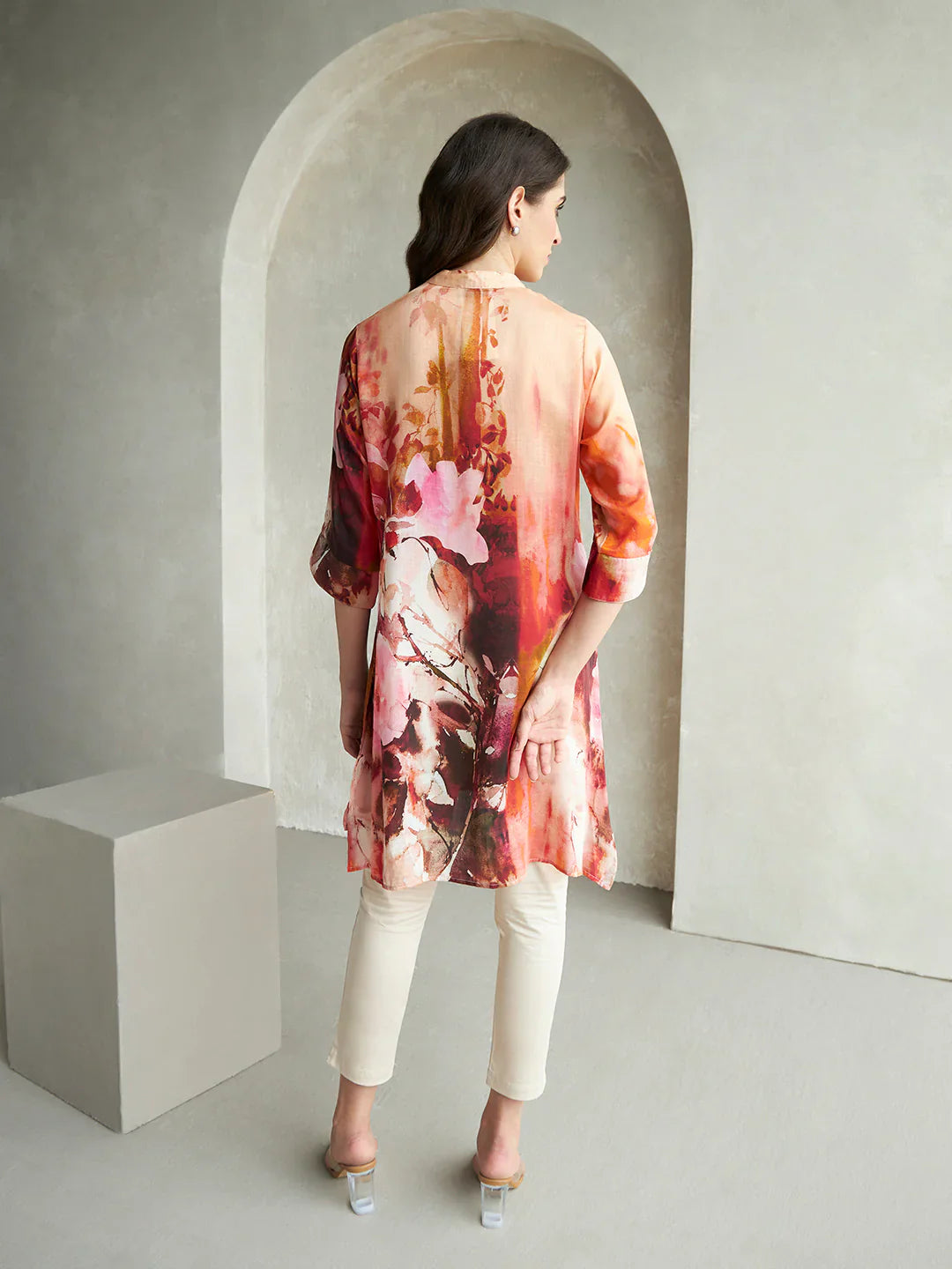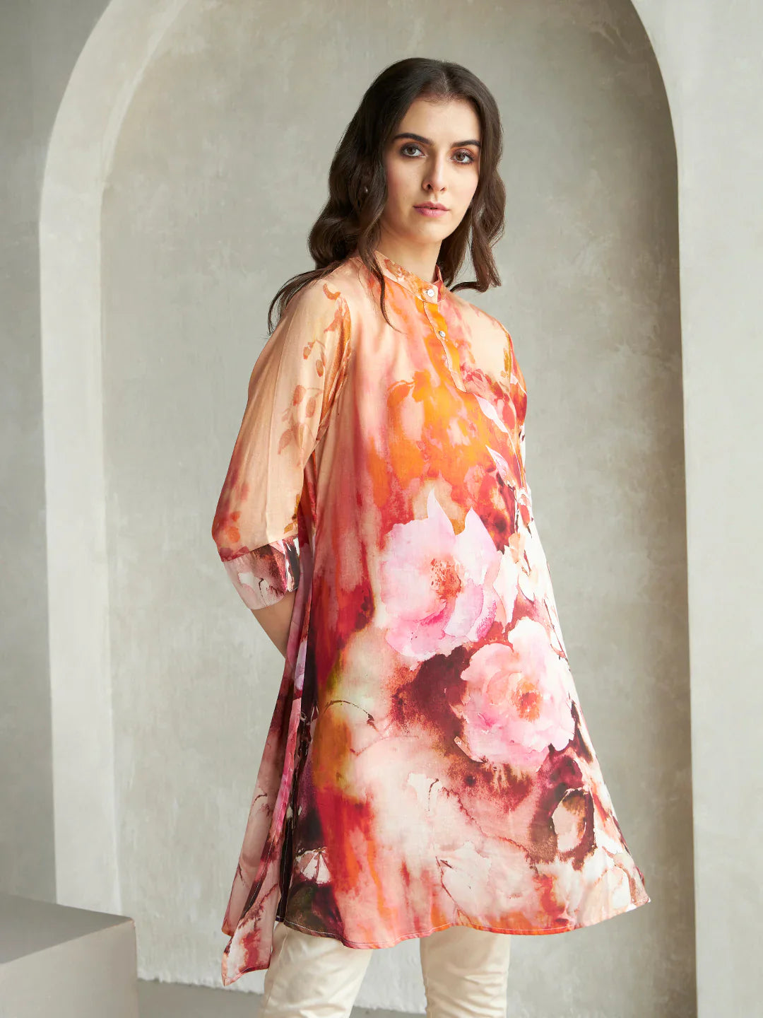 Top Details : Fabric :Rayon Color :Multicolor Work :Floral Printed Shape :Straight Neck Line :Mandrian Collar Length :42 Inch
